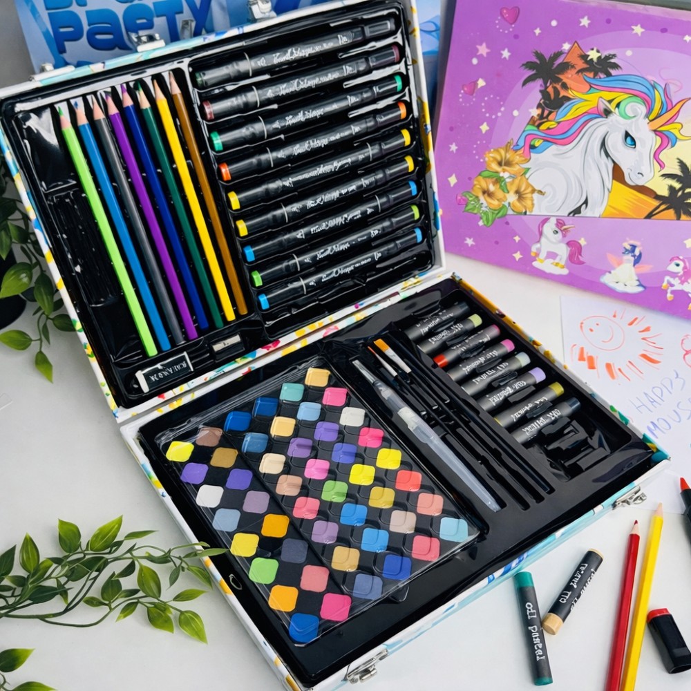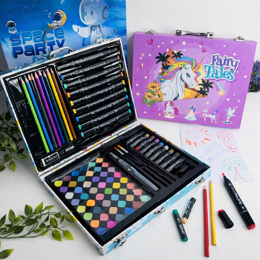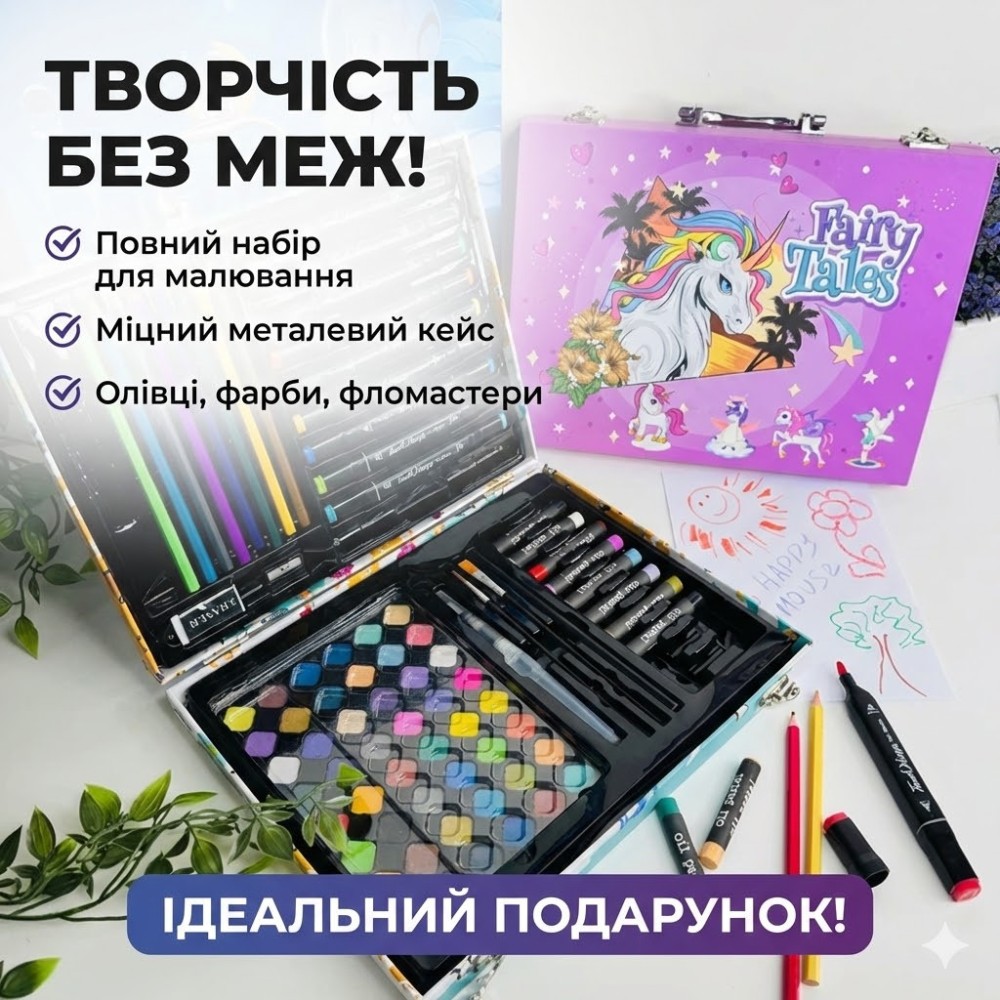 Опис → Художня металева валіза для малювання — це універсальний набір для творчості, який містить 85 предметів для малювання, розфарбовування та художнього розвитку. Комплект ідеально підходить для дітей, підлітків і художників-початківців, даючи змогу створювати малюнки в різних техніках удома, у школі або в дорозі. Міцний металевий кейс надійно захищає вміст, обладнаний зручною ручкою для перенесення та продуманою системою фіксації кожного елемента. Всі інструменти акуратно розкладені за відділеннями, що забезпечує лад і швидкий доступ до потрібних матеріалів. Набір сприяє розвитку уяви, дрібної моторики та творчого мислення, а також стане чудовим подарунком для дитини, захопленого малюванням і рукоділлям. Переваги → ✔ Повний художній набір із 85 предметів ✔ Міцна металева валіза з ручкою ✔ Усі інструменти зручно організовані в кейсі ✔ Підходить для дітей і художників-початківців ✔ Розвиває творчість, фантазію та моторику ✔ Чудовий варіант подарунка Характеристики → Тип: Художній набір для малювання Кількість предметів: 85 Матеріал кейса: Метал Призначення: Дитяча творчість, навчання малювання Вік: Для дітей і підлітків Формат зберігання: Валіза з фіксованими відділеннями Переноска: Вбудована ручка Комплектація → Кольорові олівці Фломастери/ маркери Краски Кисти Палітра Гумка, стругачка Металева валіза для зберігання