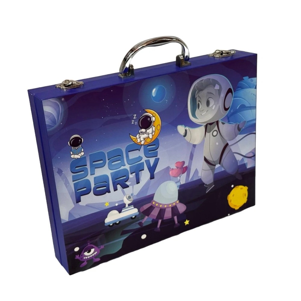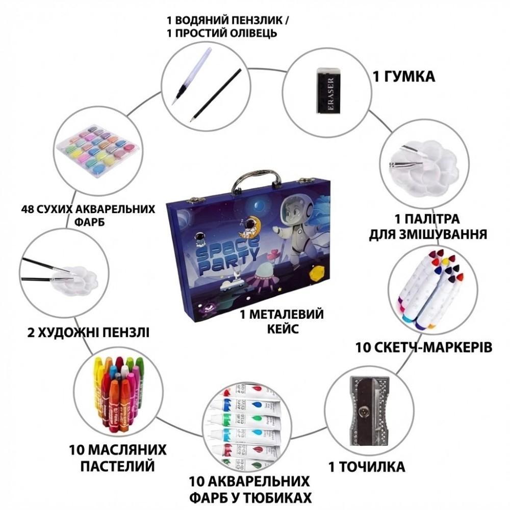 Опис → Художній набір-валіза Space Painting Color Kit with Suitcase — це повноцінний і зручний комплект інструментів для творчості та малювання, зібраний у практичному переносному кейсі-валіза. До набору входять різноманітні художні предмети: кольорові олівці, фломастери, воскова крейда, акварельні фарби, пастель і пензлі, що дає змогу дитині освоювати різні техніки та втілювати творчі ідеї. Металева валіза з міцною ручкою забезпечує надійне зберігання всіх елементів і зручне перенесення. Усі предмети акуратно розміщені в організованих відділеннях, що допомагає підтримувати лад і швидко знаходити потрібний інструмент. Цей художній набір стане чудовим подарунком для дітей, сприяє розвитку фантазії, творчого мислення та моторики, а також ідеально підходить для використання вдома, у школі або на творчих заняттях. Переваги → ✔ Багата комплектація для малювання і творчості ✔ Різноманітність матеріалів: олівці, фарби, маркери ✔ Міцний кейс-валіза з ручкою для перенесення ✔ Зручна система зберігання всього приладдя ✔ Чудовий подарунок для художників-початківців Характеристики → Тип: художній набір для малювання Формат зберігання: кейс-валіза Матеріал корпусу: металевий/пластиковий кейс Комплектація олівці, фломастери, фарби, пастель, пензлі та ін. Кількість предметів: 85 Призначення: творчість, навчання малювання Вік: від 3-4 років і старше Переноска: зручна ручка Комплектація → Кольорові олівці Фломастери/маркерні ручки Пастель, крейда Набір акварельних фарб Пензлі для малювання Палітра Гумка, стругачка Відсіки та комірки всередині кейса