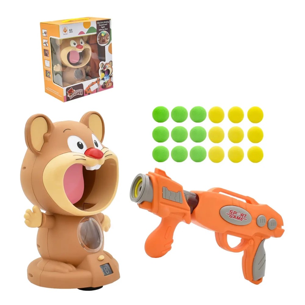 Інтерактивна гра повітряний тир Hamster With Gunner Пістолет із м'ячиками та мішень Хом'як з дисплеєм рахунку Інтерактивна гра «Позадушний тир Hamster with gunner» — це захопливий ігровий набір, призначений для дітей від 3 років. Комплект містить кумедний «Хом'яка»-мішень з аккосто-оптичною системою, яка фіксує потрапляння, а також пістолет-бластер із безпечними кулями-кульками. Діти можуть змагатися один з одним, стріляючи по мішені та заробляючи окуляри, які зображаються на дисплеї. Яскравий дизайн і різні режими гри зроблять проведення часу веселим і цікавим, розвиваючи координацію рухів і влучність. Переваги: Розвиває влучність і координацію рухів. Безпечні кулі-кульки. Акусто-оптична система для точного підрахунку влучань. Яскравий і привабливий дизайн, що підходить для дітей. Різні режими гри для захопливих змагань. Безпечна конструкція, зручна для дітей. Характеристики: Вікова групавід 3 років Матеріал: ABS пластик Живлення: Батарейки AA (1,5 В) — 3 шт. (не входять до комплекту) Особливості: Зі світловими та звуковими ефектами Колір: Коричневий Комплектація: Іграшка «Хом'як» Пістолет-бластер Кульки (18 шт.) Паковання