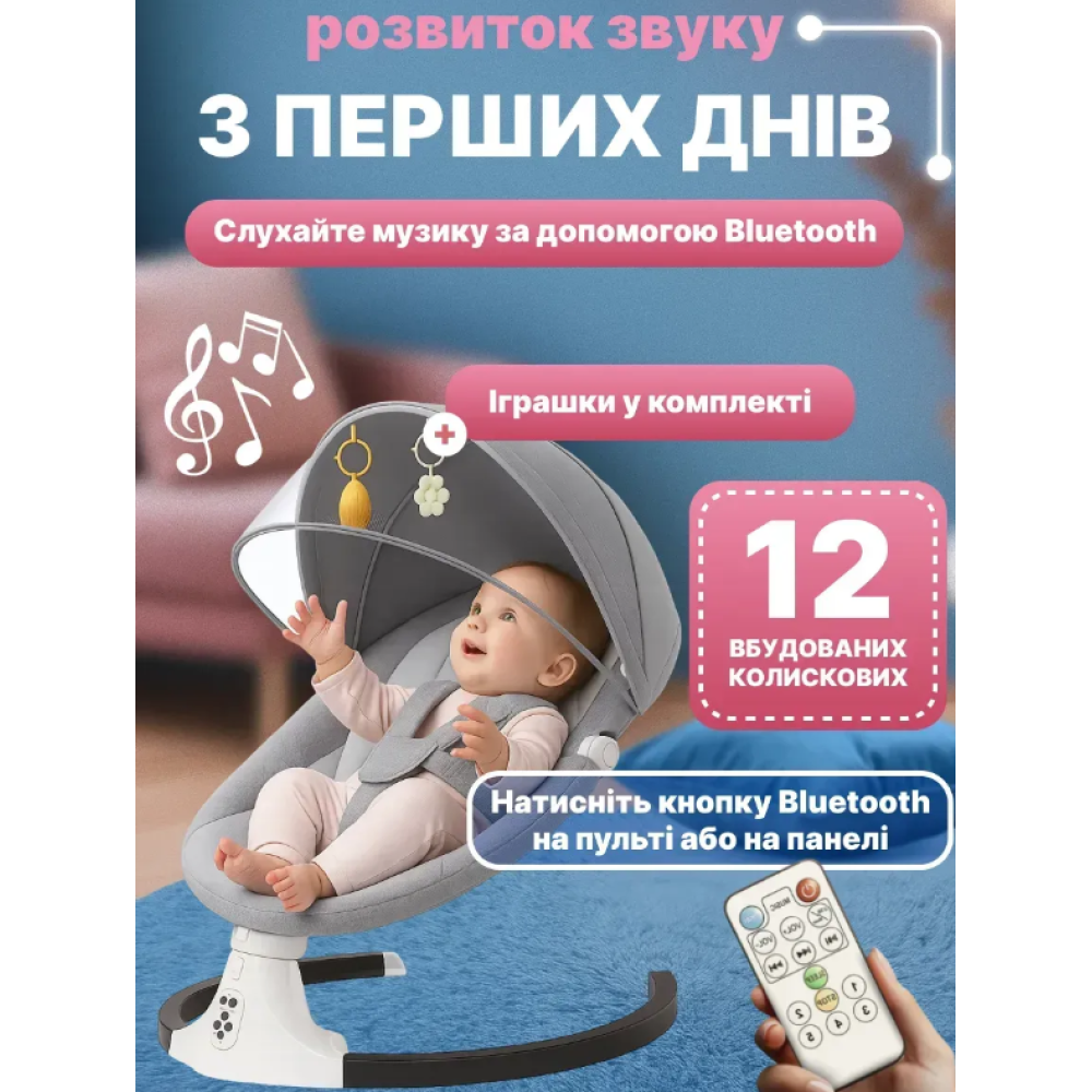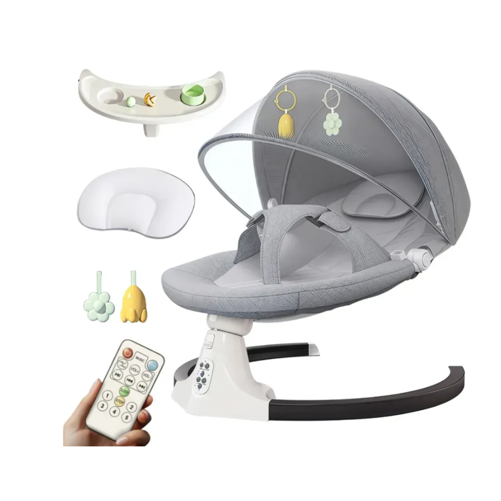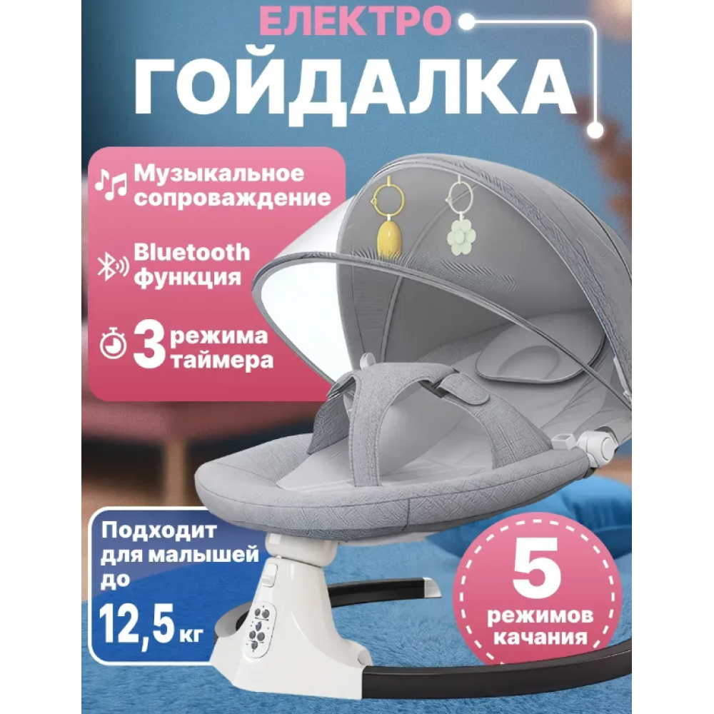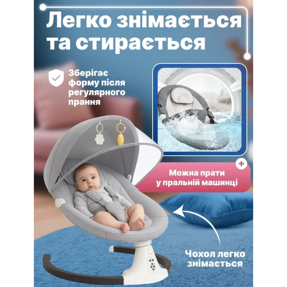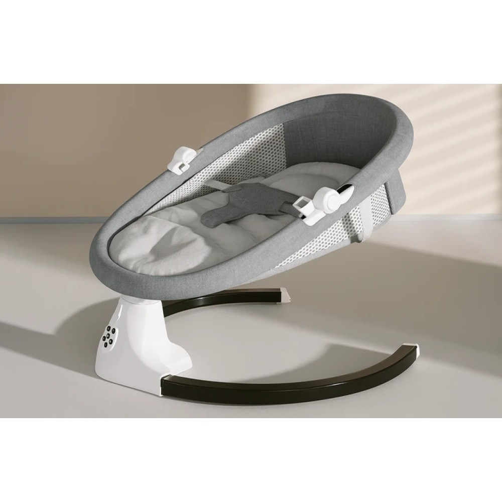 Дитяча колиска-гойдалка. Крісло-гойдалка створює комфортне та безпечне місце для відпочинку малюка з перших днів життя. Оснащене електромеханічним гойданням, яке допомагає швидко заспокоїти дитину, а також м'яким сидінням з трирівневим регулюванням нахилу спинки. Прозора москітна сітка захищає від комах і створює усамітнену атмосферу сну. Знімний капюшон забезпечує тінь і затишок, а підвісні іграшки розважають малюка. Зручна панель керування дозволяє вибирати режими гойдання та мелодії. Крісло-гойдалка легко збирається, має стійку округлу базу і сучасний мінімалістичний дизайн, який підійде до будь-якого інтер'єру. Характеристики: