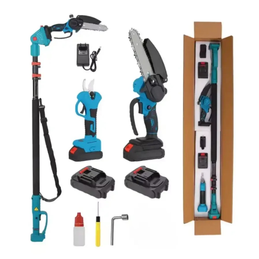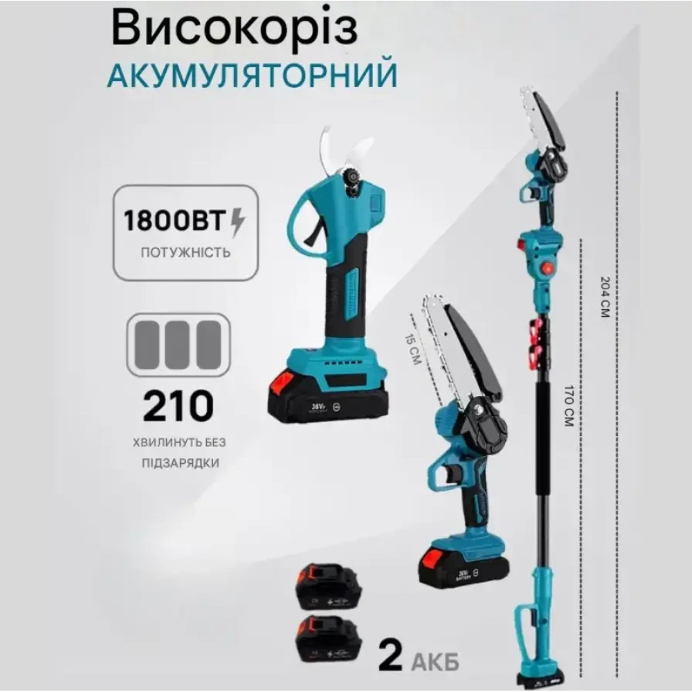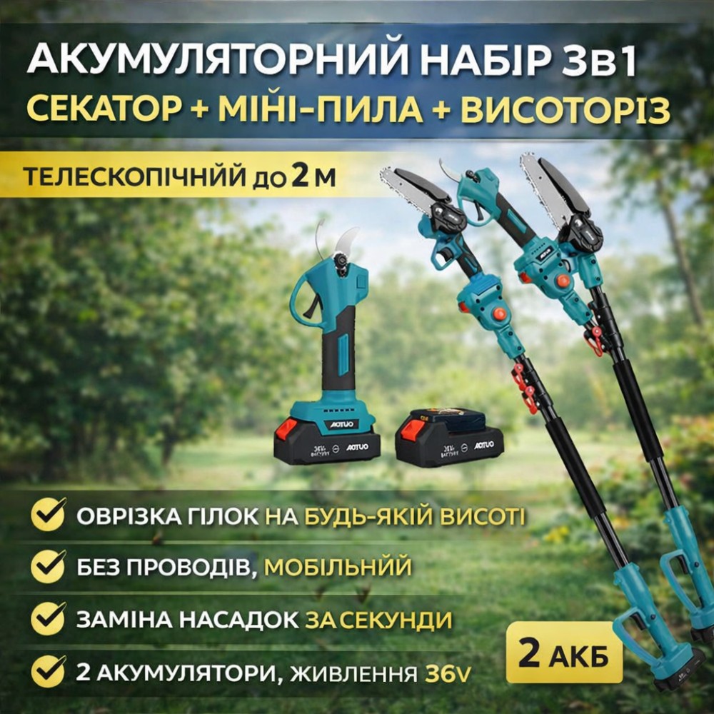 Опис Акумуляторний набір 3в1 AUTOO — універсальне рішення для догляду за садом, деревами та кущами. У комплект входять три корисні інструменти: акумуляторний секатор, міні-пила та телескопічний висоторіз. Такий набір дозволяє виконувати широкий спектр робіт швидко, зручно та без зайвих зусиль. Акумуляторний секатор легко справляється з обрізанням гілок, значно пришвидшуючи сезонні роботи в саду. Міні-пила підходить для розпилювання товстіших гілок, заготовки деревини та обрізки сухостою. Телескопічний висоторіз допомагає безпечно працювати на висоті без використання драбини. Інструмент працює від акумуляторів 36V, що забезпечує мобільність та свободу рухів без дротів. Ергономічна конструкція, невелика вага та зручні рукоятки роблять роботу комфортною навіть під час тривалого використання. Набір стане чудовим вибором для власників приватних будинків, дач, садівників та професійного догляду за зеленими насадженнями. Переваги 3 інструменти в одному наборі Акумуляторна робота без проводів Телескопічна штанга до 2 метрів Зручне обрізання високих гілок без драбини Потужний секатор для швидкої роботи Міні-пила для товстих гілок та деревини Ергономічний та легкий дизайн Економія часу та сил у садових роботах Характеристики Бренд: AUTOO Тип: акумуляторний садовий набір 3в1 Інструменти: секатор, міні-пила, висоторіз Живлення: акумулятор Напруга: 36V Кількість акумуляторів: 2 шт Телескопічна штанга: до 2 м Призначення: обрізка гілок, догляд за деревами, кущами, садові роботи Колір: бірюзовий / чорний Стан: новий Комплектація Акумуляторний секатор Міні-пила Телескопічний висоторіз 2 акумулятори Зарядний пристрій Набір ключів / аксесуарів Інструкція Заводська упаковка