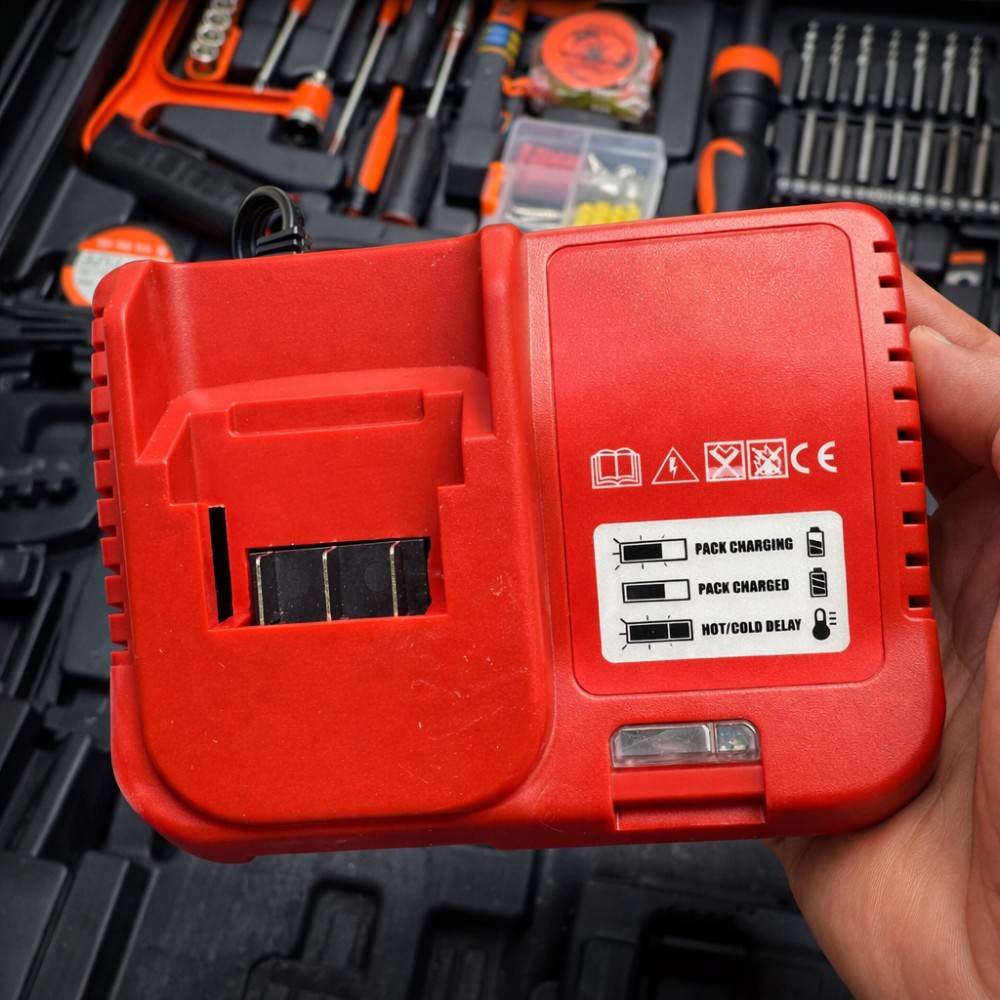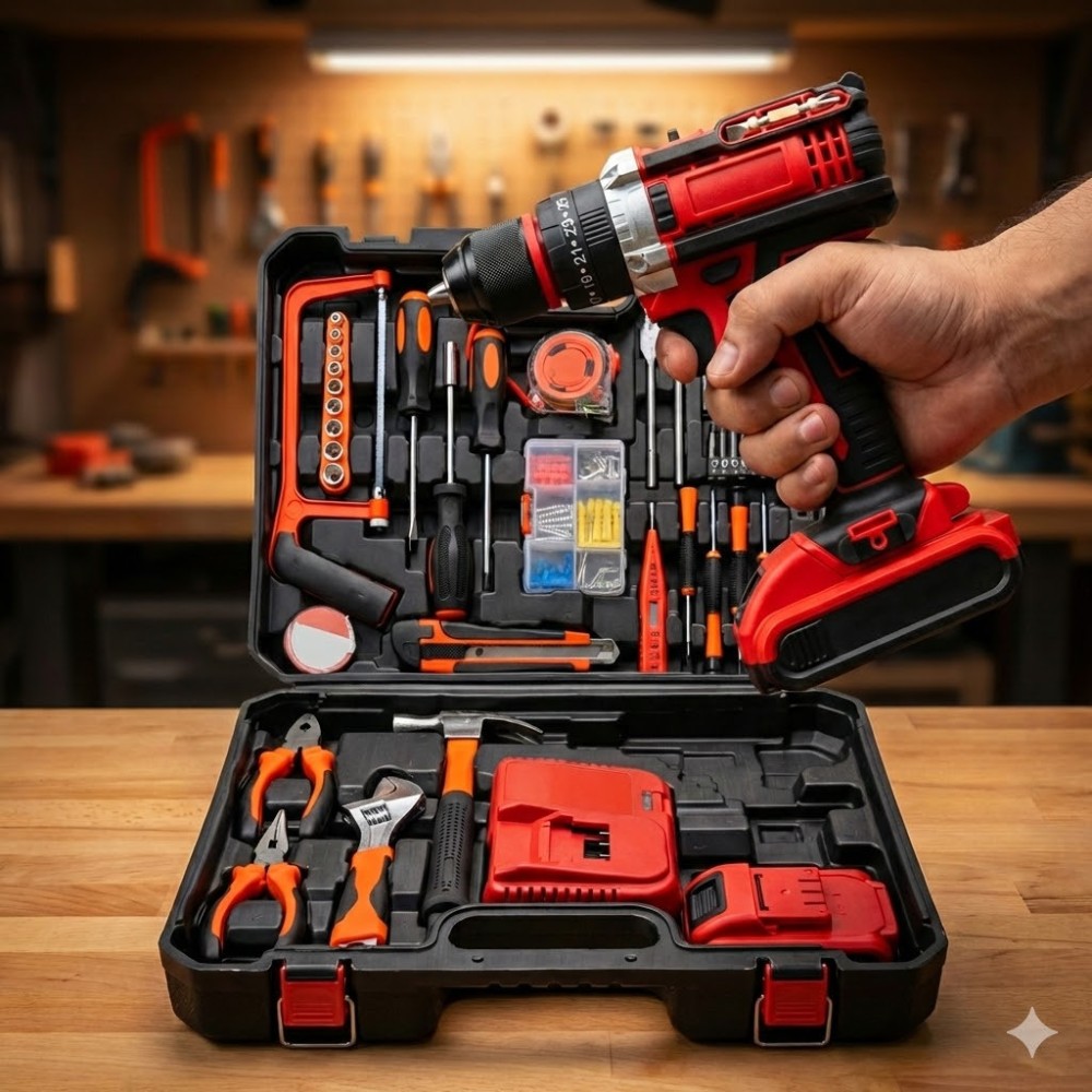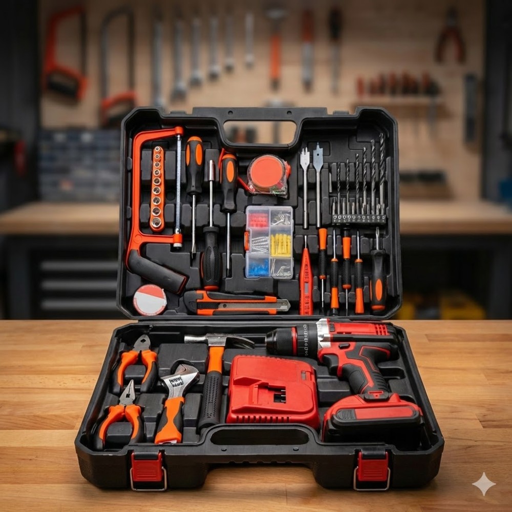 Опис Багатофункціональний ремонтний комплект, що об'єднує потужний акумуляторний шурупокрут і великий набір ручного інструменту з 118 предметів. Ідеальне рішення для комплексного виконання монтажних, слюсарних і будівельних завдань без потреби купівлі окремої оснастки. Шурупокрут обладнаний надійним двигуном і живиться від акумулятора 48V, забезпечуючи високу продуктивність під час свердління та роботи з кріпленням. Весь інвентар компактно розміщений в ударостійкому пластиковому кейсі, де кожна деталь має своє посадкове місце, що гарантує лад і зручність транспортування. Цей набір закриває 99% потреб домашнього майстра та професіонала під час виїзних робіт. Переваги Максимальна комплектація 118-в-1: Готове рішення «все увімкнене» — від електроінструменту до дрібної оснастки. Потужний шурупокрут 48V: Забезпечує високий крутний момент для роботи з різними матеріалами. Два акумулятори в комплекті: Дає змогу працювати без простоїв: поки один використовується, другий заряджається. Зручність зберігання Ергономічний кейс із міцного пластику з надійними замками. Широкий спектр робіт: Підходить для збирання меблів, ремонту техніки, монтажу конструкцій і свердління отворів. Якісні матеріали: Інструменти виготовлені з міцної сталі, стійкої до зношування. LED-підсвітка: Вбудоване освітлення робочої зони для точності в темних місцях. Характеристики Тип: Акумуляторний шурупокрут із набором інструментів Кількість предметів: 118 шт. Живлення: Акумулятор Li-Ion Напруга: 48 В Тип патрона: Швидкозатискний Діаметр патрона: 10 мм Регулювання крутного моменту: Є Реверс: Є Паковання: Пластиковий кейс Комплектація Акумуляторний шурупокрут Акумуляторні батареї (2 шт.) Зарядний пристрій Молоток-цвяшник Розвідний ключ Плоскогубці та довгогубці Набір викруток (хрестові, шліцьові) Набір свердел (метал, дерево, бетон) Набір біт Торцеві головки Ножівка Ізострічка Рулетка Пробник напруги Набір кріплення (дюбелі, саморізи) Пластиковий кейс