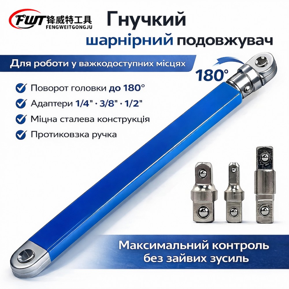 Гнучкий шарнірний подовжувач призначений для роботи з кріпленням у важкодоступних місцях, де неможливо використовувати звичайний вороток або тріскачку. Конструкція з поворотною головкою до 180° дає змогу передавати крутний момент під кутом, полегшуючи роботу в моторному відсіку, під панелями та в обмеженому просторі. Корпус подовжувача виготовлений з металу, а ручка має прогумоване протиковзне покриття, що забезпечує надійне захоплення й контроль під час роботи. Головка обладнана шарнірним механізмом, який зберігає стійкість під час навантаження й дає змогу точно спрямовувати зусилля. До комплекту входять змінні адаптери під різні розміри квадратів, що робить інструмент сумісним із більшістю тріскачок, воротків і торцевих головок. Подовжувач підходить для ремонту автомобілів, мотоциклів, побутової техніки та інших монтажних робіт. Інструмент призначений для ручного використання і підходить як для професійних майстрів, так і для домашнього застосування. Характеристики: Тип: гнучкий подовжувач/сульнірний ключ Конструкція: поворотна головка до 180° Сумісні розміри: 1/4|, 3/8|, 1/2| Матеріал: метал Колодка: прогумована, протиковзна Призначення: робота з кріпленням у важкодоступних місцях Комплектація Гнучкий шарнірний подовжувач Адаптери під квадрати 1/4|, 3/8|, 1/2|