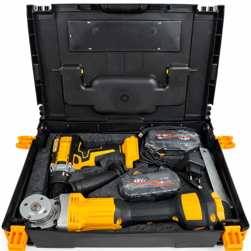 Опис Набір акумуляторного інструменту 2 в 1 Jitpex — це універсальне рішення для будівельних, монтажних і побутових робіт. До комплекту входить акумуляторний шурупокрут і кутова шліфмашина (болгарка), що працюють від загальної акумуляторної системи 48V, що забезпечує зручність і мобільність без прив'язки до мережі. Інструменти підходять для свердління, закручування кріплення, різання та шліфування різних матеріалів. Ергономічна конструкція, прогумовані елементи корпусу та збалансована вага забезпечують комфортну роботу навіть у разі тривалого використання. Набір постачається в міцному пластиковому кейсі, зручному для зберігання та транспортування. Переваги Універсальний набір 2 в 1 для різних завдань Акумуляторна система 48V Мобільність і автономна робота Ергономічна форма інструментів Прогумований держак для надійного хвату Швидка зміна акумулятора Підходить для дому, дачі та майстерні Зручний пластиковий кейс зберігання Характеристики Тип: набір акумуляторного інструменту Кількість інструментів: 2 Інструменти в наборі: шурупокрут, кутова шліфувальна машина Тип живлення: акумулятор Напруга акумулятора: 48V Тип акумулятора: Li-Ion Колір: жовтий/чорний Конструкція: ручна Зберігання: пластиковий кейс Комплектація Акумуляторний шурупокрут — 1 шт. Кутова шліфмашина (болгарка) — 1 шт. Акумулятор 48V — 2 шт. Зарядний пристрій — 1 шт. Бічна ручка — 1 шт. Пластиковий кейс — 1 шт.