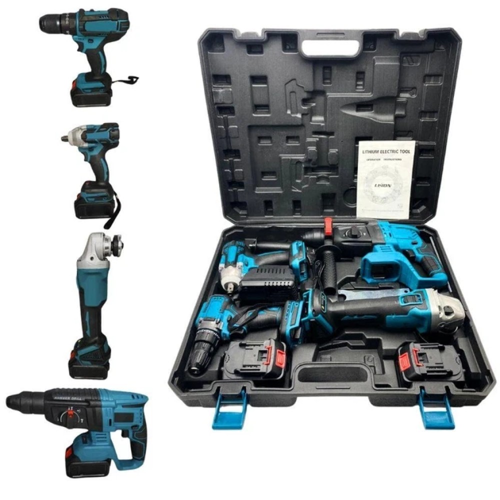 Набір 4 в 1 Шурупокрут Гайковерт Перфоратор Болгарка Це напівпрофесійний комплект електроінструментів, який містить гайковерт, дриль-шурупокрут, перфоратор і кутову шліфувальну шину. Усі інструменти виготовлені з якісних матеріалів і мають високу продуктивність. Гайковерт: Ємність акумулятора — 48V Кількість швидкостей — 2 Максимальна кількість обертів — 3500 об/хв Крутний момент — 280 Нм Напруга акумулятора — 18V Тип акумулятора — Li-ion Дриль-шурупокрут: Ємність акумулятора — 48V Кількість швидкостей — 3 Напруга акумулятора — 18V Режими — свердління/загвинчування Максимальна кількість обертів — 2800 об/хв Тип акумулятора — Li-ion Перфоратор: Напруга акумулятора — 48V Ємність акумулятора — 5000 mAh Тип патрона — SDS-Plus Максимальна кількість обертів — 1200 об/хв Режими — свердління/свердління з ударом/довбання Кількість ударів — 4000 уд./хв Максимальна енергія удару — 1.9Дж Максимальний діаметр отвору в сталі — 13 мм Максимальний діаметр отвору в бетоні — 20 мм Максимальний діаметр отвору в дереві — 26 мм Тип акумулятора — Li-ion КШМ (болгарка): Напруга акумулятора — 48V Ємність акумулятора — 5000 mAh Кріплення шліфлиста — затискач Тип ручки — двопозиційна Максимальний діаметр диска — 125 мм Максимальна кількість обертів — 8500 об/хв Посадковий розмір — 22 Шпиндель — М14 Тип акумулятора — Li-ion Комплектація КШМ (болгарка) 125 мм з регулюванням швидкостей (безщіткова); Перфоратор (безщітковий); Гайковерт із підсвічуванням робочої зони регулюванням обертів (безшкетковий); Шурупокрут із підсвічуванням робочої зони та з регулюванням обертів; Акумуляторні батареї — 4 шт./48V; Прогумована ручка для КШМ; Захисний кожух для КШМ; Ключ для КШМ; Прогумована ручка для перфоратора; Док-станція для заряджання АКБ.