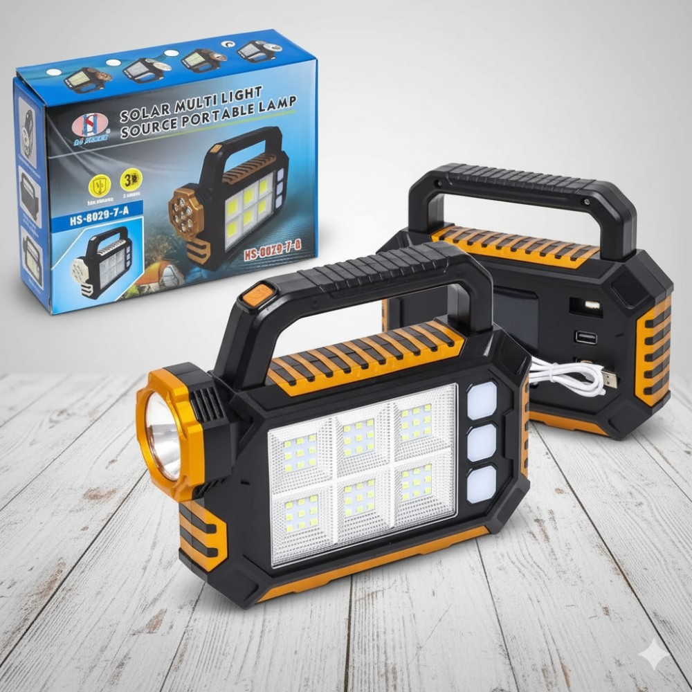 Ліхтар ручний на сонячній батареї з бічною панеллю LED-лампа 3 режими освітлення HS-8029-1-A Ручний акумуляторний Ліхтар — призначений для автономного джерела світла у квартирі, на дачі, на вулиці, у кемпінгу без електроенергії від загальної мережі. Світлодіодний ліхтар має великий радіус освітлення. Є ручка для транспортування пристрою. Універсальна у використанні. Є захист від перезарядження або розряду акумулятора. Цей освітлювальний пристрій виготовлений із міцного пластику, а протиударний корпус стійкий до експлуатації. Характеристики Ліхтар ручний на сонячній батареї Бічна LED-лампа з 54 діодами. 2 режими освітлення збоку. Спереду ліхтарик. Можливість заряджання через USB або від сонячної батареї Розмір 15х20,5х5,5 см