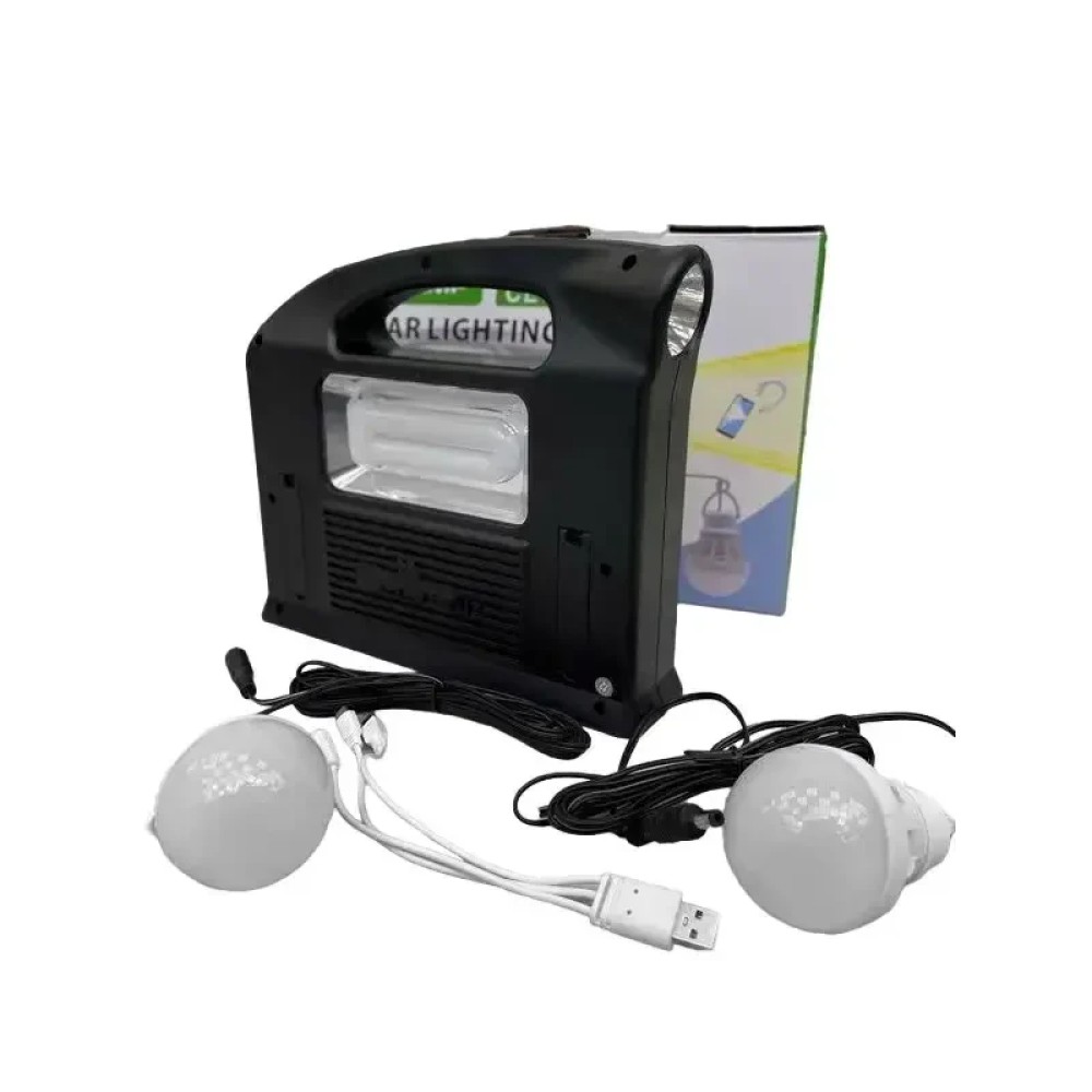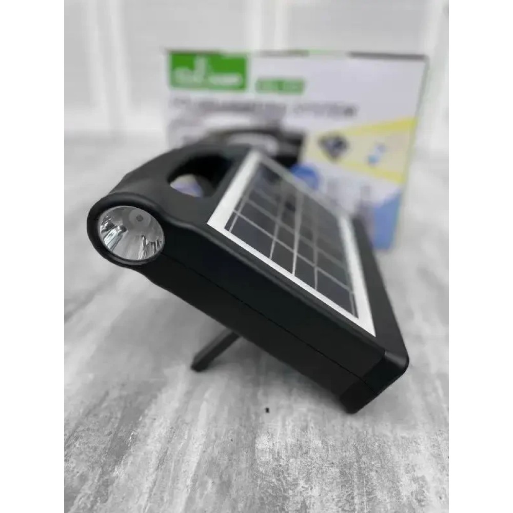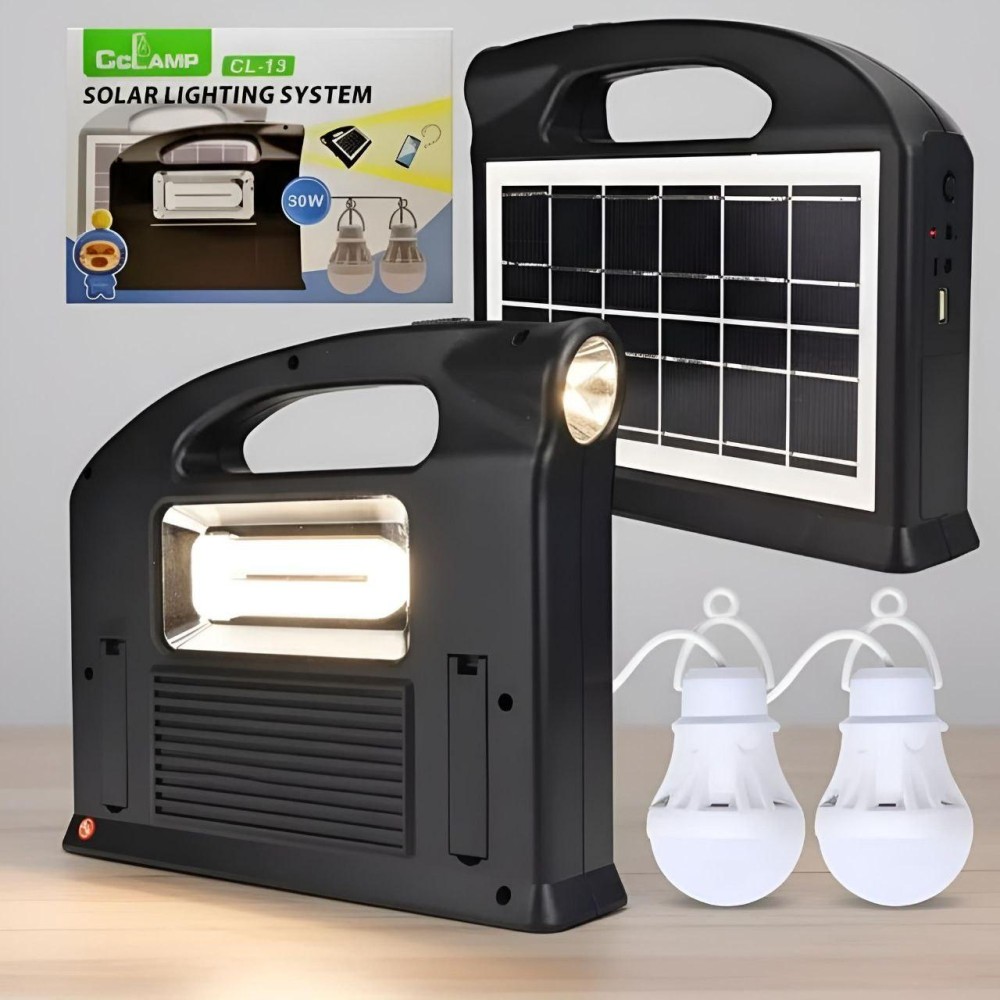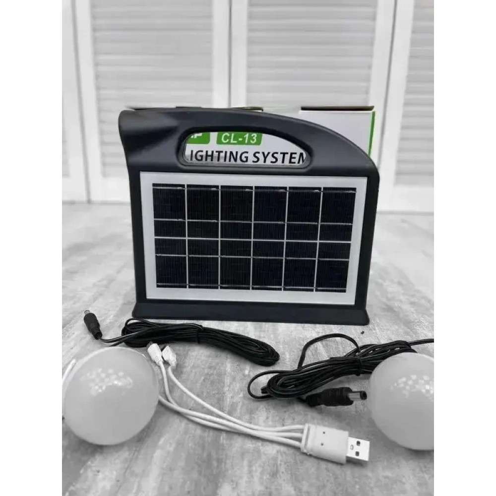 Портативна зарядна станція Cclamp CL-13 із сонячною панеллю на 2 лампочки з ліхтарем і Power Bank Сонячна зарядна станція Cclamp CL-13 — багатофункціональний ліхтар із сонячною панеллю та лампочками, призначений для освітлення в умовах відсутності електроенергії. LED-ліхтар-прожектор із сонячною панеллю та двома лампочками стануть безпечною й екологічною альтернативою свічок, коли немає подавання живлення в електромережі, а також на природі далеко від цивілізації. За допомогою універсального USB-кабелю можна зарядити мобільний телефон, щоб залишатися на зв'язку. Характеристики: Тип: портативний ліхтар/ автономний ліхтар Матеріал: АБС + ПК Колір корпусі: чорний Потужність: 30 Вт Живлення: літієва батарея, що перезаряджається Об'єм акумулятора: 4500 мА·год Сонячна панель потужністю 2 Вт Час роботи: 8-20 годин Час заряджання: 8-15 годин Комплектація Акумуляторний ліхтар Cclamp CL-13 2 лампочки Комплект дротів для заряджання смартфонів Паковання