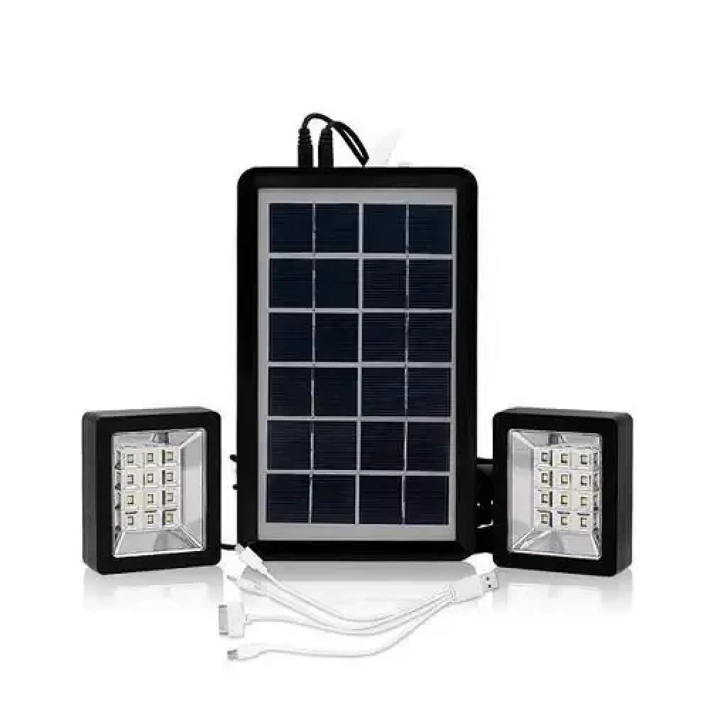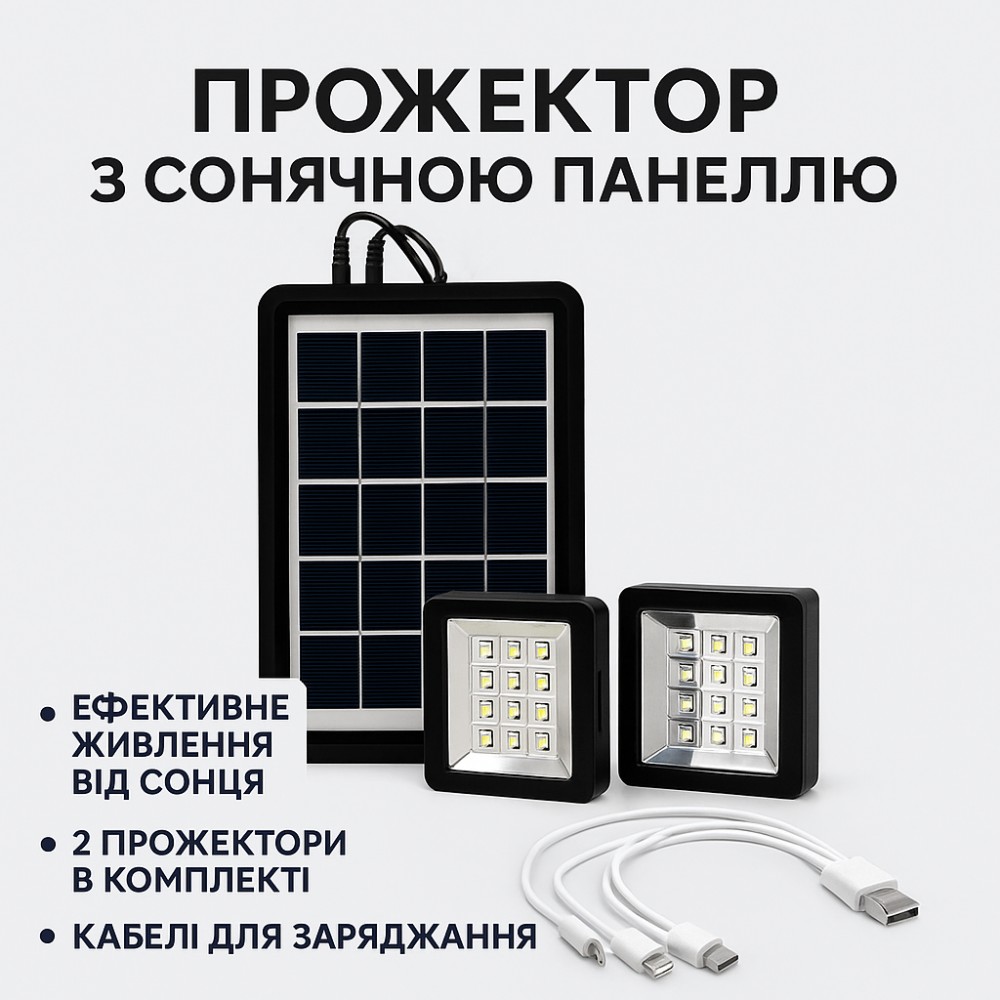 Прожектор із сонячною панеллю та 2 лампами 6v3w EP-05 Лампа прожектор із сонячною панеллю 6v3w EP-05 — зручні у використанні, оскільки працюють без живлення електромережі 220V, що неабияк спрощує їх розміщення практично в будь-якому місці. Все, що від вас потрібно — це закріпити світильник там, де вам потрібно, за допомогою шурупів, більше жодних дротів. Переваги: Не потребує батарей і підзаряджання — працює від сонячного світла; Зручний і простий монтаж; Немає потреби під'єднання до електромережі 220V; Стильний зовнішній вигляд; Водонепроникний міцний корпус. Характеристики: Тип: лампа-прожектор; Тип ламп: COB; Матеріал корпусу: пластик; Джерело живлення: сонячна батарея; Джерело світла: COB; Колір світіння: білий; Сонячна панель: 6V 3W; Водонепроникний рівень: IP66; Керування: світлом + датчик руху; Витримує температуру: від -25 °C до +75 °C; Термін роботи: приблизно 50000 h. Комплектація Лампа прожектор EP-05 (2 шт.) Сонячна панель 6v3w Інструкція Паковання