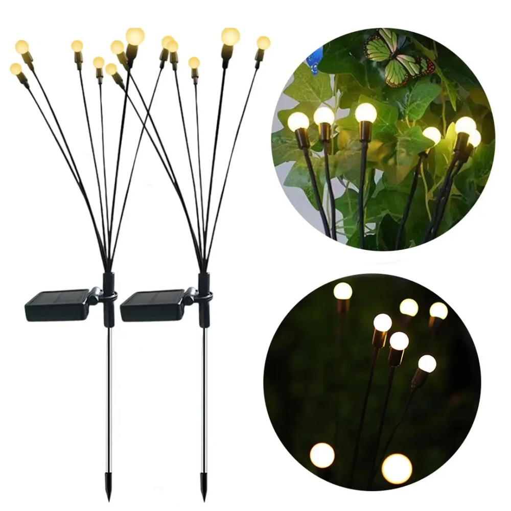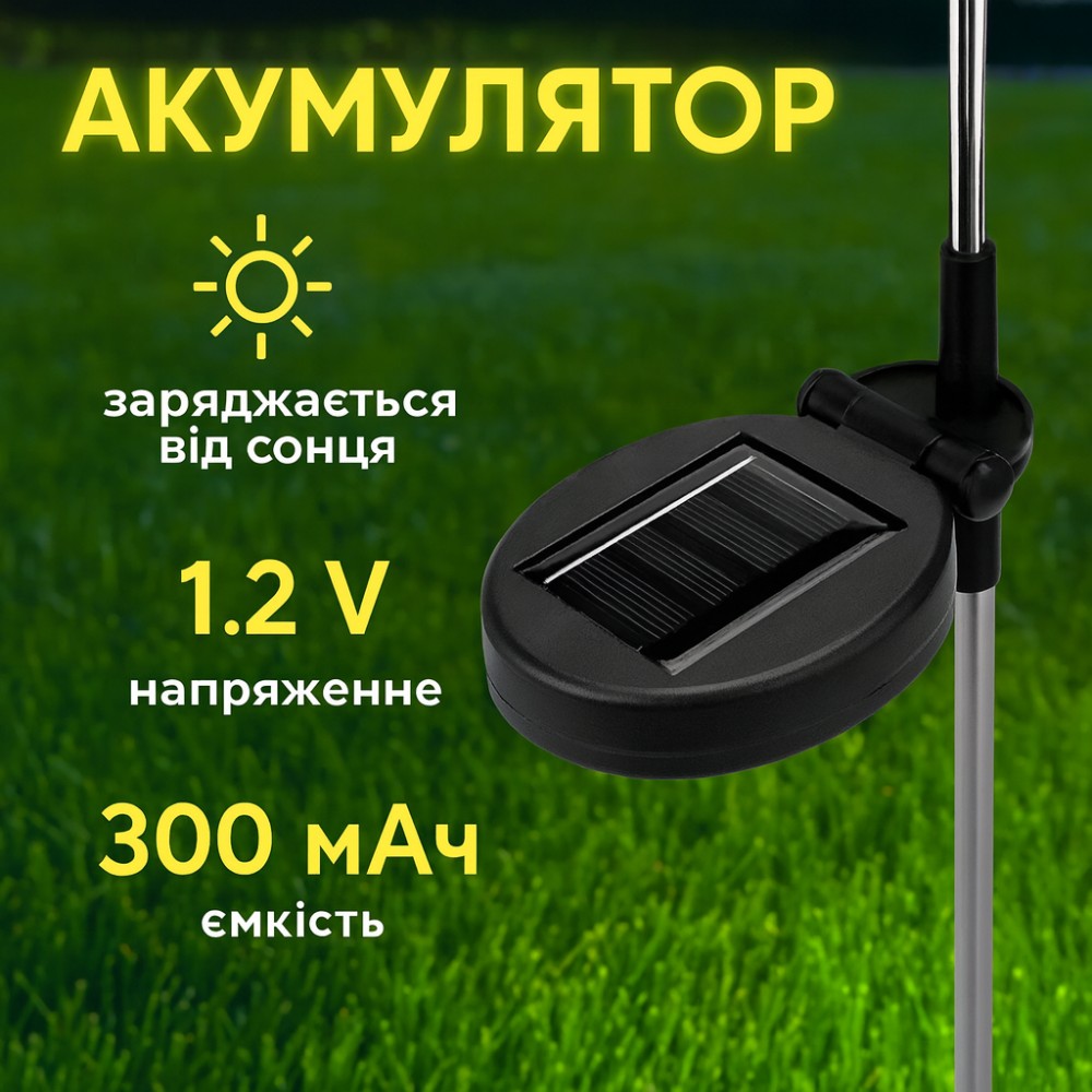 Опис Садові ліхтарі на сонячній батареї «Світлячки» — це декоративне вуличне освітлення для саду, доріжок і клумб, яке створює затишну атмосферу без під'єднання до електромережі. Ліхтарі автоматично вмикаються з настанням темряви та м'яко підсвічують ділянку, імітуючи ефект світних вогників. Ключові переваги Працюють від сонячної енергії без дротів і розеток Автоматичне увімкнення в темну пору доби Декоративний ефект «світлячків» для саду та двору Просте встановлення без інструментів Підходять для доріжок, газонів, клумб і ландшафтного дизайну Економія електроенергії й екологічність Технічні характеристики Тип товару — садовий вуличний ліхтар Джерело світла — світлодіоди Кількість світлодіодів — 6 шт. на кожен ліхтар Джерело живлення — сонячна батарея Акумулятор — 600 mAh Час роботи — до 8-10 годин після повного заряджання Висота ліхтаря — 70 см Ступінь захисту — IP44 Матеріал корпусу — пластик Призначення — декоративне вуличне освітлення Встановлення — у ґрунт Кількість у комплекті — 2 шт. Комплектація Садовий ліхтар на сонячній батареї — 2 шт. Заводське паковання
