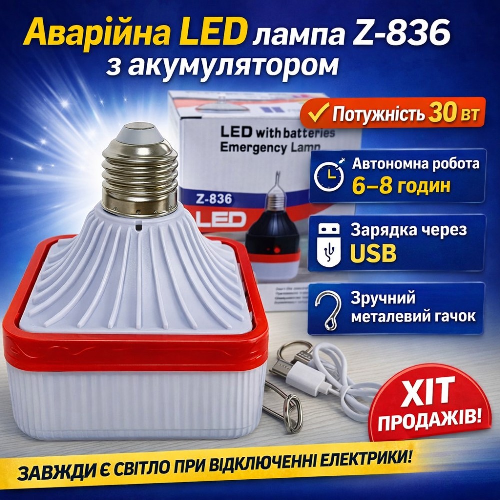 2️⃣ Опис Світлодіодна аварійна лампа Z-836 призначена для аварійного та резервного освітлення під час вимкнень електроенергії, а також для використання в побуті, на дачі або в дорозі. Лампа обладнана вбудованим акумулятором і працює від мережі AC/DC, може заряджатися від розетки або через USB-порт. Конструкція з металевим гачком дає змогу чіпляти лампу, а світлодіодне джерело забезпечує рівномірне освітлення. Передбачений захист від перезаряджання та кнопка вмикання/вимикання. 3️⃣ Переваги Вбудований акумулятор з автономною роботою до 6-8 годин Робота від мережі AC/DC і можливість заряджання через USB-порт Світлодіодне джерело світла з рівномірним освітленням Металевий гачок для підвішування Кнопка увімкнення/вимкнення на корпусі Застосування в будинку, підвалі, гаражі, на дачі, у разі кемпінгу та в дорозі 4️⃣ Характеристики Тип вироби: світлодіодна аварійна лампа Модель: Z-836 Тип лампи: LED Тип: лампа з вбудованим акумулятором Живлення: AC / DC Напруга живлення: AC 85–265 В, 50/60 Гц Потужність: 30 Вт Час автономної роботи: 6-8 годин Заряджання: від мережі або через USB-порт Захист: від перезарядження Елементи керування: кнопка вмикання/вимикання Додатково: металевий гачок для підвішування