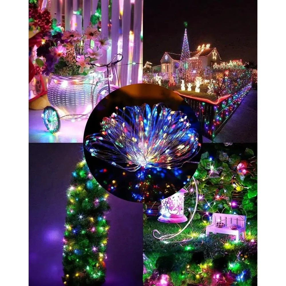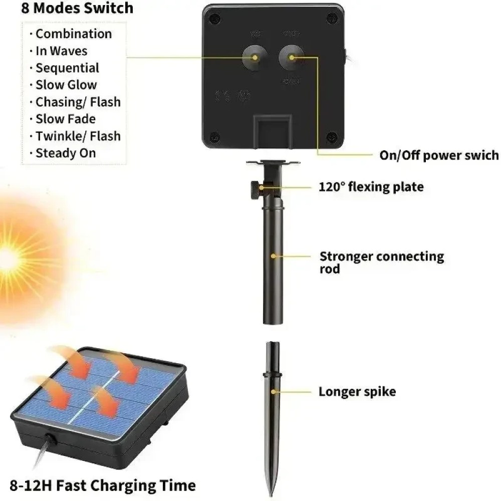 Вулична гірлянда із сонячною панеллю Крапля роси SFK-15 Світлодіодні гірлянди з RGB-підсвіткою 10 м 100LED Гірлянда «Крапля Роси» SFK-15 RGB — це стильне й економне рішення для святкового освітлення, що працює від сонячної енергії. Довжина 10 метрів і 100 світлодіодних лампочок на тонкому мідному дроті дають змогу створювати вишуканий світловий декор для будь-яких цілей — від прикрашання двору та вітрин до святкового оформлення інтер'єрів і ялинок. Завдяки сонячній панелі гірлянда заряджається впродовж дня й автоматично вмикається в сутінку, створюючи атмосферу затишку та казковості. Вона проста в установленні та має високий рівень захисту від сонячного впливу, що робить її ідеальною для тривалого використання на вулиці. Переваги: Автономне живлення: працює від сонячної енергії, заряджається впродовж дня й автоматично вмикається вночі. Економність: не вимагає витрат на електроенергію, тому що використовує енергію сонця. Гнучкість: тонкий мідний дріт дає змогу створювати світлові візерунки будь-якої форми. Довговічність і вологозахист: матеріал гірлянди та сонячної панелі стійкий до зовнішніх впливів, що дає змогу використовувати її на вулиці. Універсальність: підходить для оформлення дворів, сцен, вітрин, а також новорічних ялинок і святкових інтер'єрів. Характеристики: Довжина гірлянди: 10 м Кількість LED-лампочок: 100 Тип освітлення: RGB (багатобарвна) Тип батареї: перезаряджуваний нікель-металгідридний акумулятор Розмір сонячної панелі: 6,5 см x 2,2 см x 6,5 см Матеріал панелі: ABS + поликремний Колір дроту: прозорий Час заряджання: 4-6 годин за достатнього сонячного світла