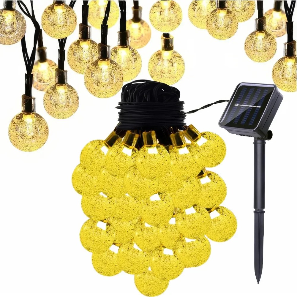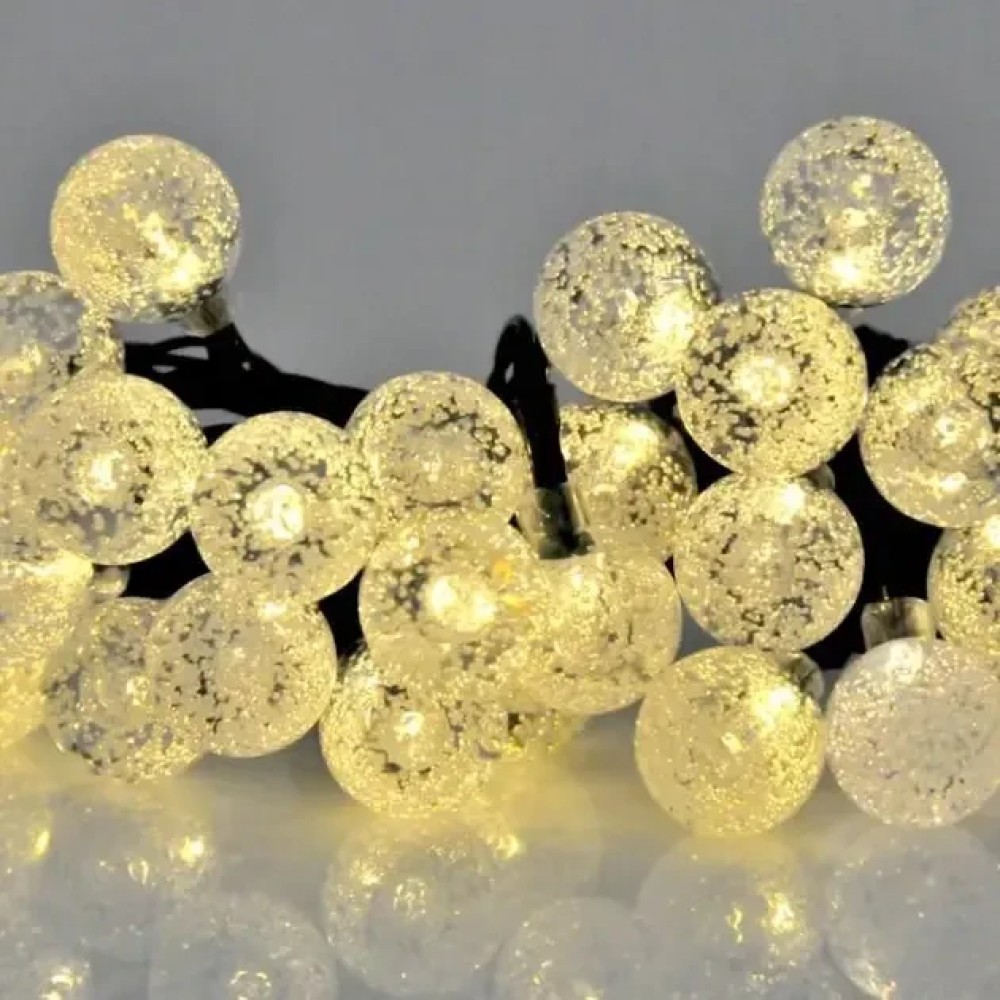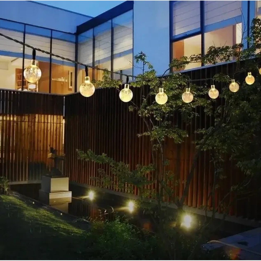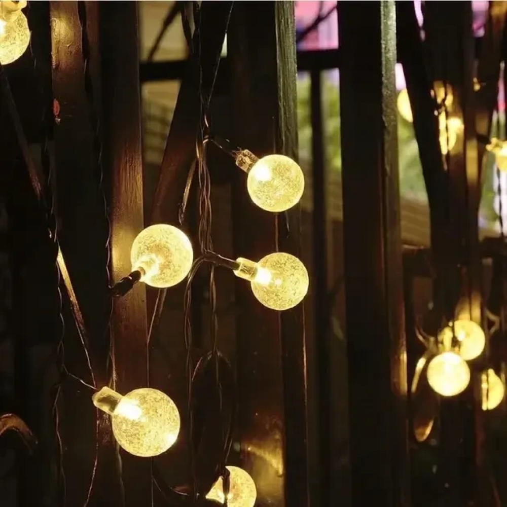 Вулична гірлянда із сонячною панеллю Сонячні кристалічні бульбашки SFK-17 Довжина 5 метрів 20 LED кульок Вулична гірлянда із сонячною панеллю "Сонячні кристалічні бульбашки SFK-17" — це ідеальне рішення для створення м'якого, затишного освітлення на садових доріжках, терасах або навколо архітектурних елементів просто неба. Завдяки 20 світлодіодних куль, що випромінюють тепле біле світло, і довжині 5 метрів, гірлянда чудово підкреслить атмосферу вашого саду або патіо. Особливості гірлянди, як-от 8 режимів освітлення, захист від води та пилу (IP44), а також вбудована сонячна панель із датчиком сутінку, роблять її практичним і стильним декоративним елементом, що підходить як для літніх, так і для зимових сезонів. Переваги: Автоматичне увімкнення: вбудований датчик сутінку містить освітлення з настанням темряви. Економне рішення: працює на сонячній енергії, не вимагає під'єднання до мережі. Багатофункціональність: ідеально підходить для освітлення доріжок, під'їзних шляхів, рослин і декоративних об'єктів саду. Вологозахищеність: ступінь захисту IP44 дає змогу використовувати гірлянду в будь-яку погоду. Тривалий термін експлуатації: розрахована на 10 000 годин роботи, що забезпечує довговічність використання. Характеристики: Матеріал: пластик Колір світіння: теплий білий (2700K) Кількість світлодіодів: 20 Довжина гірлянди: 5 метрів Режими освітлення8 режимів Ступінь захисту: IP44 Час роботи від заряду: до 6 годин (у разі сонячного заряджання впродовж дня) Тип сонячної панелі: аморфна Вбудована батарея: так, з можливістю заряджання Додаткові функції: механічний вимикач ON/OFF, вбудований датчик сутінку