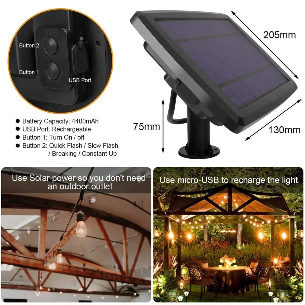 Декоративна гірлянда із сонячною панеллю Ретролампа SFK-13 Водонепроникні світлодіодні лампи-гірлянда Ця вулична гірлянда на сонячній енергії — стильне рішення для створення затишної атмосфери на вашій ділянці, у саду або на терасі. Підходить для цілорічного використання й не вимагає електрики: акумулятор заряджається від сонячного світла впродовж дня, автоматично вмикає світло у разі настання темряви. Завдяки чотирьом режимам освітлення (стабільна, швидка та повільна спалахи, пульсація), вона дає змогу настроїти ідеальне освітлення для будь-якого випадку — чи то романтична вечеря, літня вечірка, чи то новорічний декор. Переваги: Економне й екологічне освітлення: повністю працює на сонячній енергії, що знижує енерговитрати. Автоматична робота від заходу сонця до світанку: вмикається в темряві та вимикається на світанку. Простота встановлення та використання: легко монтується й не вимагає під'єднання до електромережі. Чотири режими освітлення: можливість вибору відповідного стилю підсвічування для різних подій. Водонепроникність IP65: стійка до впливу вологи та погодних умов, підходить для використання на вулиці. Характеристики: Довжина гірлянди: 5 м, 10 світлодіодних лампочок Колірна температура: 2700 К (тепле світло) Матеріал: пластик, кабелі з міцною гумовою оболонкою Тип живлення: сонячна енергія Потужність: ≤5 Вт Режими освітлення: стабільний, швидкий спалах, повільний спалах, пульсація Час роботи: до 8 годин на повному заряджанні Тип батареї: литий/LiFePO4 аккумулятор Час заряджання: 6 годин на сонці Рейтинг водонепроникності: IP65 Робоча напруга: 3-6 В