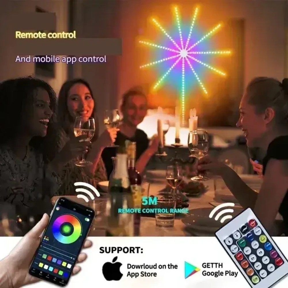 Настінна світлодіодна гірлянда Феєрверк з пультом і керуванням із телефона SFK-18 Bluetooth USB 1+0.5м LED-стрічка на стіну SFK-18 — це стильний і функціональний освітлювальний модуль, що складається з гнучкої основи з нанесеними на нього світлодіодами та резисторами. Стрічка підтримує керування через застосунок Bluetooth і постачається з багатофункціональним пультом дистанційного керування, даючи змогу настроювати світіння, вибирати світлові ефекти та регулювати яскравість. Більш 200 динамічних ефектів дають змогу створювати унікальні композиції, а світлодіодні стрічки різної довжини створюють ефект феєрверку, який особливо ефектно виглядає на стіні. Переваги: Різноманітність ефектів: стрічка пропонує понад 200 динамічних світлових ефектів, що дає змогу персоналізувати освітлення відповідно до ваших уподобань. Мультикерування: контролюйте світіння за допомогою пульта дистанційного керування, контролера на USB-кабелі або Bluetooth-застосунку, регулюючи яскравість і швидкість. Синхронізація з музикою: вбудований мікрофон дає змогу стрічці реагувати на музику, створюючи світлові пульсації в такт ритму. Доступно 3 музичні режими. Просте встановлення: гнучка конструкція стрічки полегшує її встановлення на стіну, даючи змогу швидко та зручно створити оригінальне освітлення. Характеристики: Тип: RGB LED-стрічка з ефектом феєрверку Потужність: 1,5 Вт на 1 м Вхідна напруга: 5 В Довжина стрічок10 шт. по 0,5 м, 1 шт. — 1 м Кількість світлодіодів: 156 (24 светодиода/м) Колір світіння: повноколірний RGB Кут променя: 120° Водонепроникність: немає, IP20 Вага: 200 г Комплектація LED-стрічка 0,5 м — 10 шт. LED-стрічка 1 м — 1 шт. Пульт дистанційного керування Контролер Паковання