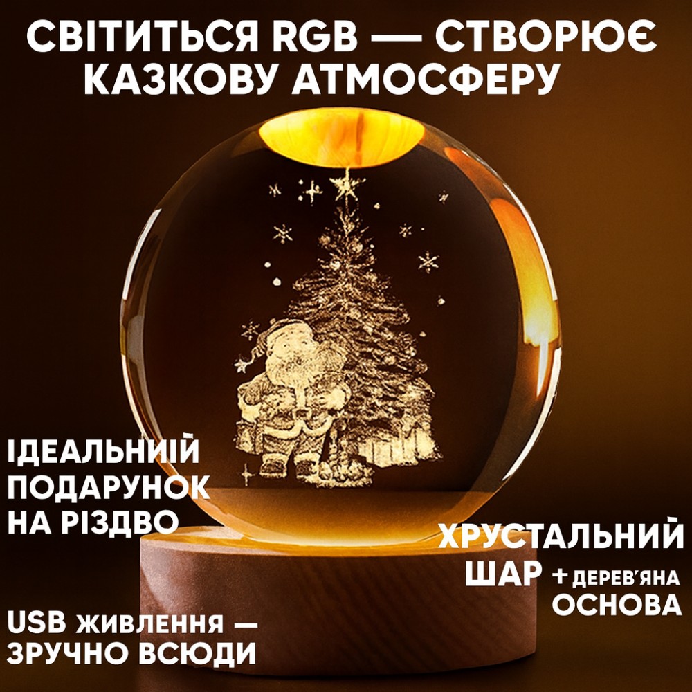 Опис: Нічник 3D кришталева куля «Різдво» з RGB-підсвіткою Створіть атмосферу чарівництва та затишку у вашому домі за допомогою унікального 3D нічника у формі кришталевої кулі. Цей вишуканий світильник із лазерним гравіюванням усередині створює тривимірну ілюзію, яка оживає під час увімкнення м'якої світлодіодної підсвітки. Ідеальне рішення для спальні, дитячої кімнати або як оригінальний подарунок до свят. Куля виготовлена з якісного прозорого скла, а підставка — з натурального дерева, що робить аксесуар стильним доповненням будь-якого інтер'єру. Підсвітка плавно змінює кольори (RGB), занурюючи кімнату в казкове сяйво. Ключові особливості та переваги: Магічний 3D-ефект: Завдяки лазерному гравіванню всередині кулі зображення має об'ємний та деталізований вигляд з усіх боків. Різнобарвна RGB-підсвітка: Світлодіоди плавно змінюють відтінки, створюючи розслаблювальну атмосферу та допомагаючи швидше заснути. Екологічні матеріали: Натуральна дерев'яна основа та міцне скло — безпечні для дітей і дорослих. Універсальне живлення: Працює від будь-якого USB-порту (ноутбук, повербанк, блок живлення телефона), що дає змогу поставити його де завгодно. Компактний і стильний: Не займає багато місця на тумбочці, але відразу привертає увагу. Ідеальний подарунок: Прекрасний презент на Новий рік, Різдво або день народження для близьких і колег. Технічні характеристики: Тип: 3D нічник/настільна лампа; Матеріал кулі: Стекло; Матеріал підставки: Натуральне дерево; Діаметр кулі: 6 см; Розмір підставки: 6 х 2 см; Джерело світла: LED (світлодіодний); Режим світіння: RGB (зміна кольорів); Живлення: USB-кабель (у комплекті); Довжина кабелю: ~95 см; Потужність: 1.5 Вт; Тематика: Різдво / Новий рік. Комплектація Кришталева куля з гравіюванням. Дерев'яна підставка з вбудованими світлодіодами. USB-кабель живлення.