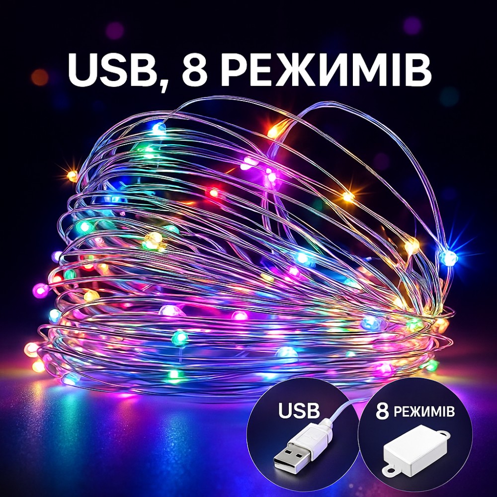 Світлодіодна гірлянда «Роса» завдовжки 20 м із 200 різнобарвними діодами створює яскравий святковий акцент в інтер'єрі. До комплекту входить пульт дистанційного керування, що дає змогу легко змінювати режими освітлення. Тонка дротяна нитка з мініатюрними вогниками легко формує написи, обвиває ялинку, поручні або віконний отвір. Завдяки мультиколірним світлодіодам гірлянда гарно переливається й підходить для Нового року, днів народження, весілля та декору фотозони. Гірлянда обладнана контролером із 8 динамічними режимами: миготіння, вогонь, плавні переливи та ін. Можна вибрати спокійне світіння або активну анімацію залежно від настрою. Живлення — від USB 5 В і мережі 220 В (через адаптер), тому легко під'єднати до блока живлення, павербанка, ноутбука або розетки. Клас захисту IP44 дає змогу використовувати гірлянду всередині приміщення й під навісом. Світлодіоди економно витрачають електроенергію Характеристики Тип освітлення: електрична гірлянда Тип: гірлянда-нитка «Роза» Зручний пульт дистанційного керування Форма лампочки: крапля Тип лампочки: світлодіодна Колір світіння: мультиколір (Multicolor) Довжина гірлянди (без шнура живлення): 20 м Довжина шнура живлення: 0,6 м Кількість лампочок: 200 шт. Відстань між лампочками: 10 см Діаметр дроту: ~0,5 мм, дріт Потужність: 2 Вт Контролер: є Режим роботи: динамічний, 8 режимів Можливість з'єднання гірлянд: немає Ступінь захисту: IP44 Внутрішнє застосування: так (можливо під навісом) Джерело живлення: USB 5 V (можливість роботи від мережі 220 В через адаптер) Особливості: З пультом ДК