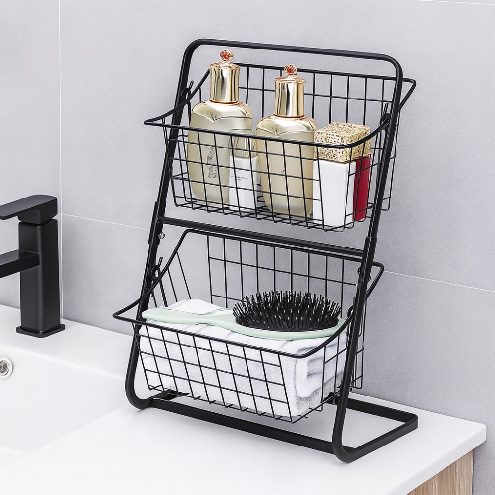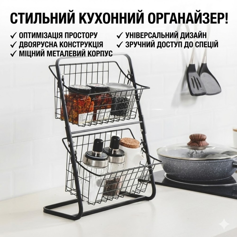 Описание Металлический органайзер Storage Rack — компактная двухъярусная полка для наведения порядка на кухне, в ванной или кладовке. На неё удобно ставить овощи, фрукты, соусы, банки со специями, бытовую химию или косметику, освобождая место на столешнице и в шкафах. Преимущества: два яруса — больше полезного пространства на той же площади; компактный размер 39×28×18 см — удобно ставить на стол, в шкаф или на полку; прочная металлическая конструкция, выдерживает хороший вес; воздухопроницаемый дизайн корзин — продукты не прют и хорошо проветриваются; универсальное применение: кухня, ванная, кладовка, рабочее место. Характеристики: тип: настольный/шкафный органайзер, двухъярусная полка; материал: металл; размеры: 39 × 28 × 18 см (Д×Ш×В); цвет: черный; назначение: хранение овощей, фруктов, специй, бытовой химии, косметики и мелочей по дому.