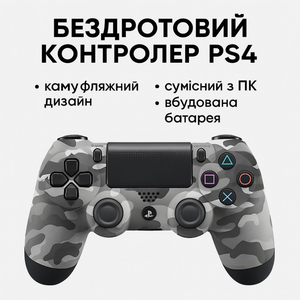 Описание товара Беспроводной геймпад P4 Wireless Controller для PS4 Беспроводной контроллер P4 — это современный и функциональный аналог классического геймпада для игровой консоли. Устройство сочетает в себе привычную эргономику, отзывчивое управление и все необходимые технологии для комфортного гейминга. Джойстик отлично лежит в руках благодаря матовому покрытию и обеспечивает полную свободу движений благодаря подключению по Bluetooth. Это отличное и экономное решение для замены старого устройства или покупки второго геймпада для игры с друзьями. Преимущества: Полная совместимость: стабильно работает со всеми версиями консоли (Fat, Slim, Pro), а также легко подключается к ПК и ноутбукам. Сенсорная панель: поддерживает управление жестами и касаниями, расширяя игровые возможности в современных тайтлах. Эффект погружения: встроенные вибромоторы обеспечивают реалистичную тактильную отдачу, а динамик дополняет звуковую картину. Световая панель (Light Bar): меняет цвет в зависимости от происходящего на экране, помогая отслеживать статус персонажа. Кнопка Share: позволяет мгновенно записывать игровые моменты или запускать стримы одним нажатием без прерывания игры. Автономность: встроенный аккумулятор обеспечивает длительное время активной игры без подзарядки. Удобство общения: стандартный разъем 3.5 мм позволяет подключать гарнитуру прямо к джойстику. Технические характеристики: Тип: Беспроводной геймпад Совместимость: PS4, PC, Mac Интерфейс подключения: Bluetooth, USB Радиус действия: до 10 метров Питание: Встроенный аккумулятор Функции: Вибрация, гироскоп, сенсорная панель, подсветка Разъемы: microUSB, 3.5 мм jack (для наушников), порт расширения Материал корпуса: Ударопрочный пластик Цвет: Хаки камуфляж Комплектация: беспроводной геймпад кабель для зарядки microUSB инструкция заводская упаковка
