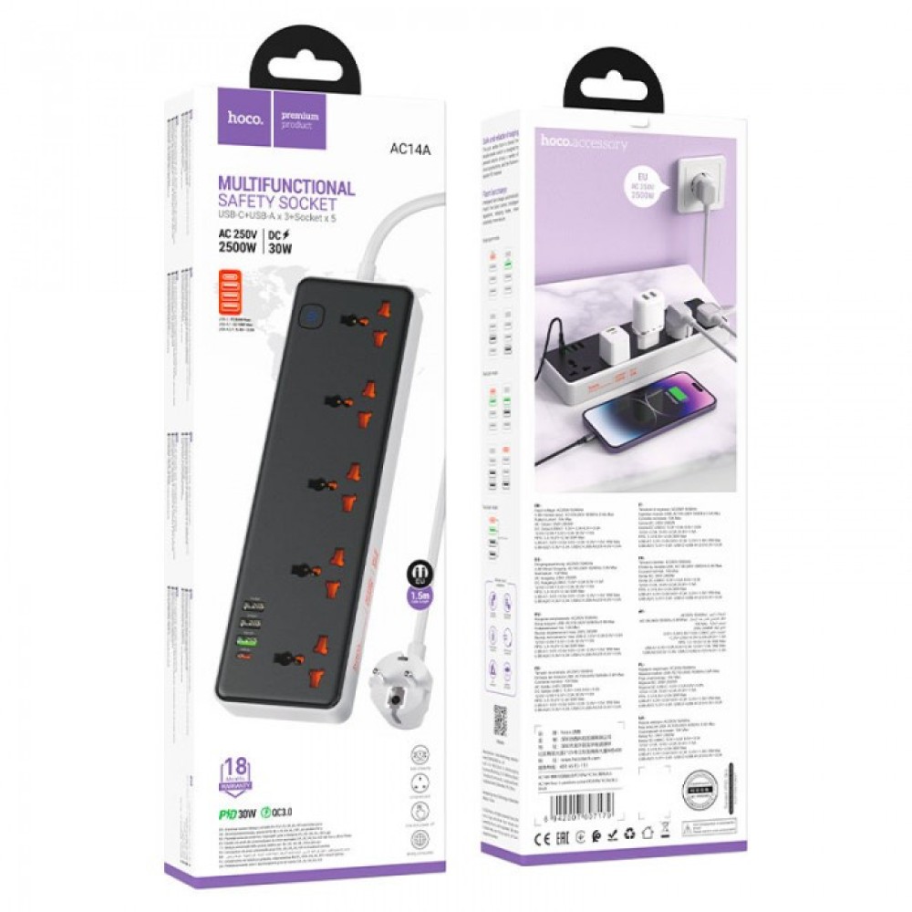 Hoco Rico AC14A – это функциональный сетевой удлинитель с пятью розетками европейского стандарта и четырьмя зарядными портами (3 USB-A и 1 Type-C) с поддержкой технологий быстрой зарядки PD и QC. Благодаря продуманному дизайну и качественным материалам, устройство станет надежным решением для дома, офиса или поездок.