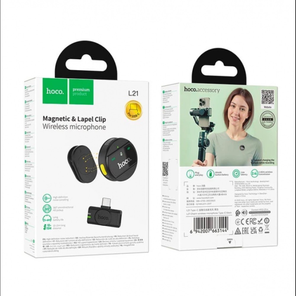 HOCO Type-C Charm Wireless Microphone L21 — это универсальный беспроводной петличный микрофон для смартфонов и планшетов с разъемом Type-C. Он оснащен всенаправленным электретным капсулем и системой ENC-шумоподавления, обеспечивающей чистую и точную запись звука. Устройство отлично подходит для блогеров, стримеров, интервью, TikTok, подкастов и удаленного обучения.