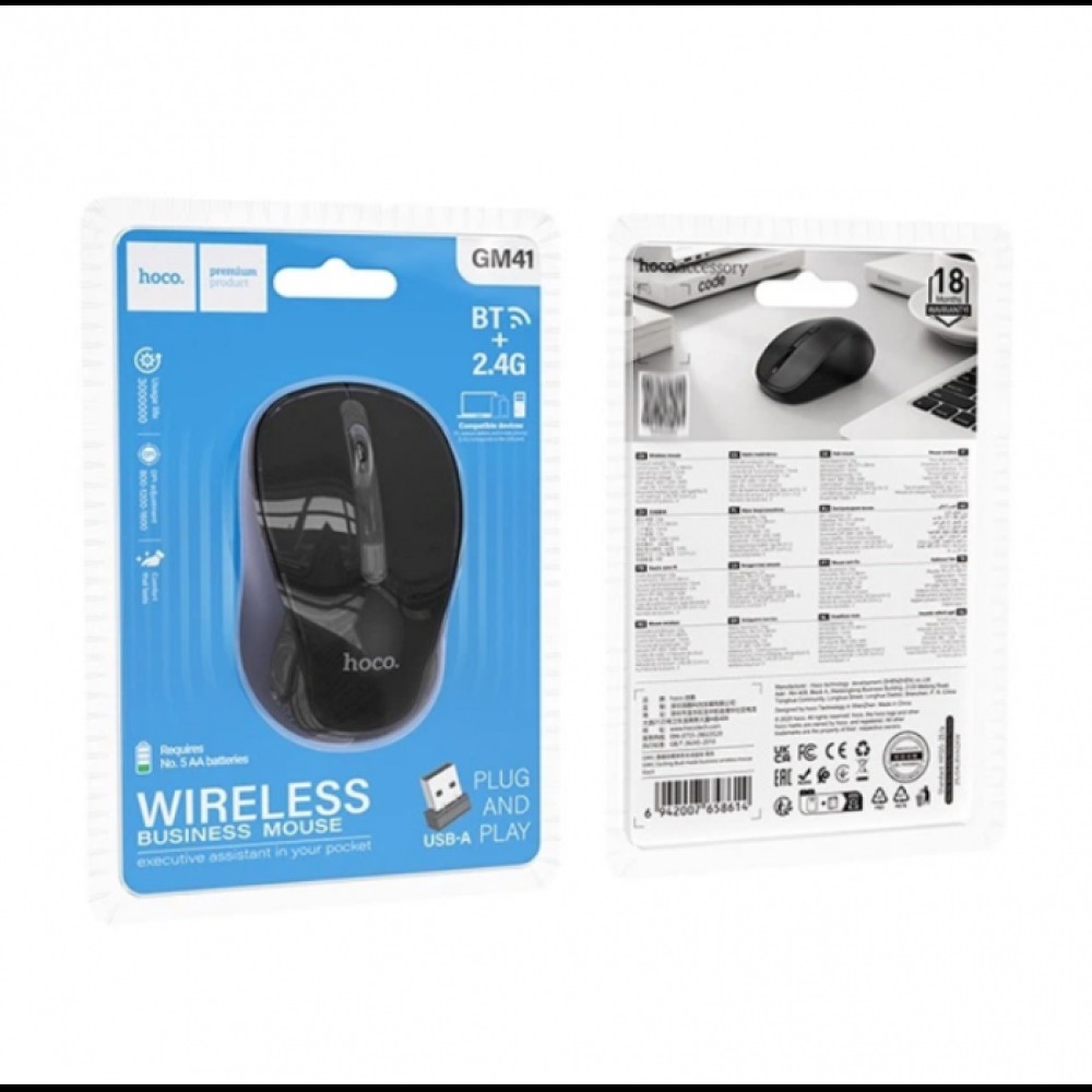 Беспроводная мышка HOCO Exciting dual-mode business wireless mouse GM41 – это универсальный инструмент для офисной работы и ежедневного использования. Модель совмещает сразу два способа подключения: технологию 2.4G через USB-приемник и Bluetooth 3.0/5.2, что делает ее совместимой с ноутбуками, ПК, планшетами и смартфонами. Благодаря использованию чипа MX8650 и контроллера YiCHiP мышь обеспечивает плавное перемещение курсора без задержек и рывков, что особенно важно для комфортной работы в течение дня.