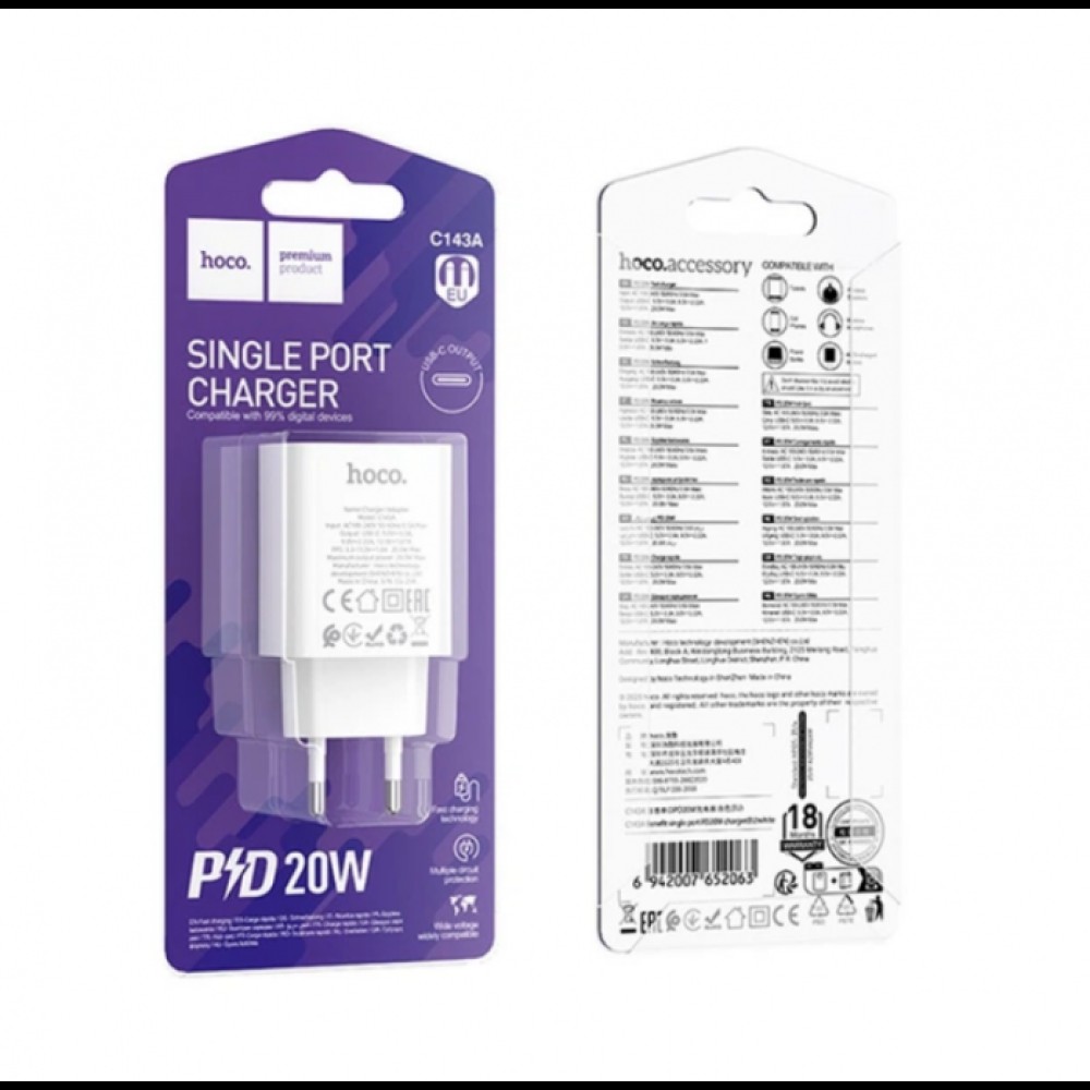 Зарядное устройство HOCO 20W – это компактный и мощный адаптер, предназначенный для быстрой зарядки современных смартфонов и планшетов. Благодаря выходному порту Type-C и поддержке мощности 20W он идеально подходит для устройств с функцией PD (Power Delivery). Этот зарядный блок станет надежным ассистентом как дома, так и в дороге. Его стильный белый корпус из качественного огнестойкого пластика защищает от перегрева и механических повреждений, а встроенные системы безопасности предотвращают короткое замыкание и прыжки напряжения.