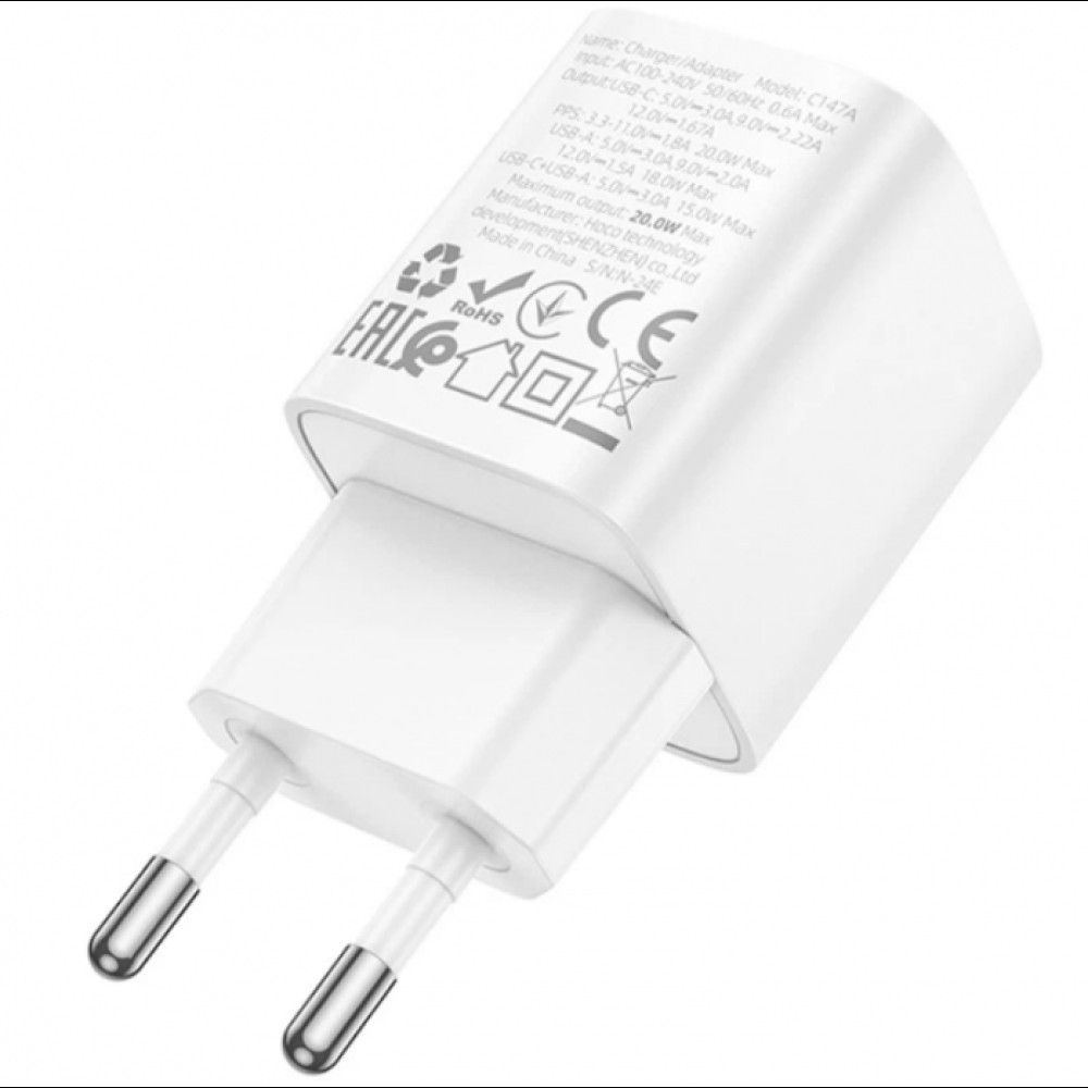 Компактное зарядное устройство HOCO C147A PD20W+QC3.0 – это сочетание эффективности, безопасности и современных технологий для быстрой и надежной зарядки ваших гаджетов. Устройство оснащено двумя портами (Type-C и USB), что позволяет заряжать сразу два устройства, обеспечивая стабильную работу и защиту от перегрузки.