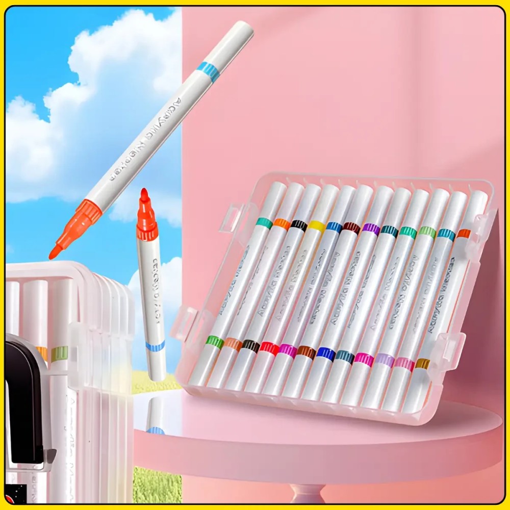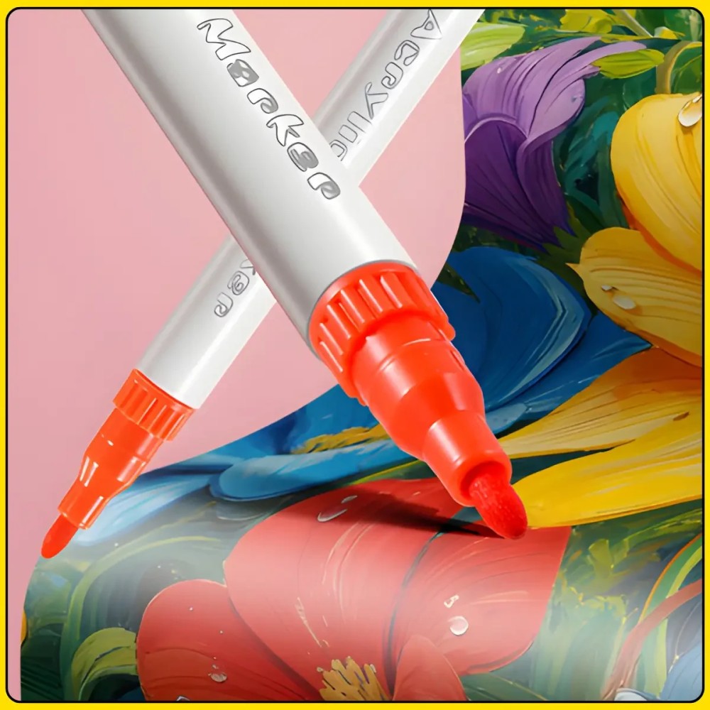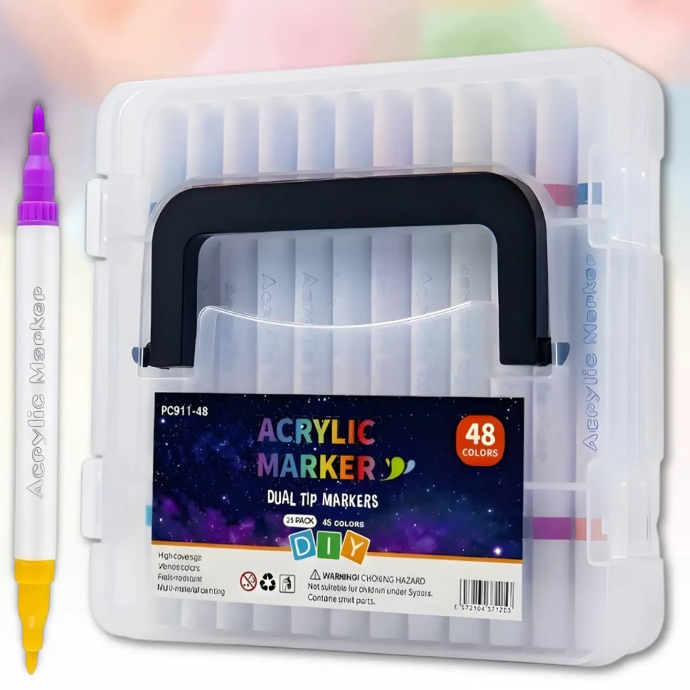 Двухсторонние акриловые маркеры 48 цветов с пулевидным наконечником в кейсе 24 штуки MAP-09 Набор акриловых двухсторонних маркеров включает 24 маркера с уникальной конструкцией: на каждом маркере расположено два разных цвета с обеих сторон, что в сумме дает палитру из 48 оттенков. Это удобное решение позволяет экономить место и быстро переключаться между цветами в процессе работы. Маркеры подходят для рисования на бумаге, дереве, стекле и керамике, открывая широкие возможности для творчества и декора. Твердый пулевидный наконечник с обеих сторон обеспечивает аккуратное и точное нанесение линий. Чернила быстро высыхают и дают плотное равномерное покрытие без разводов. Прозрачный пластиковый кейс с ручкой делает хранение и переноску максимально удобными, а компактные размеры позволяют брать набор с собой. Преимущества: Два цвета в одном маркере: экономия места и удобство Двухсторонняя конструкция: быстрый доступ к разным цветам Твердый наконечник: точные и аккуратные линии Плотное покрытие: равномерное нанесение Быстрое высыхание: без размазывания Универсальность: подходит для разных поверхностей Характеристики: Тип: акриловые маркеры Количество маркеров: 24 шт. Количество цветов: 48 Конструкция: двухсторонние, два цвета в одном маркере Наконечник: твердый (пулевидный) Назначение: бумага, дерево, стекло, керамика Особенности чернил: быстро сохнут, плотное покрытие Закрытие: колпачок Размер маркера: 131 x 9 мм Размер кейса: 32 x 5 x 20 см Тип хранения: кейс Материал кейса: пластик Цвет кейса: прозрачный