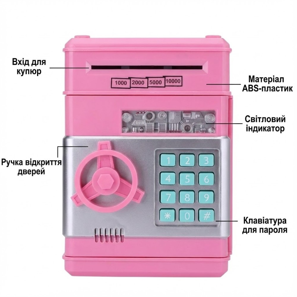 Описание Кратко: Электронный сейф-копилка Number Bank — детский «банкомат» с кодовым замком и автоматическим приёмом купюр. Помогает ребёнку копить деньги, играть и учиться финансовой грамотности. Надёжный пластиковый корпус и звуковое сопровождение делают процесс весёлым и наглядным. Преимущества: Кодовый замок с возможностью смены пароля Автоприём купюр: «затягивает» банкноту сам Отделение для монет и банкнот Звуковые эффекты во время работы Простое управление кнопками на панели Прочный пластиковый корпус (лёгкий и безопасный) Подарочная идея для мальчиков и девочек Розовый цвет — яркий и привлекательный дизайн Технические характеристики: Тип устройства — электронный сейф-копилка («банкомат») Модель — Number Bank Цвет — розовый Материал корпуса — пластик (ABS) Замок — кодовый, смена пароля поддерживается Приём купюр — автоматический Приём монет — через верхнее/боковое отверстие Звуковые эффекты — есть Питание — батарейки Комплектация: Электронный сейф-копилка Number Bank (розовый) Инструкция Упаковка