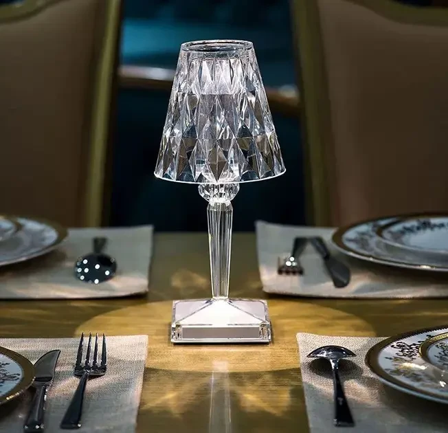 Светильник настольный аккумуляторный. Декоративный LED светильник Diamond Бриллиант светодиодный хрустальный USB. Декоративный LED светильник ночник абажур светодиодная хрустальная лампа на аккумуляторе Diamond light Бриллиант кристалл хрусталь USB Заряда аккумулятора лампы хватает на 12 часов активного использования. Хрустальная лампа для кровати изготовлена из прозрачного акрилового материала, который крепок и сложно повреждается. Современный роскошный сенсорный светильник очень удобен и прост в использовании, просто нажмите кнопку, чтобы включить/выключить свет. Стильный декоративный светильник в форме кристалла имеет три разных переменных цвета: холодный; теплый; нейтральный; Прекрасный дизайн создает романтическую расслабляющую и приятную атмосферу для вас и станет отличным дополнением в Вашем доме, потому что он создает ощущение комфорта и уюта. Создает благоприятную атмосферу в любой комнате, будет радовать как взрослого, так и ребенка. Декоративную настольную лампу можно подобрать к любому стилю и цвету оформления. Широкий спектр применения: лампы очень подходят для баров, ресторанов, гостиниц, спален, обеденных столов, журнальных столиков, гостиных, кухонь и любых уголков дома как декоративная настольная лампа. Настольная лампа имеет встроенный аккумулятор, один заряд которого может освещать в течение 12 часов, что делает его многофункциональным. Вам не придется думать, как разместить провод на столе или где найти источник питания на романтическом ужине под звездами. Преимущества данных светильников: отлично дополнят Ваш интерьер в квартире или доме; станет отличным подарком; может освещать комнату как вечером, так и днем; практический и не занимающий много места; автономная работа в течение 12 часов от одного заряда; быстрая зарядка в течение 2-3 часов; Характеристики: Высота: 25,5 см Диаметр основания: 8,5 см Длина кабеля: 96 см Тип питания: USB кабель