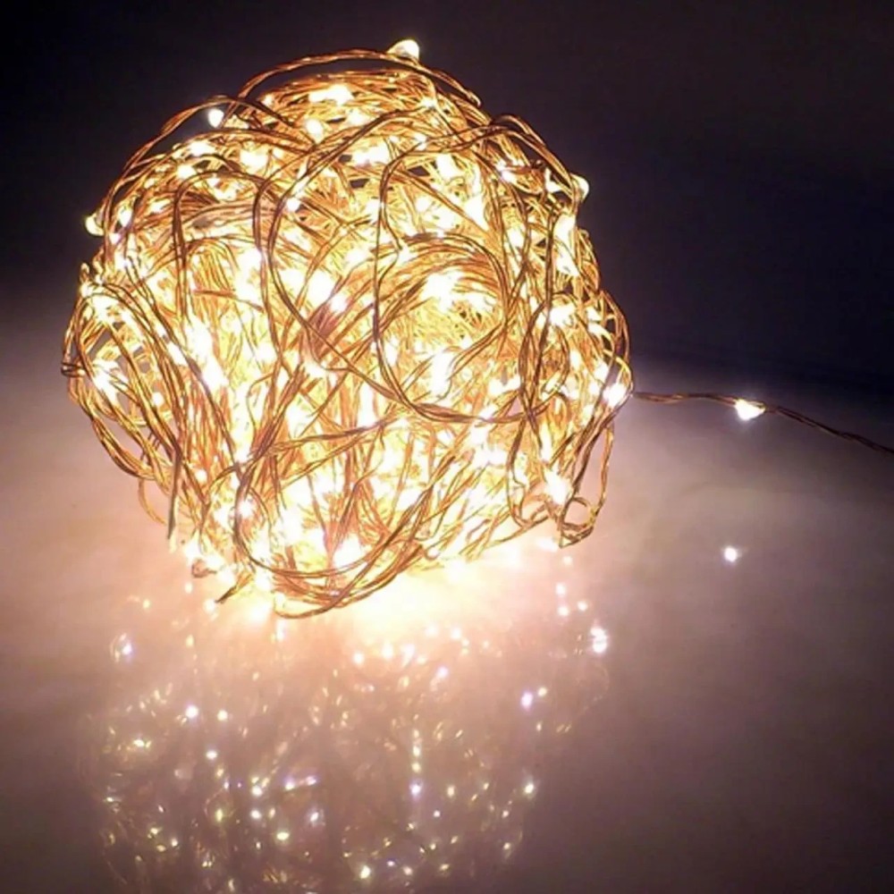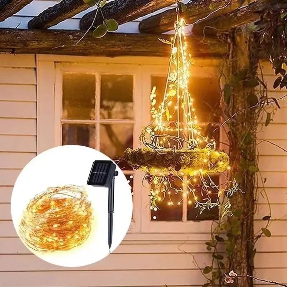 Уличная гирлянда с солнечной панелью Капля росы SFK-14 Светодиодные гирлянды с теплой белой подсветкой 10м Гирлянда «Капля Росы» SFK-14 — это стильное и экономичное решение для праздничного освещения, работающее от солнечной энергии. Длина в 10 метров и 100 светодиодных лампочек на тонкой медной проволоке позволяют создавать изысканный световой декор для любых целей — от украшения двора и витрин до праздничного оформления интерьеров и ёлок. Благодаря солнечной панели гирлянда заряжается в течение дня и автоматически включается в сумерках, создавая атмосферу уюта и сказочности. Она проста в установке и обладает высоким уровнем защиты от солнечного воздействия, что делает её идеальной для длительного использования на улице. Преимущества: Автономное питание: работает от солнечной энергии, заряжается в течение дня и автоматически включается ночью. Экономичность: не требует затрат на электроэнергию, так как использует энергию солнца. Гибкость: тонкая медная проволока позволяет создавать световые узоры любой формы. Долговечность и влагозащита: материал гирлянды и солнечной панели устойчив к внешним воздействиям, что позволяет использовать её на улице. Универсальность: подходит для оформления дворов, сцен, витрин, а также новогодних ёлок и праздничных интерьеров. Характеристики: Длина гирлянды: 10 м Количество LED-лампочек: 100 Тип освещения: теплый белый Тип батареи: перезаряжаемый никель-металлгидридный аккумулятор Размер солнечной панели: 6,5 см x 2,2 см x 6,5 см Материал панели: ABS + поликремний Цвет провода: прозрачный Время зарядки: 4-6 часов при достаточном солнечном свете