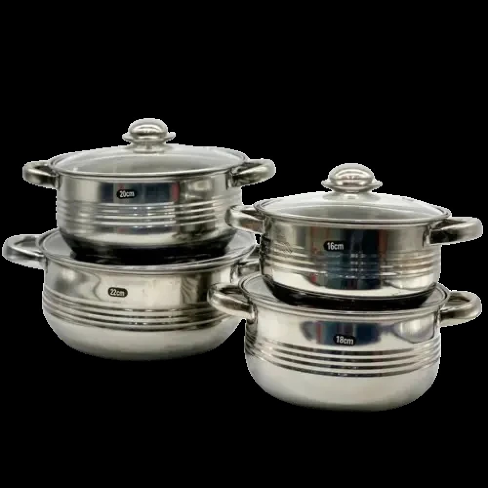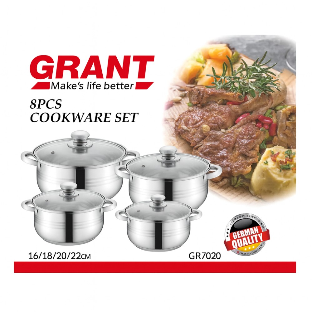 Набор кастрюль с крышками из нержавеющей стали на 8 предметов Grand GR-7020 Набор кухонной посуды Набор кухонной посуды из нержавеющей стали на 8 предметов с индукционным дном Grand GR-7020- станет элегантным и функциональным дополнением к любой кухне. Этот набор идеально подойдет для семьи или может стать прекрасным подарком для друзей или близких. Нержавеющая посуда зарекомендовала себя как одна из самых надежных и практичных помощников на кухне. В качественной посуде процесс приготовления пищи приносит одно удовольствие. Основное преимущество нержавеющей посуды в толстом капсульном дне равномерно распределяет тепло. Данный набор оснащен прозрачными крышками с паровым отводом подходит для готовки пищи в разном объеме. Набор изготовлен из высококачественной нержавеющей стали не окисляется не ржавеет, быстро нагревается долго и держит температуру. Отлично подойдёт для длительного пользования станет хорошим подарком на любой праздник. Практичность и долговечность качество и надежность является основными преимущества нержавеющей посуды. Особенности: Термоаккумулирующее не деформирующееся дно; Капсульное дно обеспечивает равномерную теплопроводность; Быстрое распределение и долгое удержание тепла, пища не пригорает Клепаные не нагревающиеся ручки из нержавеющей стали, серебряный цвет; Подходит для всех источников тепла, включая индукционные плиты; Прозрачные крышки – термостойкое стекло с отверстием для выхода пара; Можно мыть в посудомоечной машине; Легко чистится; Долгий срок службы Характеристики: Нержавеющая высококачественная пищевая сталь Эффект быстрого нагрева и равномерного распределения тепла, что предотвращает пригорания в процессе готовки. Рекомендуется использовать на всех источниках нагрева в том числе индукционных плит. Здоровое приготовление пищи с максимальным сохранением витаминов. Удобные крышки из термостойкого стекла. Комплектация: Кол-во предметов - 8 Комплектация - 4 кастрюли с крышками Крышки - Стекло Материал - Нержавеющая cталь Материал корпуса - Нержавеющая сталь Материал крышки - Термостойкое стекло с отверстием для выхода пара Материал ручек - Нержавеющая сталь Можно мыть в посудомоечной машине - Да Объем (л) - 1.1; 1.7; 2.5; 3.2 Покрытие - Зеркальная обработка наружной поверхности Диаметр - 16 см; 18 см; 20 см; 22 см