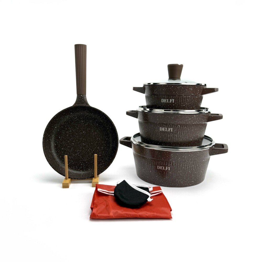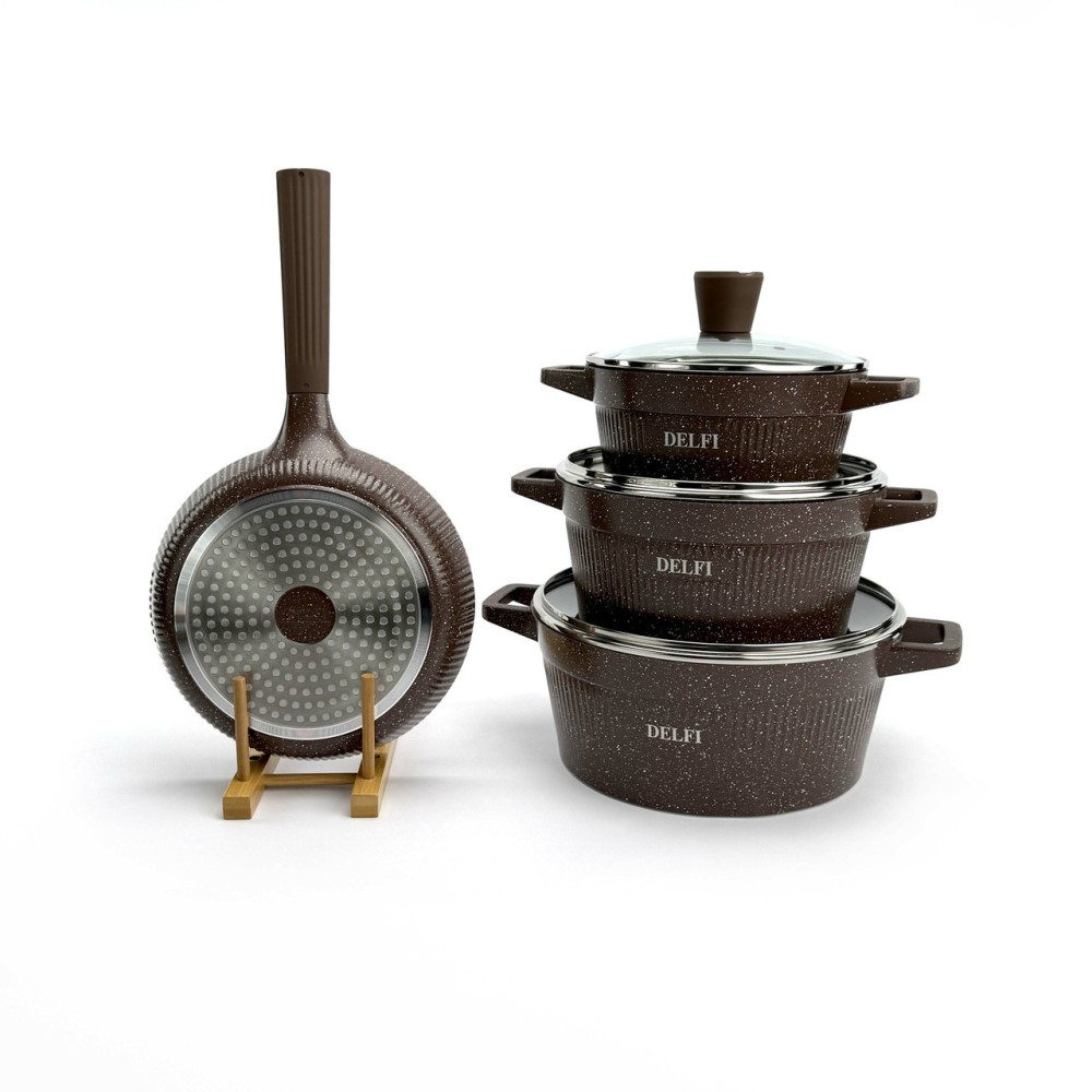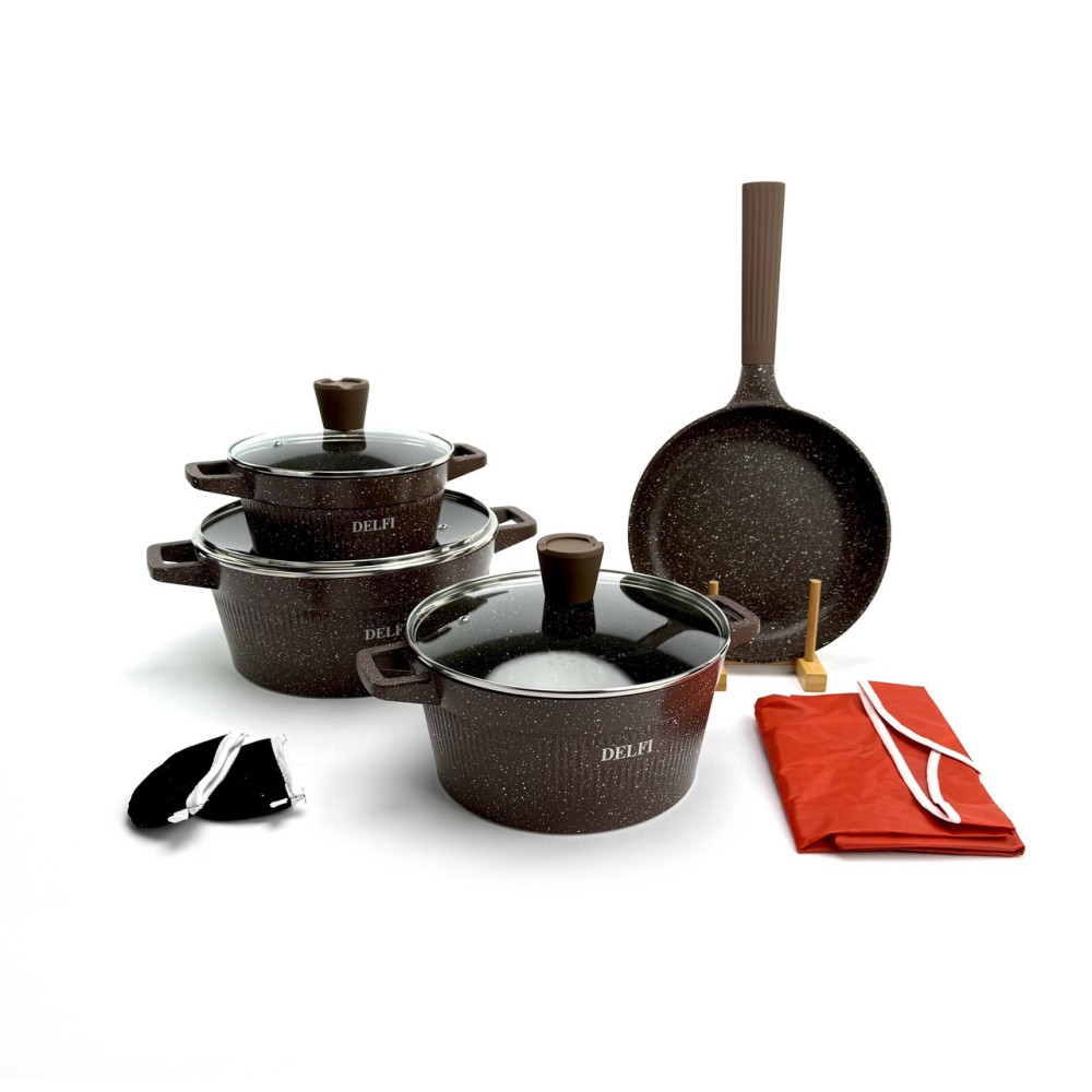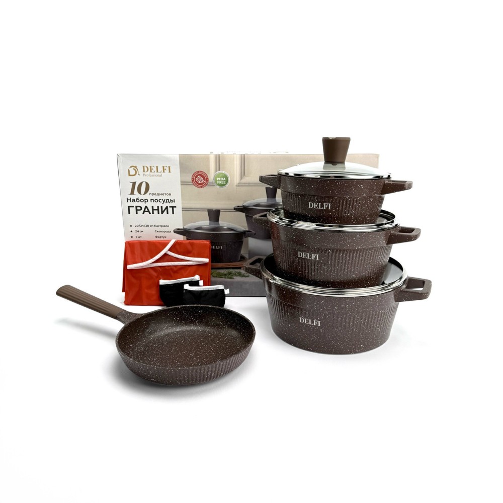 Набор посуды Delfi YD-10 — это идеальный баланс стиля и функциональности. Корпус посуды изготовлен из высококачественного литого алюминия (Die-cast Aluminum), который обеспечивает быстрый и равномерный нагрев, а также высокую устойчивость к деформации. Эффектный внешний дизайн с ребристыми стенками дополнен практичными термостойкими ручками. Внутреннее и внешнее гранитное покрытие (Granite Coating) обладает отличными антипригарными свойствами, позволяет готовить с минимальным количеством масла и легко моется. Покрытие абсолютно безопасно и не содержит PFOA. Дно оснащено индукционным диском, что делает набор совместимым со всеми типами плит. Преимущества Полная комплектация (10-в-1): Включает 3 кастрюли, 1 сковороду и 3 аксессуара (фартук, прихватки). Прочный литой алюминий: Обеспечивает равномерный нагрев без "горячих точек". Гранитное покрытие: Долговечное антипригарное покрытие внутри и снаружи, PFOA-Free. Универсальная совместимость: Индукционное дно подходит для всех типов плит (газовых, электрических, стеклокерамических). Стильный дизайн: Уникальный ребристый корпус в насыщенном коричневом цвете. Практичные аксессуары: В комплект входят фартук и прихватки. Технические характеристики Бренд: Delfi Модель: YD-10 Количество предметов: 10 Цвет: Коричневый Материал корпуса: Литой алюминий (Die-casting Aluminum) Покрытие: Гранитное (внутреннее и внешнее) Безопасность: PFOA FREE Материал крышек: Закаленное стекло Совместимость с плитами: Все типы, включая индукционные Габариты упаковки: 58 х 34 х 17 см Вес: 6.6 кг Комплектация набора (10 предметов) Кастрюля со стеклянной крышкой: 20 см Кастрюля со стеклянной крышкой: 24 см Кастрюля со стеклянной крышкой: 28 см Сковорода: 24 см Фартук (1 шт) Прихватки (2 шт)