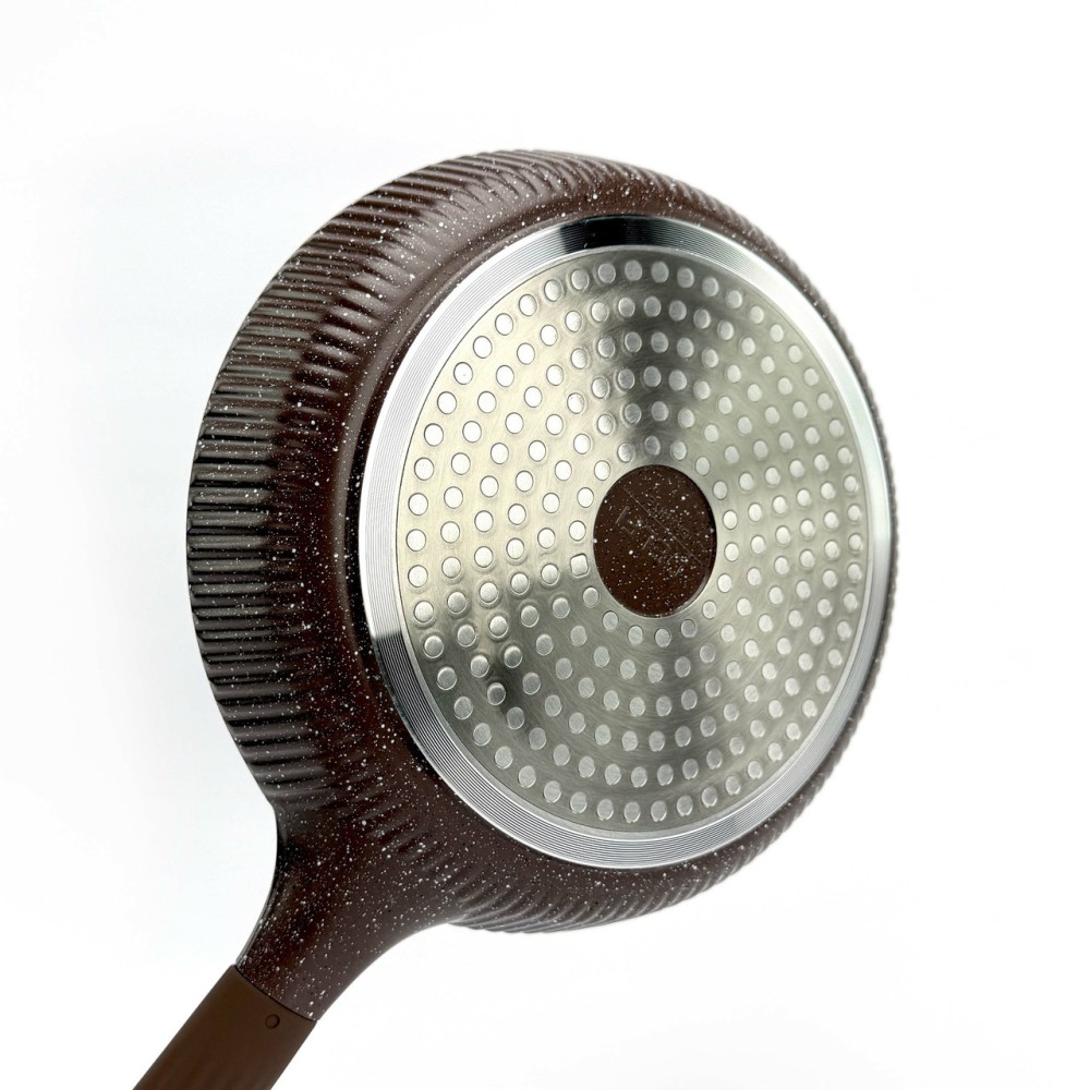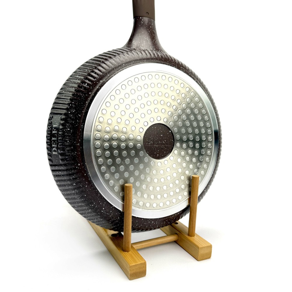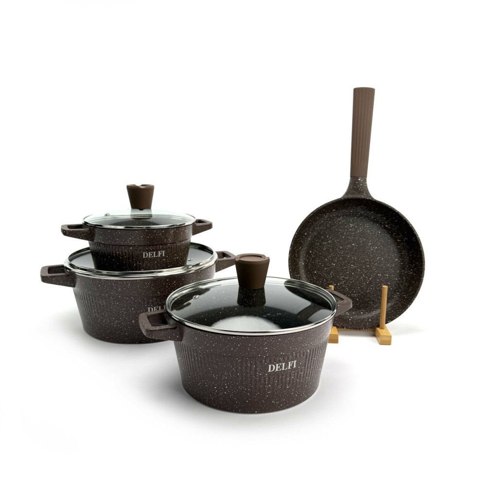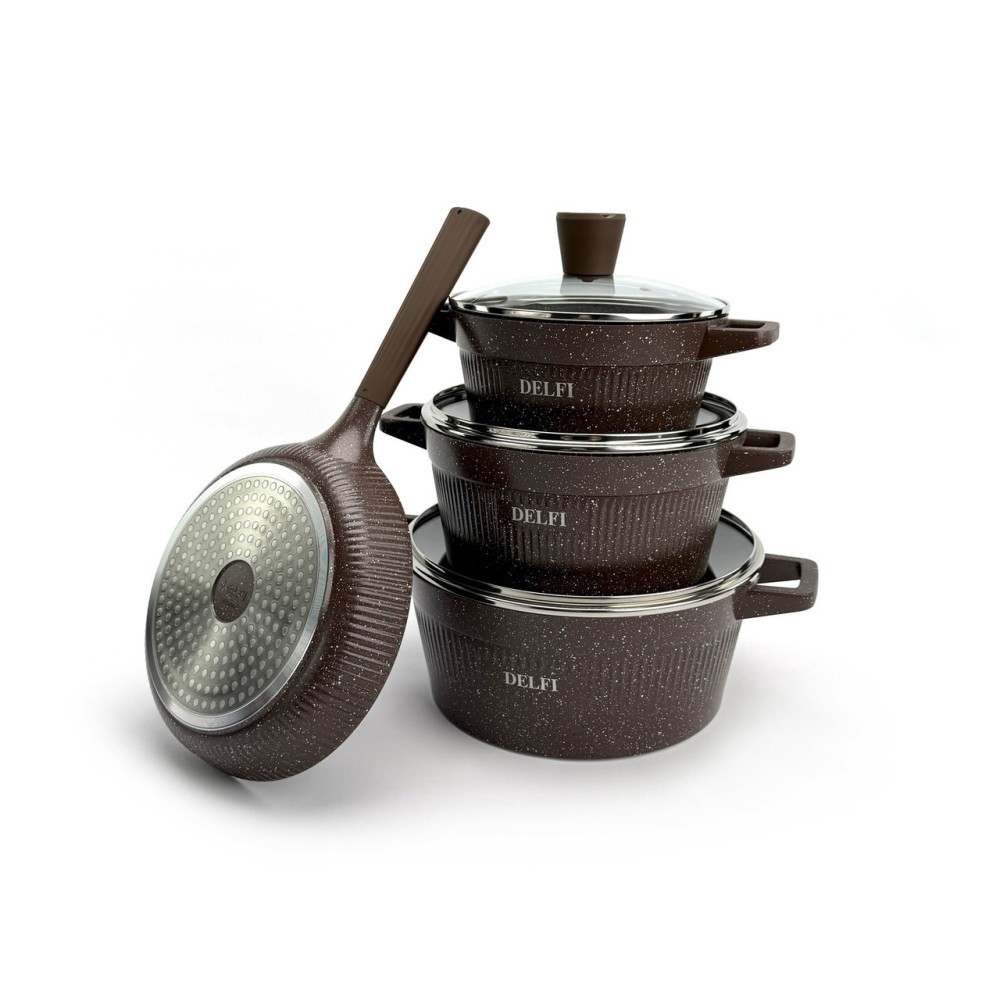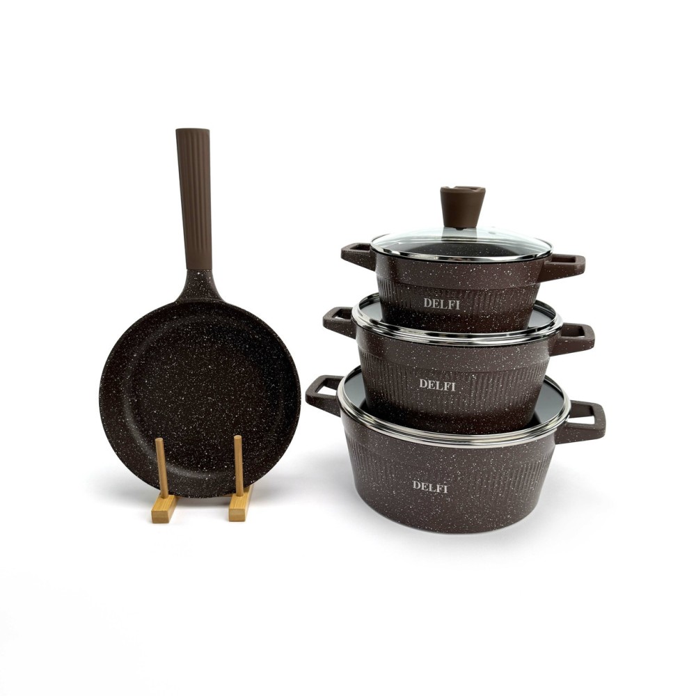 Набор посуды Delfi YD-10 — это идеальный баланс стиля и функциональности. Корпус посуды изготовлен из высококачественного литого алюминия (Die-cast Aluminum), который обеспечивает быстрый и равномерный нагрев, а также высокую устойчивость к деформации. Эффектный внешний дизайн с ребристыми стенками дополнен практичными термостойкими ручками. Внутреннее и внешнее гранитное покрытие (Granite Coating) обладает отличными антипригарными свойствами, позволяет готовить с минимальным количеством масла и легко моется. Покрытие абсолютно безопасно и не содержит PFOA. Дно оснащено индукционным диском, что делает набор совместимым со всеми типами плит. Преимущества Полная комплектация (10-в-1): Включает 3 кастрюли, 1 сковороду и 3 аксессуара (фартук, прихватки). Прочный литой алюминий: Обеспечивает равномерный нагрев без "горячих точек". Гранитное покрытие: Долговечное антипригарное покрытие внутри и снаружи, PFOA-Free. Универсальная совместимость: Индукционное дно подходит для всех типов плит (газовых, электрических, стеклокерамических). Стильный дизайн: Уникальный ребристый корпус в насыщенном коричневом цвете. Практичные аксессуары: В комплект входят фартук и прихватки. Технические характеристики Бренд: Delfi Модель: YD-10 Количество предметов: 10 Цвет: Коричневый Материал корпуса: Литой алюминий (Die-casting Aluminum) Покрытие: Гранитное (внутреннее и внешнее) Безопасность: PFOA FREE Материал крышек: Закаленное стекло Совместимость с плитами: Все типы, включая индукционные Габариты упаковки: 58 х 34 х 17 см Вес: 6.6 кг Комплектация набора (10 предметов) Кастрюля со стеклянной крышкой: 20 см Кастрюля со стеклянной крышкой: 24 см Кастрюля со стеклянной крышкой: 28 см Сковорода: 24 см Фартук (1 шт) Прихватки (2 шт)