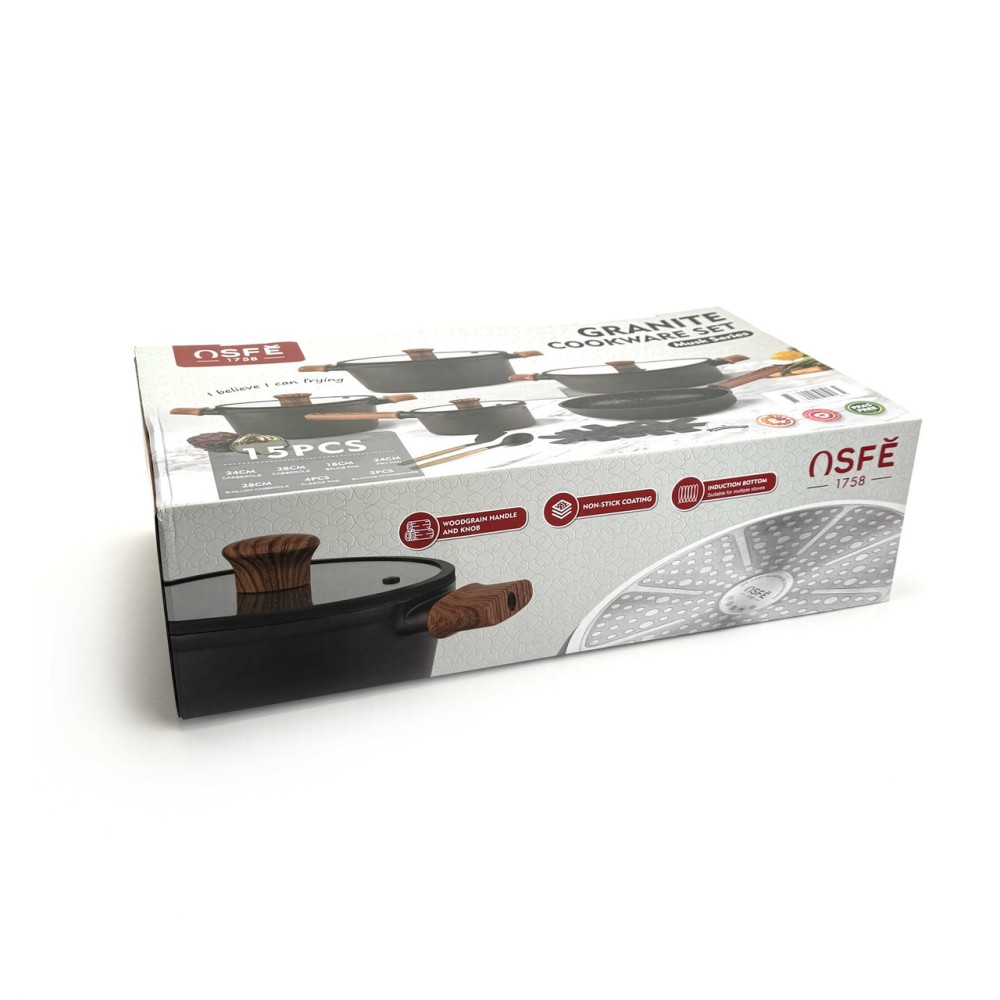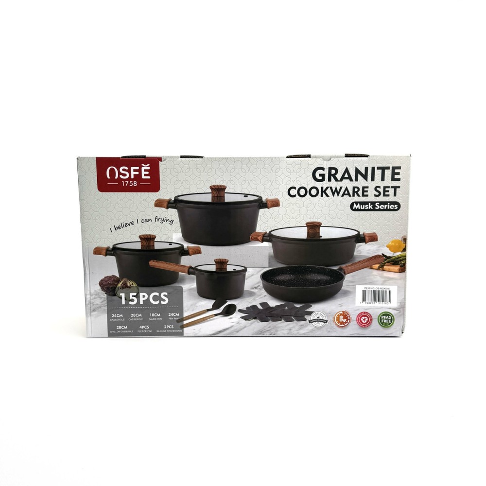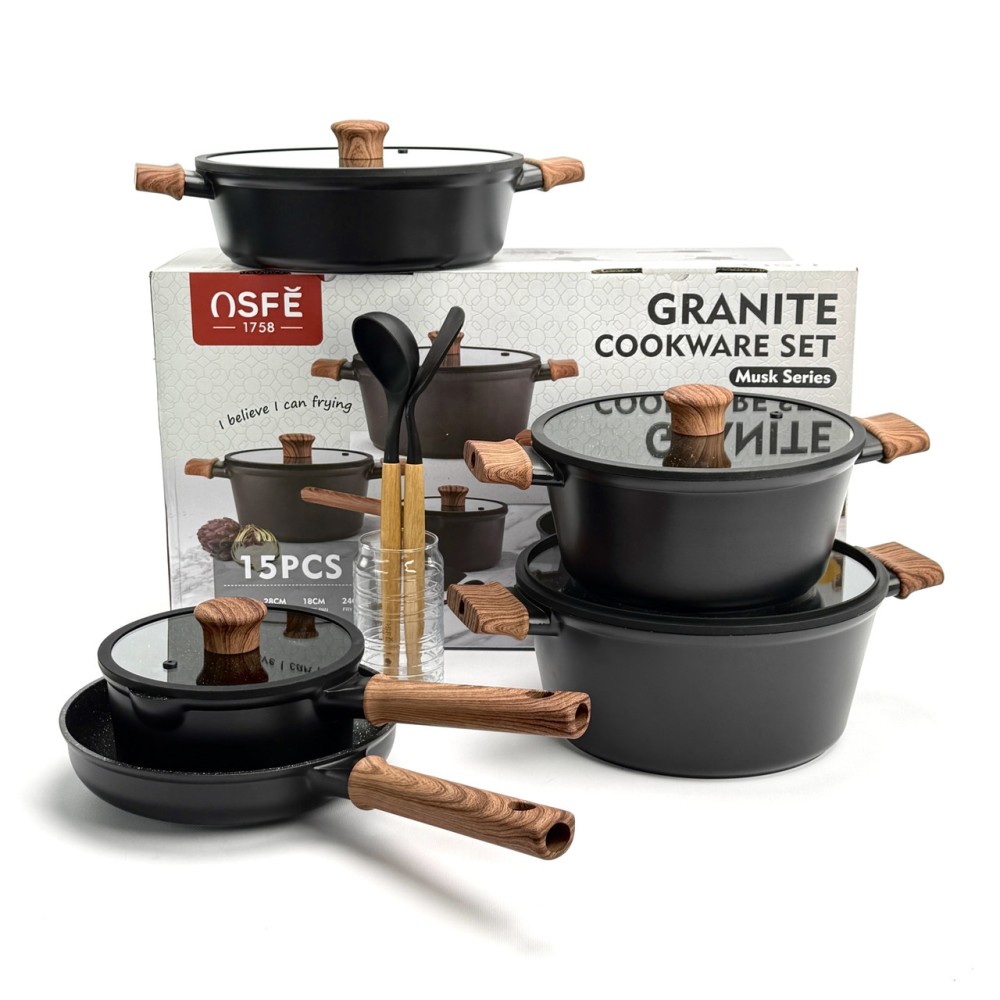 Набор посуды OSFE Musk Series сочетает в себе эстетику и функциональность. Корпус изготовлен из высококачественного литого алюминия, который обеспечивает быстрый и равномерный нагрев. Внутренняя поверхность покрыта долговечным гранитным антипригарным покрытием, которое абсолютно безопасно для здоровья (не содержит PFOA и PFAS) и позволяет готовить с минимальным количеством масла. Эргономичные ручки с покрытием под дерево не нагреваются и придают набору изысканный вид. Дно посуды оснащено индукционным диском, что делает ее совместимой со всеми типами плит. В комплект также входят фетровые подкладки для бережного хранения посуды. Преимущества Полная комплектация (15-в-1): Включает 3 кастрюли, 1 сотейник, 1 сковороду и 6 аксессуаров. Прочное гранитное покрытие: Долговечное, антипригарное и легкое в уходе. Безопасность для здоровья: Не содержит PFOA, PFAS и других вредных веществ. Универсальная совместимость: Индукционное дно подходит для всех типов плит. Стильный дизайн: Эффектное сочетание черного гранита и ручек с текстурой дерева. Продуманные аксессуары: В комплект входят фетровые протекторы для хранения. Технические характеристики Бренд: OSFE Модель: OE-MSK015 (Musk Series) Количество предметов: 15 Цвет: Черный Материал корпуса: Литой алюминий Покрытие: Гранитное (антипригарное) Безопасность: PFOA/PFAS FREE Материал ручек: Термостойкий пластик "под дерево" Материал крышек: Закаленное стекло Совместимость с плитами: Все типы, включая индукционные Габариты упаковки: 61 х 34 х 17 см Вес: 8.2 кг Комплектация набора (15 предметов) Кастрюля со стеклянной крышкой: 24 см Кастрюля со стеклянной крышкой: 28 см Ковш со стеклянной крышкой: 18 см Сотейник (Мелкая кастрюля) со стеклянной крышкой: 28 см Сковорода: 24 см Фетровые подкладки-протекторы (4 шт) Силиконовые кухонные принадлежности (2 шт)