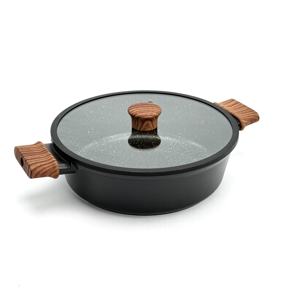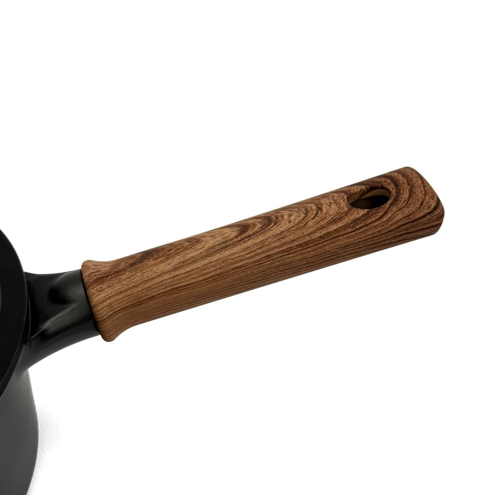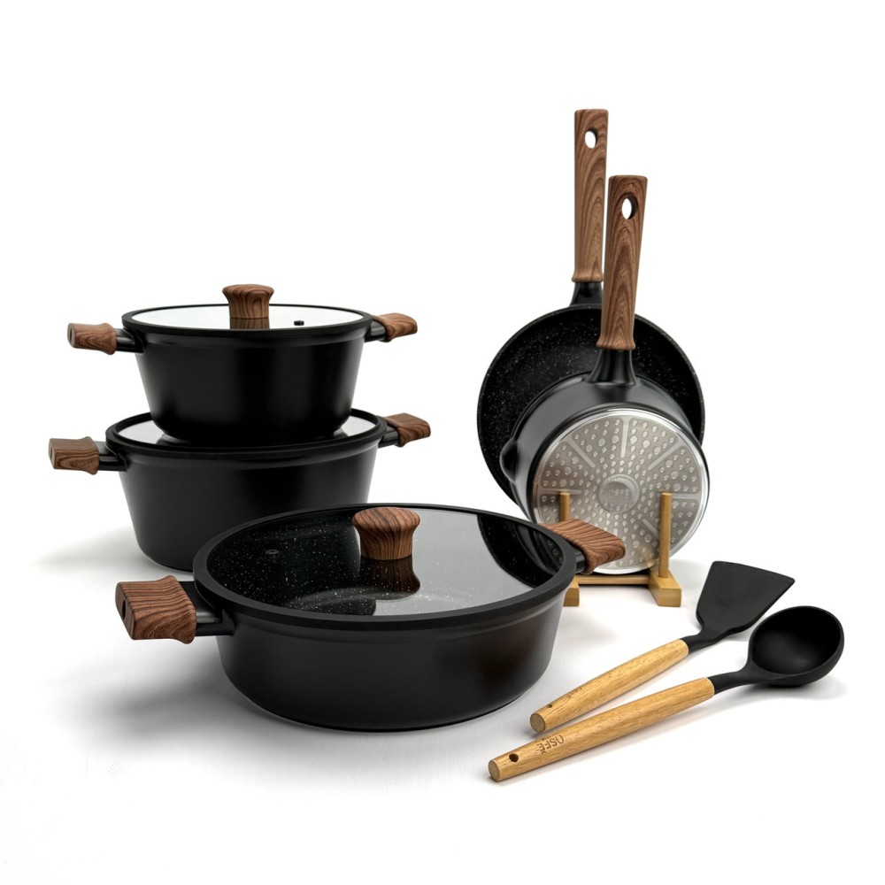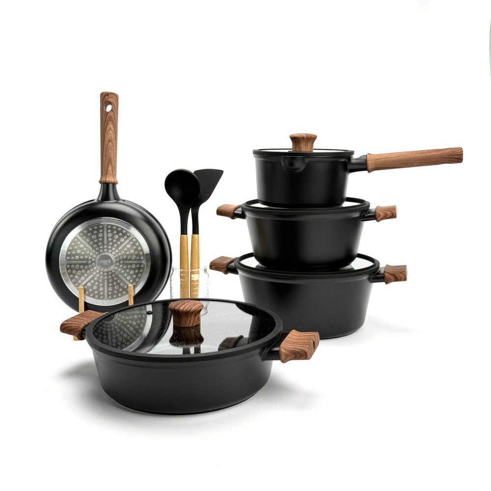 Набор посуды OSFE Musk Series сочетает в себе эстетику и функциональность. Корпус изготовлен из высококачественного литого алюминия, который обеспечивает быстрый и равномерный нагрев. Внутренняя поверхность покрыта долговечным гранитным антипригарным покрытием, которое абсолютно безопасно для здоровья (не содержит PFOA и PFAS) и позволяет готовить с минимальным количеством масла. Эргономичные ручки с покрытием под дерево не нагреваются и придают набору изысканный вид. Дно посуды оснащено индукционным диском, что делает ее совместимой со всеми типами плит. В комплект также входят фетровые подкладки для бережного хранения посуды. Преимущества Полная комплектация (15-в-1): Включает 3 кастрюли, 1 сотейник, 1 сковороду и 6 аксессуаров. Прочное гранитное покрытие: Долговечное, антипригарное и легкое в уходе. Безопасность для здоровья: Не содержит PFOA, PFAS и других вредных веществ. Универсальная совместимость: Индукционное дно подходит для всех типов плит. Стильный дизайн: Эффектное сочетание черного гранита и ручек с текстурой дерева. Продуманные аксессуары: В комплект входят фетровые протекторы для хранения. Технические характеристики Бренд: OSFE Модель: OE-MSK015 (Musk Series) Количество предметов: 15 Цвет: Черный Материал корпуса: Литой алюминий Покрытие: Гранитное (антипригарное) Безопасность: PFOA/PFAS FREE Материал ручек: Термостойкий пластик "под дерево" Материал крышек: Закаленное стекло Совместимость с плитами: Все типы, включая индукционные Габариты упаковки: 61 х 34 х 17 см Вес: 8.2 кг Комплектация набора (15 предметов) Кастрюля со стеклянной крышкой: 24 см Кастрюля со стеклянной крышкой: 28 см Ковш со стеклянной крышкой: 18 см Сотейник (Мелкая кастрюля) со стеклянной крышкой: 28 см Сковорода: 24 см Фетровые подкладки-протекторы (4 шт) Силиконовые кухонные принадлежности (2 шт)