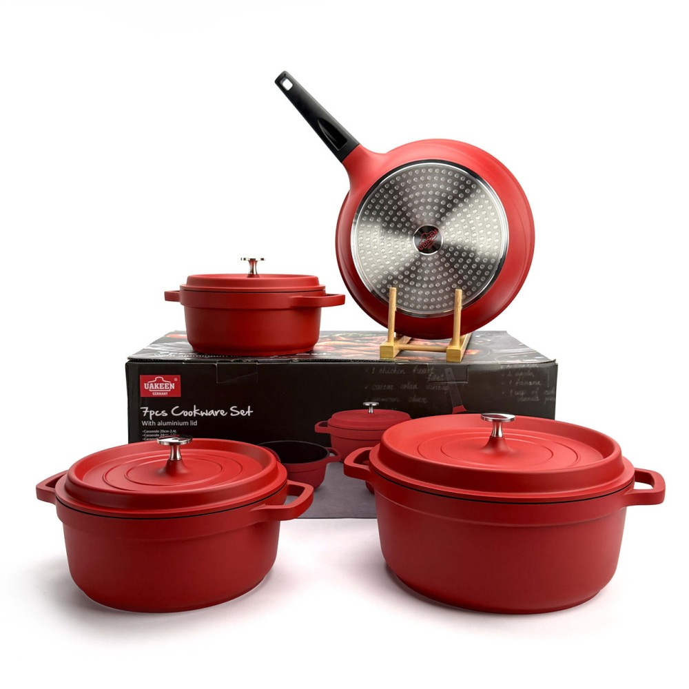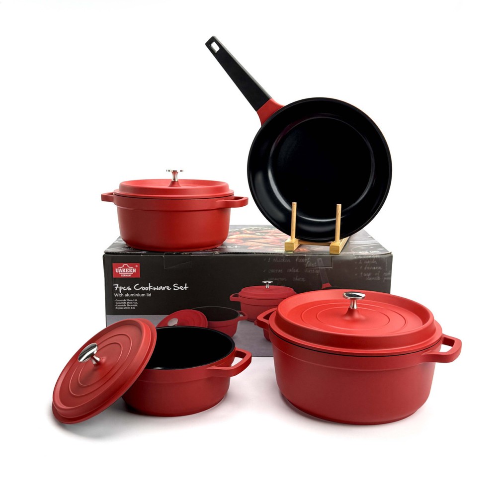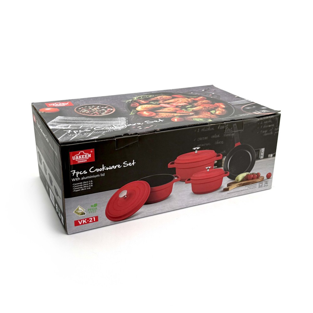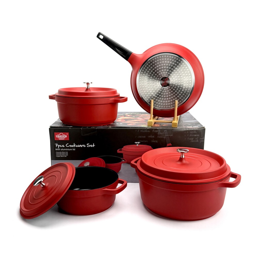 Набор UAKEEN VK-21 создан для тех, кто ценит идеальный результат при длительном тушении. Корпус из литого алюминия обеспечивает превосходный нагрев, а индукционное дно подходит для всех типов плит. Внутренняя поверхность покрыта долговечным гранитным антипригарным покрытием, не содержащим PFOA. Ключевое преимущество набора — массивные алюминиевые крышки (вместо стеклянных). С внутренней стороны они оснащены специальными шипами, которые создают "эффект тропического дождя": пар конденсируется, собирается на шипах и равномерно возвращается на блюдо. Это сохраняет все соки, ароматы и витамины, делая продукты мягкими и нежными. Ручки на крышках из нержавеющей стали подчеркивают премиальный дизайн. Преимущества Крышки с функцией самоорошения: Шипы на внутренней стороне крышек обеспечивают постоянную циркуляцию влаги, делая блюда сочными. Прочный литой алюминий: Обеспечивает равномерный нагрев и долговечность, как у чугуна, но с меньшим весом. Гранитное покрытие: Долговечное антипригарное покрытие, PFOA-Free. Универсальная совместимость: Индукционное дно подходит для всех типов плит. Премиальный дизайн: Матовый красный цвет и стильные ручки из нержавеющей стали на крышках. Технические характеристики Бренд: UAKEEN Модель: VK-21 Количество предметов: 7 (3 кастрюли + 3 крышки + 1 сковорода) Цвет: Красный матовый Материал корпуса: Литой алюминий Покрытие: Гранитное (антипригарное) Материал крышек: Литой алюминий (с функцией самоорошения) Материал ручек (крышки): Нержавеющая сталь Безопасность: PFOA FREE Дно: Индукционное Совместимость с плитами: Все типы Габариты упаковки: 57 х 34 х 22 см Вес: 8 кг Комплектация набора (7 предметов) Кастрюля с крышкой: 20 см (2.4 л) Кастрюля с крышкой: 24 см (4.3 л) Кастрюля с крышкой: 28 см (6.6 л) Сковорода: 28 см (3.6 л)