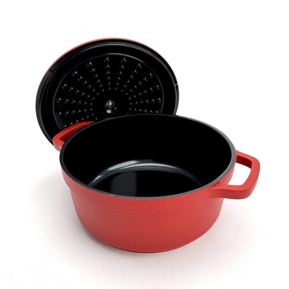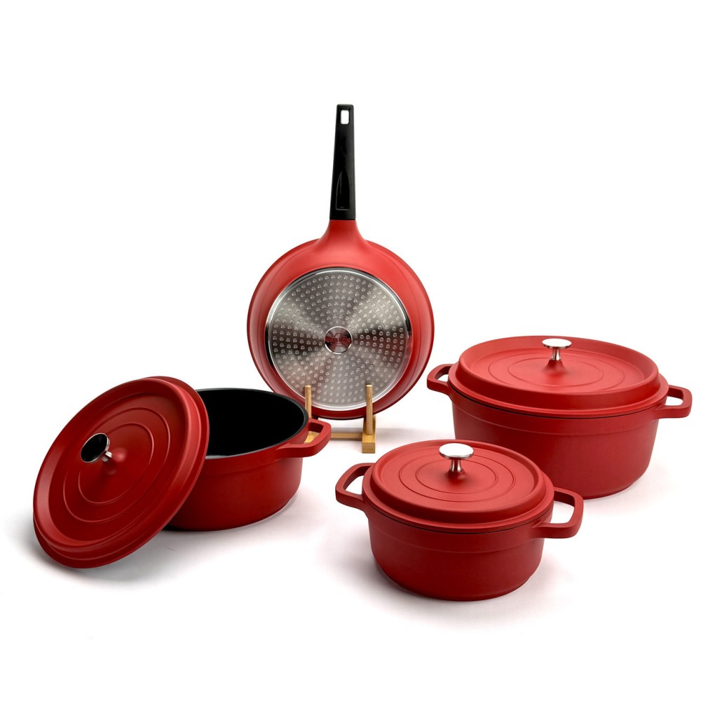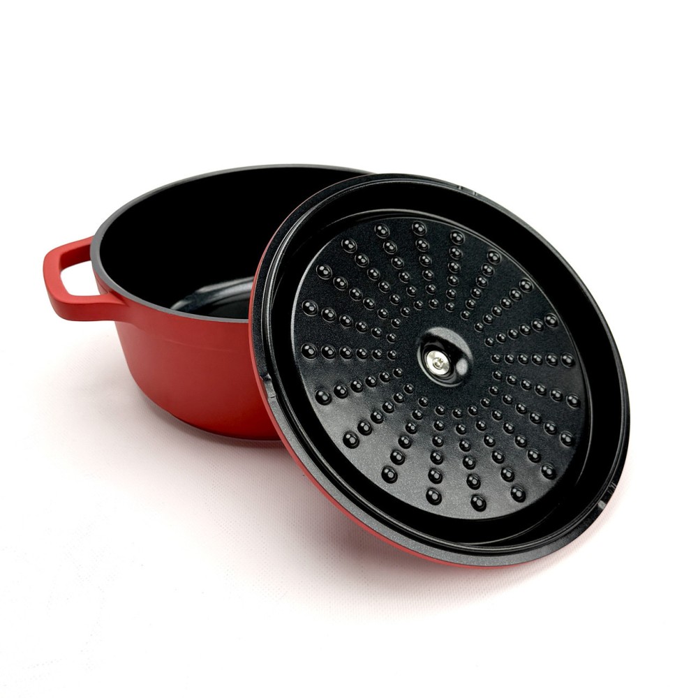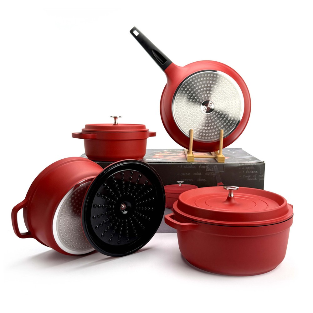 Набор UAKEEN VK-21 создан для тех, кто ценит идеальный результат при длительном тушении. Корпус из литого алюминия обеспечивает превосходный нагрев, а индукционное дно подходит для всех типов плит. Внутренняя поверхность покрыта долговечным гранитным антипригарным покрытием, не содержащим PFOA. Ключевое преимущество набора — массивные алюминиевые крышки (вместо стеклянных). С внутренней стороны они оснащены специальными шипами, которые создают "эффект тропического дождя": пар конденсируется, собирается на шипах и равномерно возвращается на блюдо. Это сохраняет все соки, ароматы и витамины, делая продукты мягкими и нежными. Ручки на крышках из нержавеющей стали подчеркивают премиальный дизайн. Преимущества Крышки с функцией самоорошения: Шипы на внутренней стороне крышек обеспечивают постоянную циркуляцию влаги, делая блюда сочными. Прочный литой алюминий: Обеспечивает равномерный нагрев и долговечность, как у чугуна, но с меньшим весом. Гранитное покрытие: Долговечное антипригарное покрытие, PFOA-Free. Универсальная совместимость: Индукционное дно подходит для всех типов плит. Премиальный дизайн: Матовый красный цвет и стильные ручки из нержавеющей стали на крышках. Технические характеристики Бренд: UAKEEN Модель: VK-21 Количество предметов: 7 (3 кастрюли + 3 крышки + 1 сковорода) Цвет: Красный матовый Материал корпуса: Литой алюминий Покрытие: Гранитное (антипригарное) Материал крышек: Литой алюминий (с функцией самоорошения) Материал ручек (крышки): Нержавеющая сталь Безопасность: PFOA FREE Дно: Индукционное Совместимость с плитами: Все типы Габариты упаковки: 57 х 34 х 22 см Вес: 8 кг Комплектация набора (7 предметов) Кастрюля с крышкой: 20 см (2.4 л) Кастрюля с крышкой: 24 см (4.3 л) Кастрюля с крышкой: 28 см (6.6 л) Сковорода: 28 см (3.6 л)