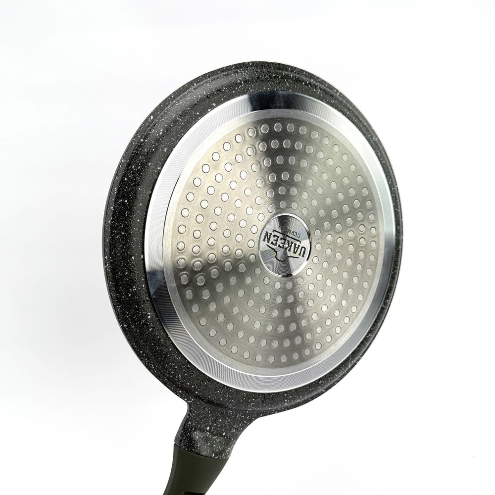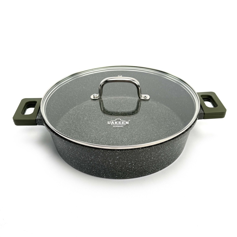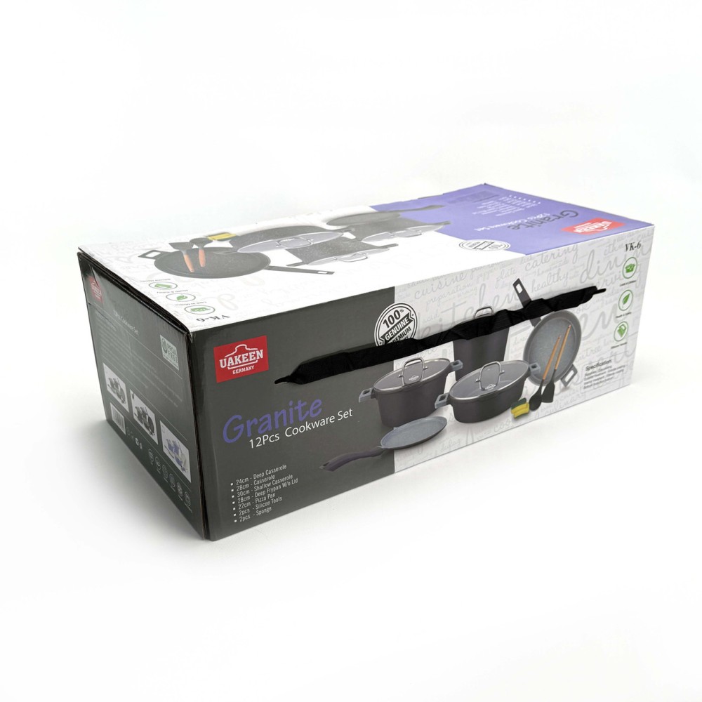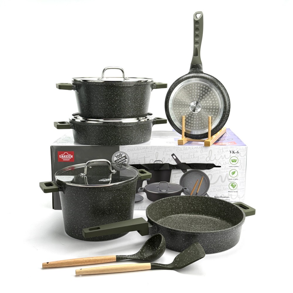 Набор UAKEEN VK-6 — это профессиональный подход к приготовлению пищи. Основа посуды — цельнолитой алюминий (Die-casting), который обеспечивает превосходную теплопроводность и равномерный нагрев. Внутреннее и внешнее гранитное покрытие отличается высокой прочностью, антипригарными свойствами и легкостью в уходе. Набор оснащен термостойкими силиконовыми ручками, которые обеспечивают безопасный и удобный хват. Индукционное дно подходит для всех типов плит. Комплектация включает в себя три кастрюли разного размера, глубокую сковороду, специальную сковороду для пиццы/блинов и аксессуары. Преимущества Прочный литой алюминий: Гарантирует быстрый и равномерный нагрев. Гранитное покрытие: Долговечное антипригарное покрытие внутри и снаружи. Безопасные ручки: Термостойкие силиконовые ручки. Универсальная совместимость: Индукционное дно подходит для всех типов плит. Максимальная комплектация: Включает 5 единиц посуды разного назначения и аксессуары. Здоровье и Безопасность: Посуда сохраняет питательные вещества (Lock in Nutrition). Технические характеристики Бренд: UAKEEN Модель: VK-6 Количество предметов: 12 Цвет: Зеленый / Темно-серый гранит Материал корпуса: Литой алюминий (Die-casting) Покрытие: Гранитное (внутреннее и внешнее) Материал ручек: Силикон Дно: Индукционное Совместимость с плитами: Все типы Габариты упаковки: 67 х 33 х 24 см Вес: 10.2 кг Комплектация набора (12 предметов) Кастрюля глубокая со стеклянной крышкой: 24 см Кастрюля со стеклянной крышкой: 28 см Сотейник (Мелкая кастрюля) со стеклянной крышкой: 30 см Сковорода глубокая: 28 см (без крышки) Сковорода для пиццы/блинница: 22 см Силиконовые кухонные принадлежности (2 шт) Губки для мытья (2 шт)