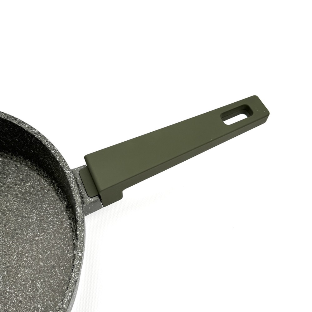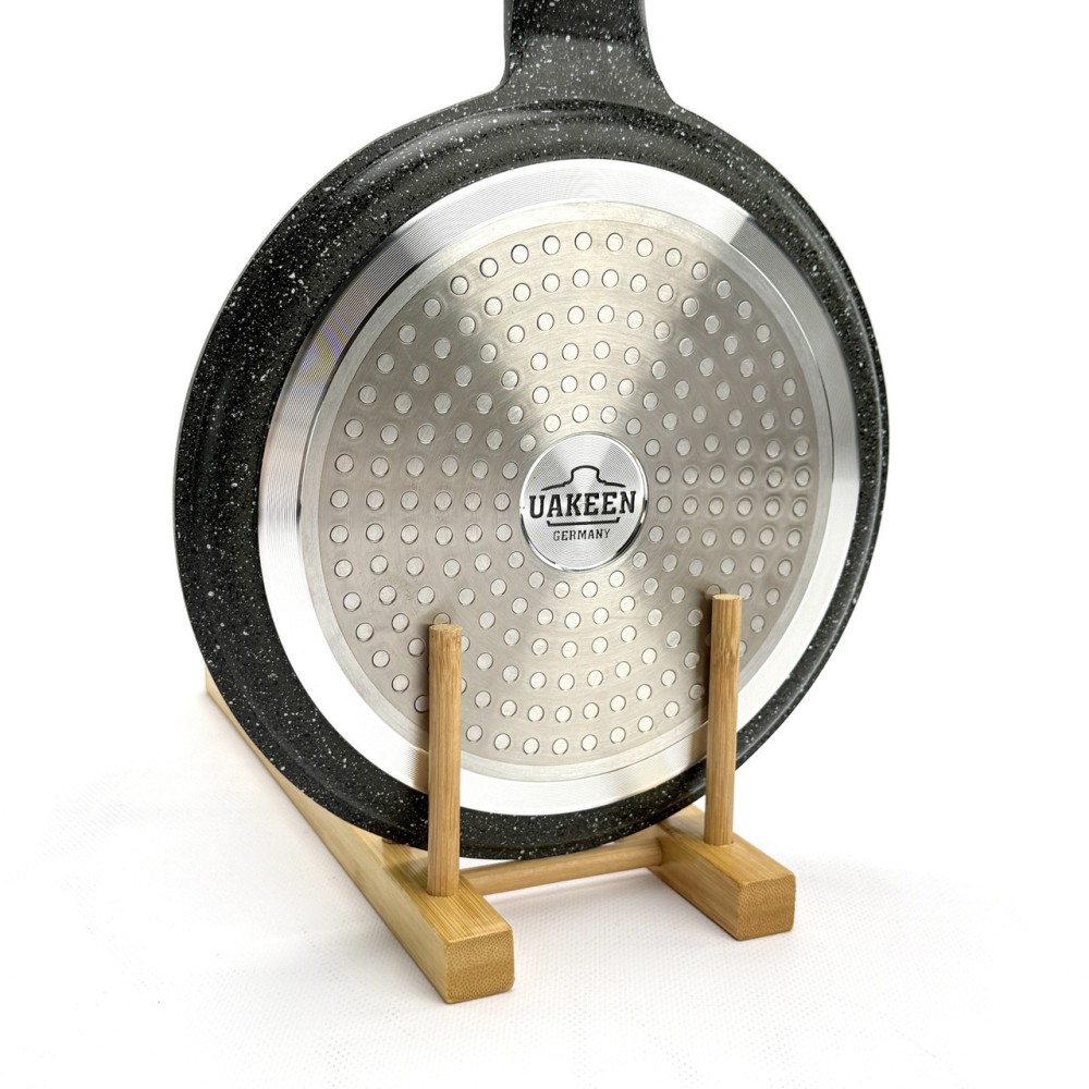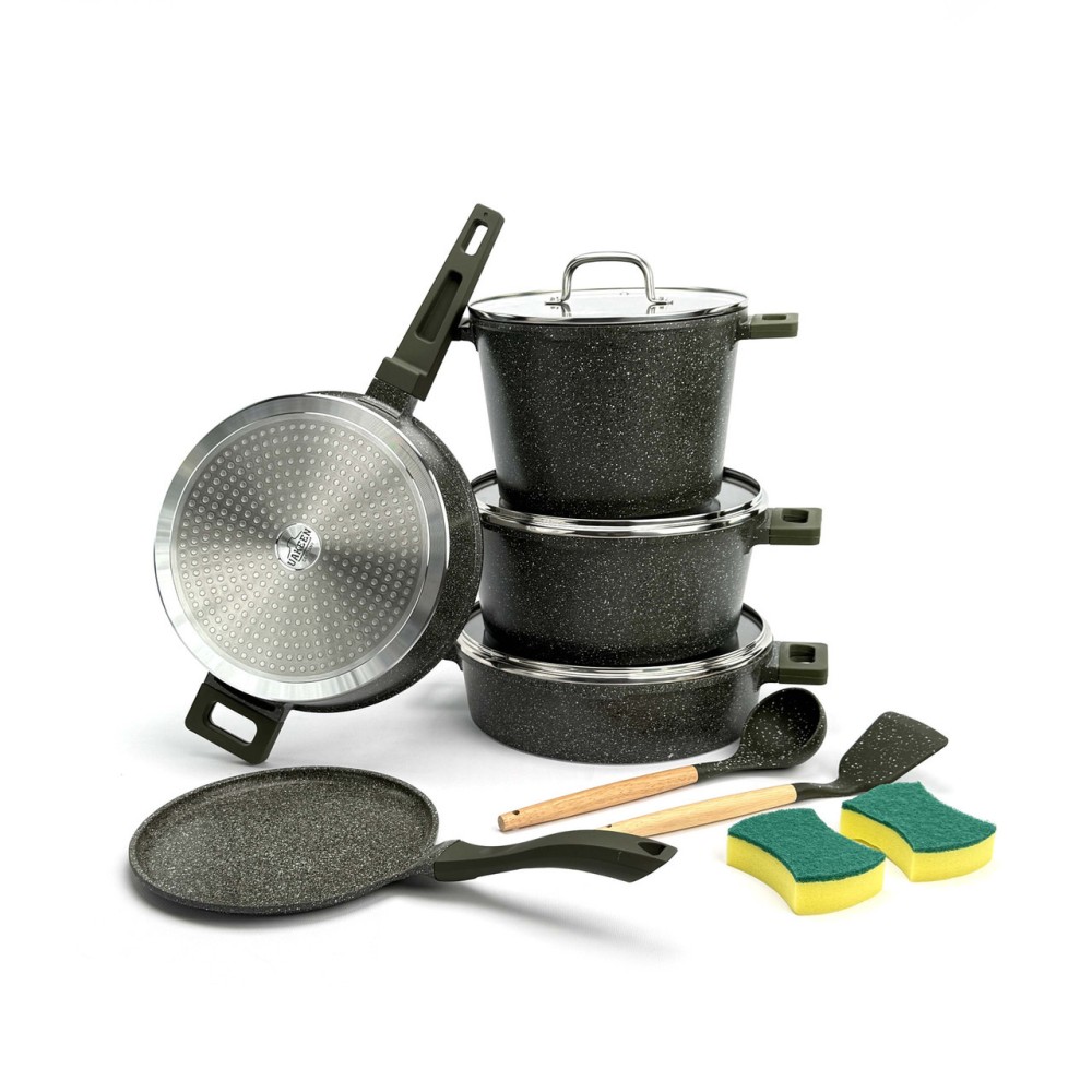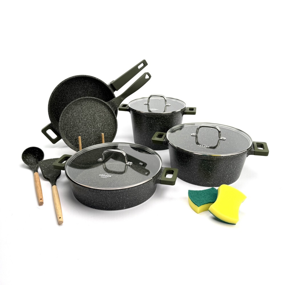 Набор UAKEEN VK-6 — это профессиональный подход к приготовлению пищи. Основа посуды — цельнолитой алюминий (Die-casting), который обеспечивает превосходную теплопроводность и равномерный нагрев. Внутреннее и внешнее гранитное покрытие отличается высокой прочностью, антипригарными свойствами и легкостью в уходе. Набор оснащен термостойкими силиконовыми ручками, которые обеспечивают безопасный и удобный хват. Индукционное дно подходит для всех типов плит. Комплектация включает в себя три кастрюли разного размера, глубокую сковороду, специальную сковороду для пиццы/блинов и аксессуары. Преимущества Прочный литой алюминий: Гарантирует быстрый и равномерный нагрев. Гранитное покрытие: Долговечное антипригарное покрытие внутри и снаружи. Безопасные ручки: Термостойкие силиконовые ручки. Универсальная совместимость: Индукционное дно подходит для всех типов плит. Максимальная комплектация: Включает 5 единиц посуды разного назначения и аксессуары. Здоровье и Безопасность: Посуда сохраняет питательные вещества (Lock in Nutrition). Технические характеристики Бренд: UAKEEN Модель: VK-6 Количество предметов: 12 Цвет: Зеленый / Темно-серый гранит Материал корпуса: Литой алюминий (Die-casting) Покрытие: Гранитное (внутреннее и внешнее) Материал ручек: Силикон Дно: Индукционное Совместимость с плитами: Все типы Габариты упаковки: 67 х 33 х 24 см Вес: 10.2 кг Комплектация набора (12 предметов) Кастрюля глубокая со стеклянной крышкой: 24 см Кастрюля со стеклянной крышкой: 28 см Сотейник (Мелкая кастрюля) со стеклянной крышкой: 30 см Сковорода глубокая: 28 см (без крышки) Сковорода для пиццы/блинница: 22 см Силиконовые кухонные принадлежности (2 шт) Губки для мытья (2 шт)