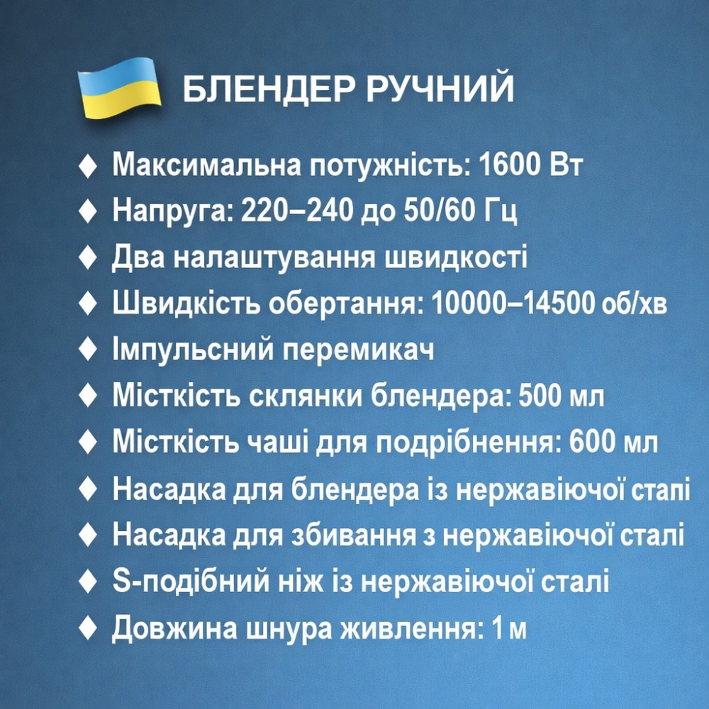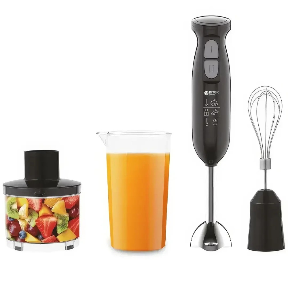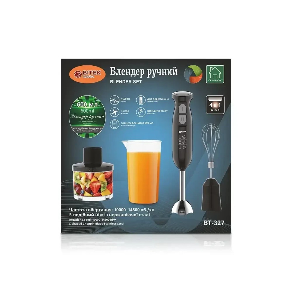 Универсальный погружной ручной блендер для кухни с измельчителем венчиком и чашей 4 в 1 BITEK BT-327 1600W Блендер ручной 4 в 1 BITEK BT-327 — это универсальный прибор с мощностью 1600 Вт, предназначенный для измельчения, взбивания и смешивания. Благодаря прочному мотору и эргономичному дизайну с куполообразной формой корпуса, он обеспечивает удобство и легкость в использовании. Прибор оснащен 4 лезвиями, которые обеспечивают безупречное и равномерное смешивание. Два режима работы позволят подобрать оптимальную скорость для различных блюд. В комплект входит мерный стакан объемом 600 мл, который идеально подходит для смешивания ингредиентов. Насадка-блендер обеспечивает эффективное взбивание кремов, муссов и десертов, а насадка-измельчитель справится с травами, орехами и сыром. Мягкая, нескользящая ручка гарантирует удобство и безопасность даже при влажных руках. Все насадки легко отсоединяются и совместимы с посудомоечной машиной, что облегчает уход за устройством. Преимущества: Мощный, но тихий мотор 1600 Вт для быстрого измельчения и взбивания Два режима скорости для оптимального выбора под разные блюда Эргономичный дизайн с нескользящей ручкой для комфортного использования Куполообразная конструкция корпуса для удобства при приготовлении Насадка с 4 лезвиями из нержавеющей стали для отличного смешивания Комплект насадок для различных задач: блендер, венчик, измельчитель Простота ухода: все насадки легко снимаются и моются в посудомоечной машине Характеристики: Тип: погружной Мощность: 1600 Вт Питание: сеть 220 В Емкость чаши для измельчения: 500 мл Емкость стакана для взбивания: 600 мл Количество скоростей: 2 Количество ножей (блендер): 4 Количество ножей (измельчитель): 2 Материал ножей и вала блендера: нержавеющая сталь Материал ножей измельчителя: нержавеющая сталь Скорость вращения: 10000-14500 об/мин Материал чаши и стакана: пластик Материал венчика: нержавеющая сталь Материал основания насадки блендера: нержавеющая сталь Форма ножа блендера: S-образный Импульсный режим: да Управление: механическое Насадки: насадка для взбивания, венчик, измельчитель Длина сетевого шнура: 1 м