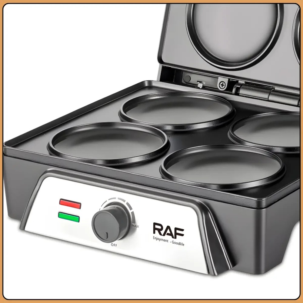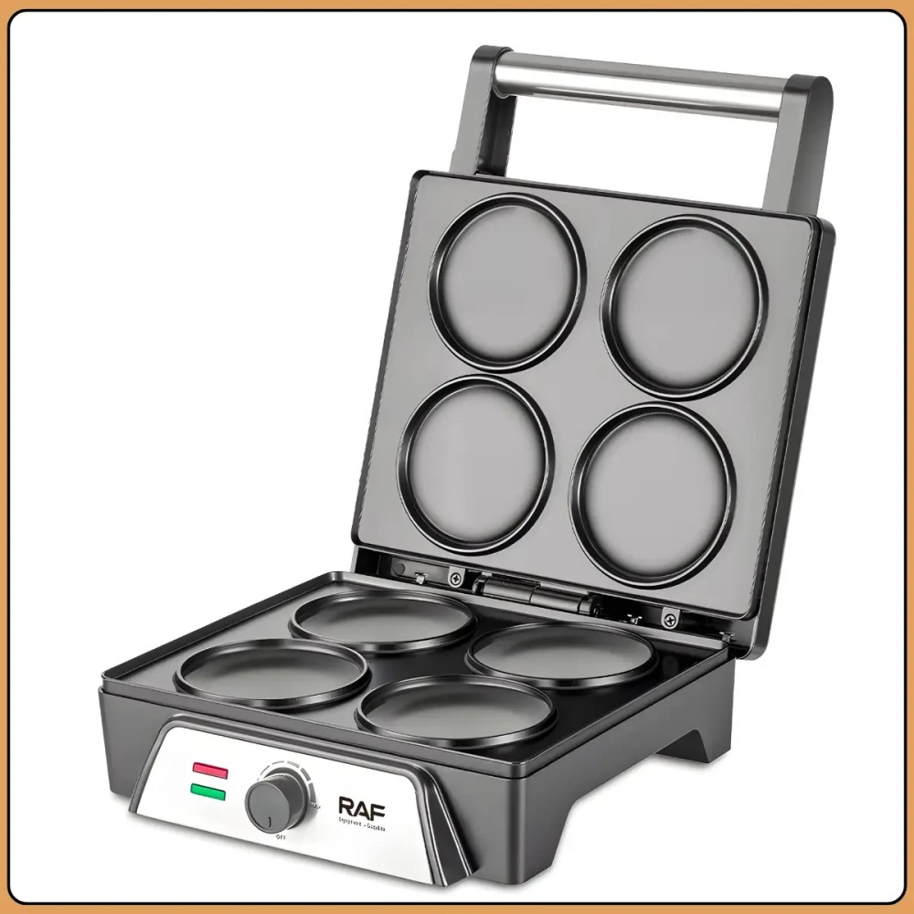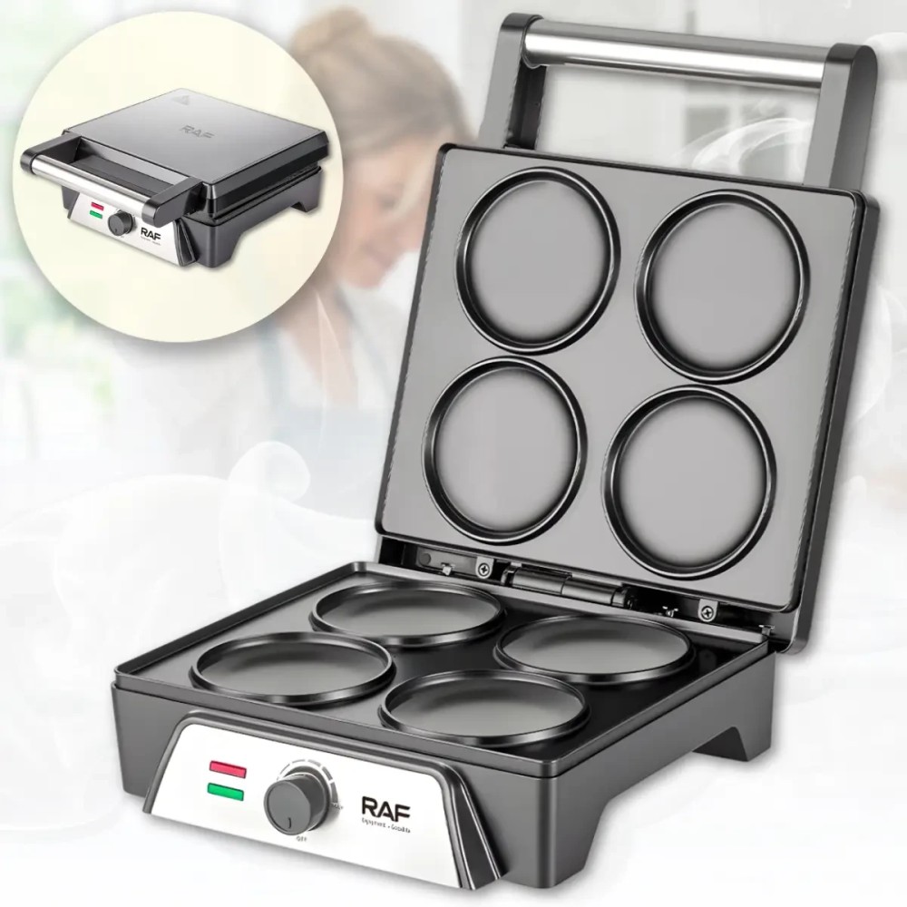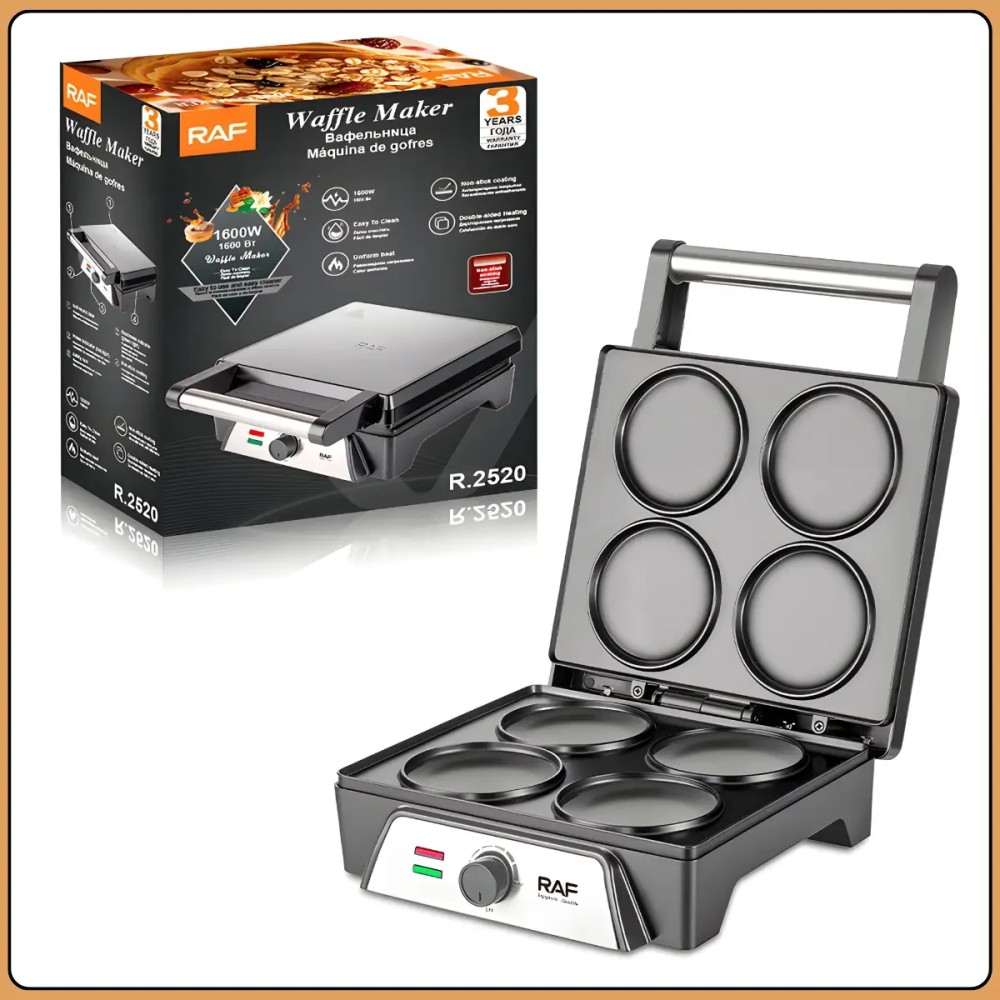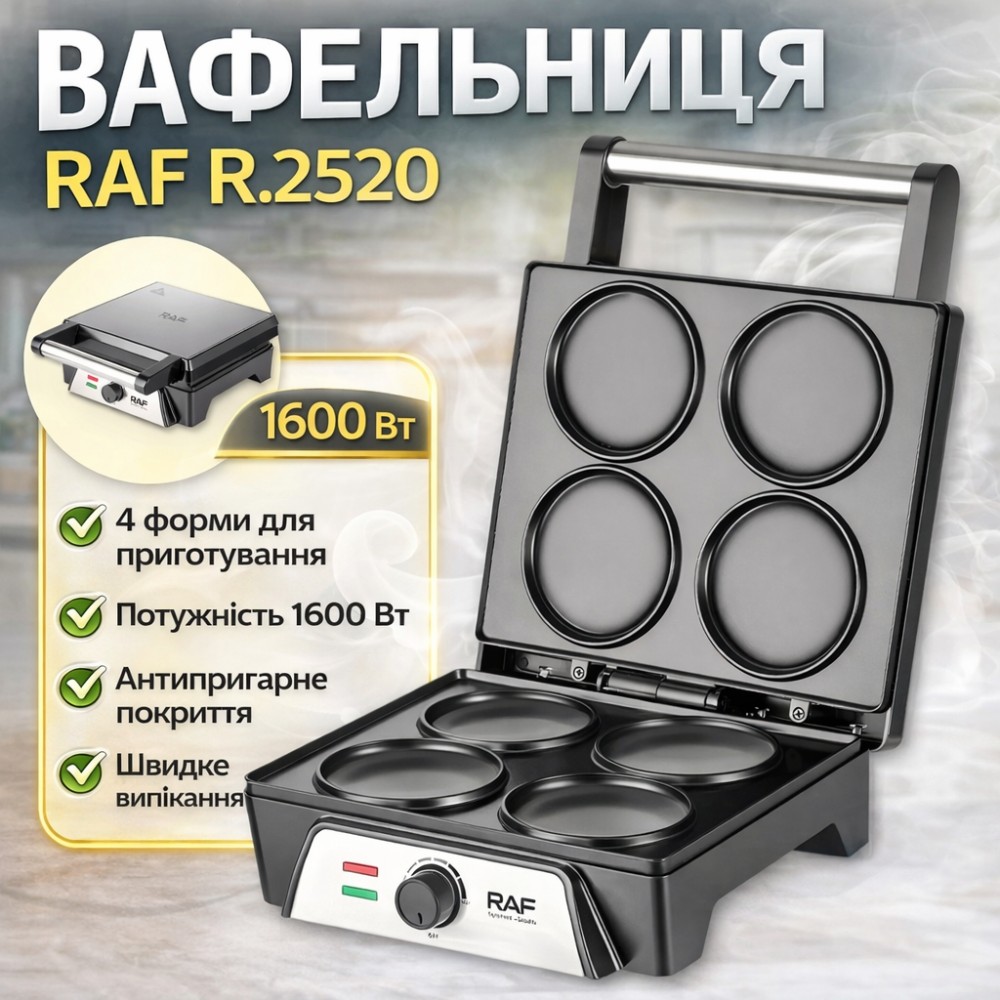 Електрична вафельниця на 4 форми з антипригарним покриттям і двостороннім нагріванням RAF R.2520 1600W Вафельниця RAF R.2520 призначена для зручного та швидкого приготування панкейків, оладок і мафінів у домашніх умовах. Потужність 1600 Вт забезпечує швидке нагрівання та стабільну робочу температуру, а двостороння система нагрівання дає змогу рівномірно пропікати вироби з обох боків. Прилад обладнаний формами на чотири кола, що дає можливість готувати кілька порцій одночасно та заощаджувати час. Антипригарне покриття робочих поверхонь запобігає прилипанню тіста і полегшує виймання готових виробів. Після використання вафельниця легко очищається без зайвих зусиль. Сріблястий корпус і компактні розміри роблять прилад практичним рішенням для будь-якої кухні, що підходить як для щоденного використання, так і для приготування сніданків для всієї родини. Переваги: Рівномірне нагрівання: однакове пропікання всіх виробів Двусторонний нагрев: стабільний результат з обох боків Антипригарне покриття: тісто не прилипає до поверхонь Форми на 4 круги: одночасне приготування кількох порцій Швидке розігрівання: скорочення часу очікування Висока потужність: ефективна робота за 1600 Вт Компактні розміри: зручне зберігання на кухні Характеристики: Тип прибора: електрична вафельниця Призначення: панкейки, олади, мафіни Потужність: 1600 Вт Напруга живлення: 220-240 В Частота сети: 50/60 Гц Система нагрева: двостороння Кількість форм: 4 круги Покриття робочих поверхонь: антипригарний Матеріал корпусу: термостійкий пластик і метал Колір корпусу: сріблястий Розмір приладу: 25×23×36 см