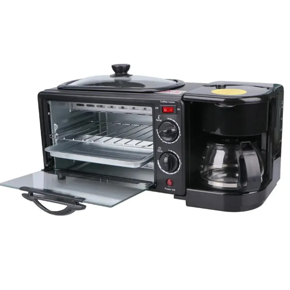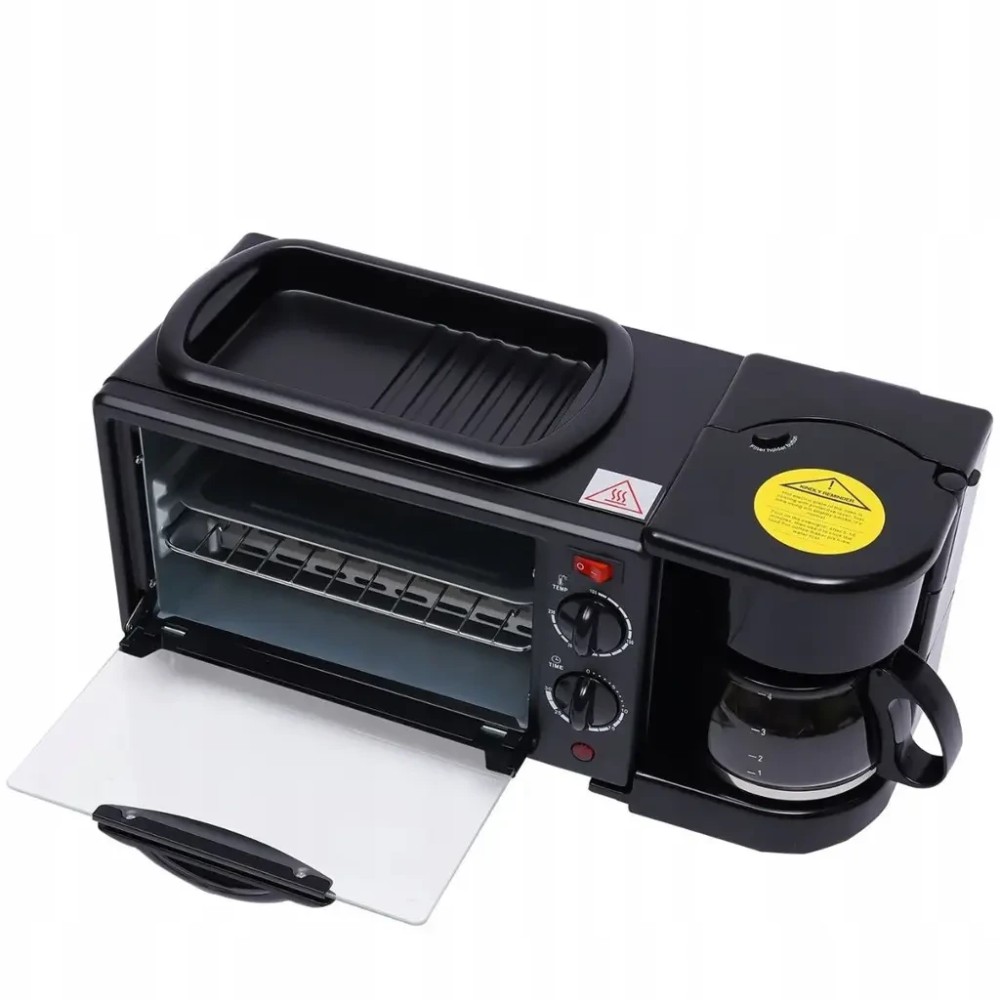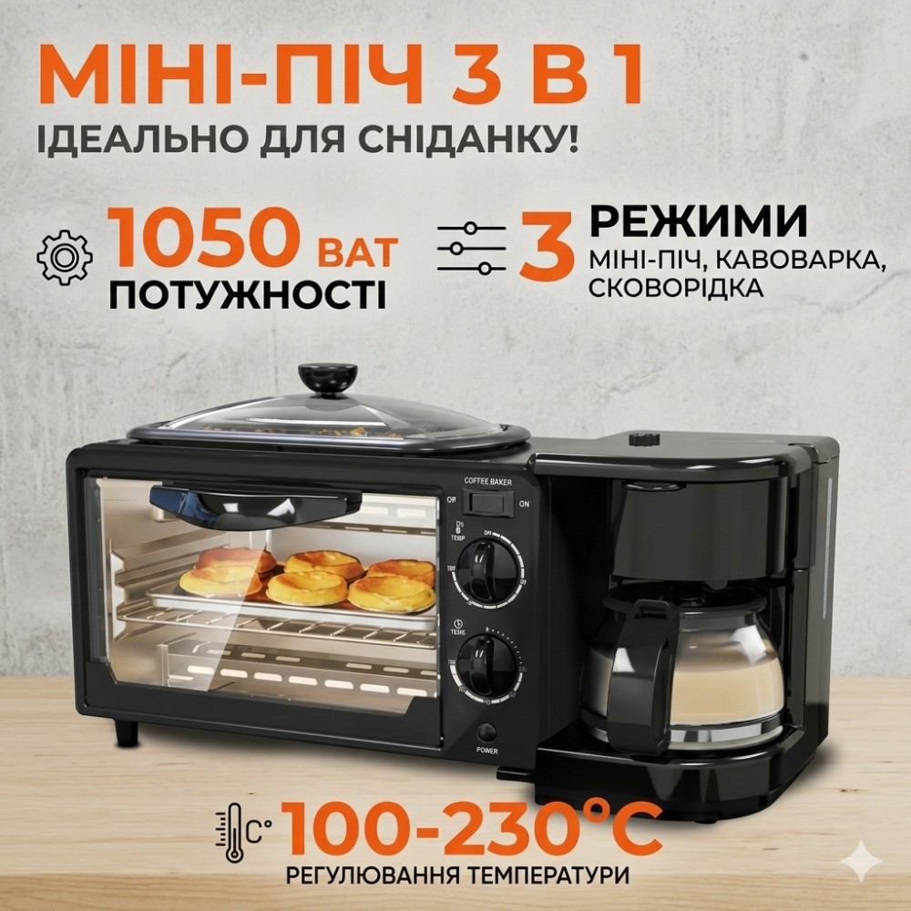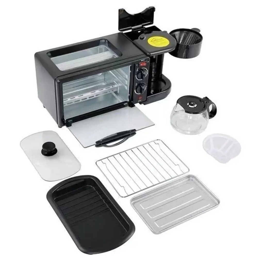 Електрична домашня піч — духовка RAF R.5308B 3 в 1 з кавомашиною й гриль-сковородою Електрична піч настільна для кухні для випікання з кавоваркою і сковородою гриль з кришкою 3в1 (машина для сніданку) RAF R.5308R — — це дивовижний маленький багатофункціональний кухонний прилад, який може приготувати до 6 чашок кави. і навіть використовуватися для приготування на сковороді! Прилад поєднує в собі відразу три функції: Кавоварка з чашею. Готує до 6 чашок одночасно за лічені хвилини, тому ви можете насолоджуватися чашкою кави, поки готується їжа. Багатофункціональна піч. Обладнана 30-хвилинним таймером зі скляними дверцятами й може вмістити до 4 скибочок хліба, 7-дюймову піцу та може використовуватися для приготування запіканок, печива та інших смачних страв. Сковорода з антипригарним покриттям. Пропонує багато місця для смаження яєць, омлетів, млинців, ковбас, бекону та інших продуктів для сніданку — і постачається зі скляною кришкою. Характеристики: Потужність: 1050 Вт Об'єм духовки: 9 л. Об'єм кавоварки: 500 мл (6 чашок) Таймер: 0-30 хвилин Регулювання температури: 100 - 230 °C Вага: 4 кг Комплектація Електрична піч духовка 3 в 1 Інструкція російською та англійською мовами Фірмове паковання