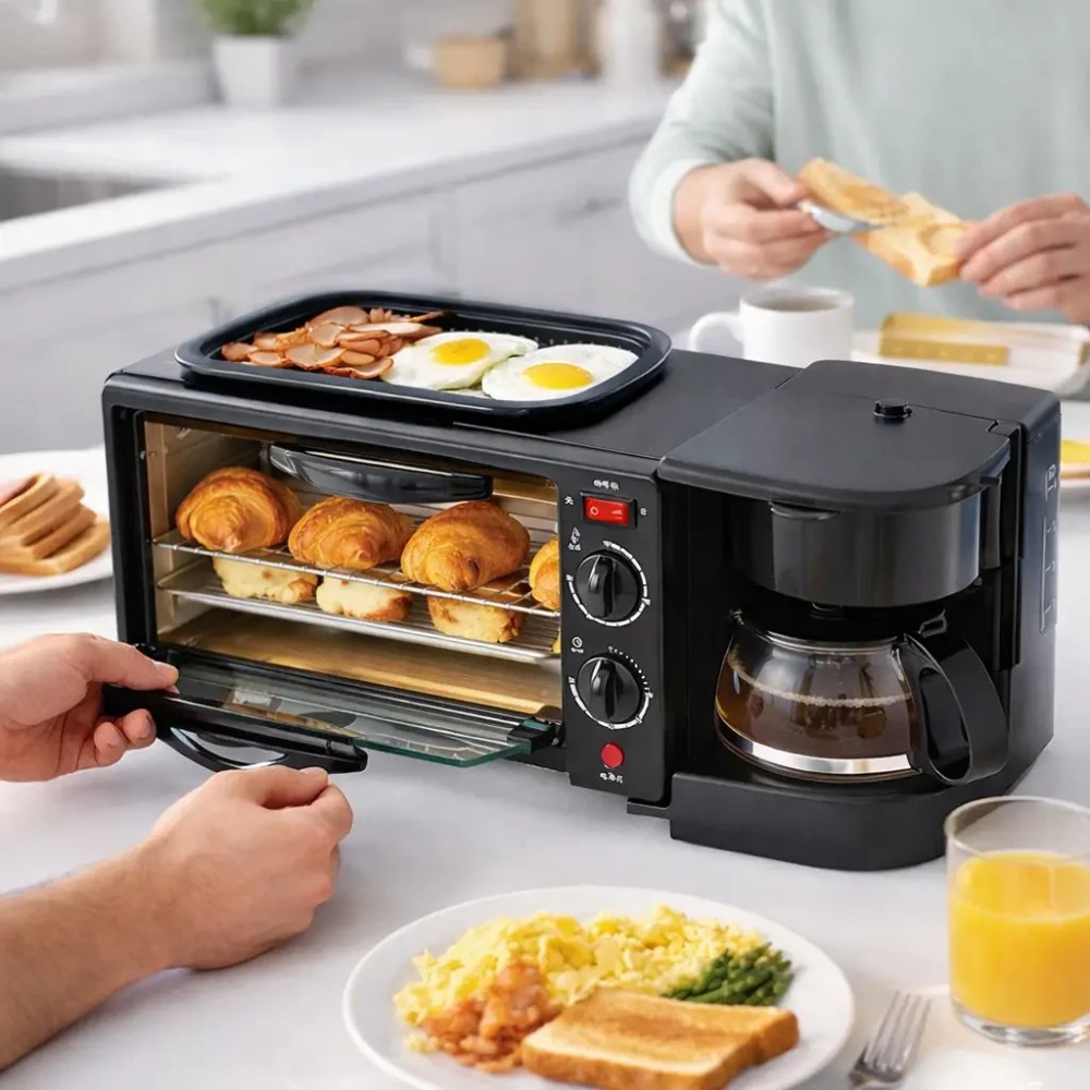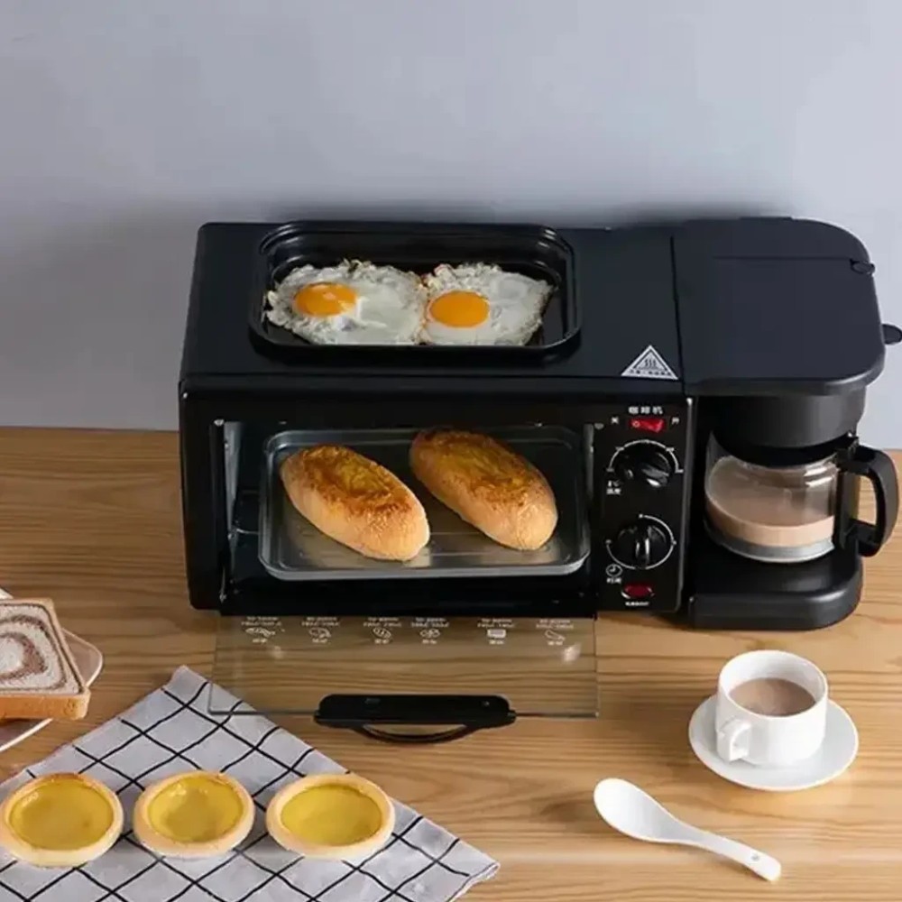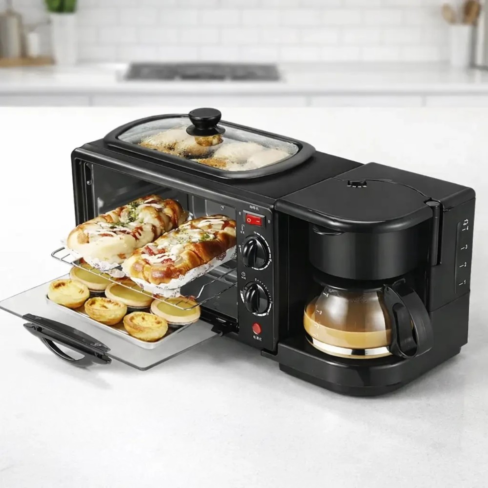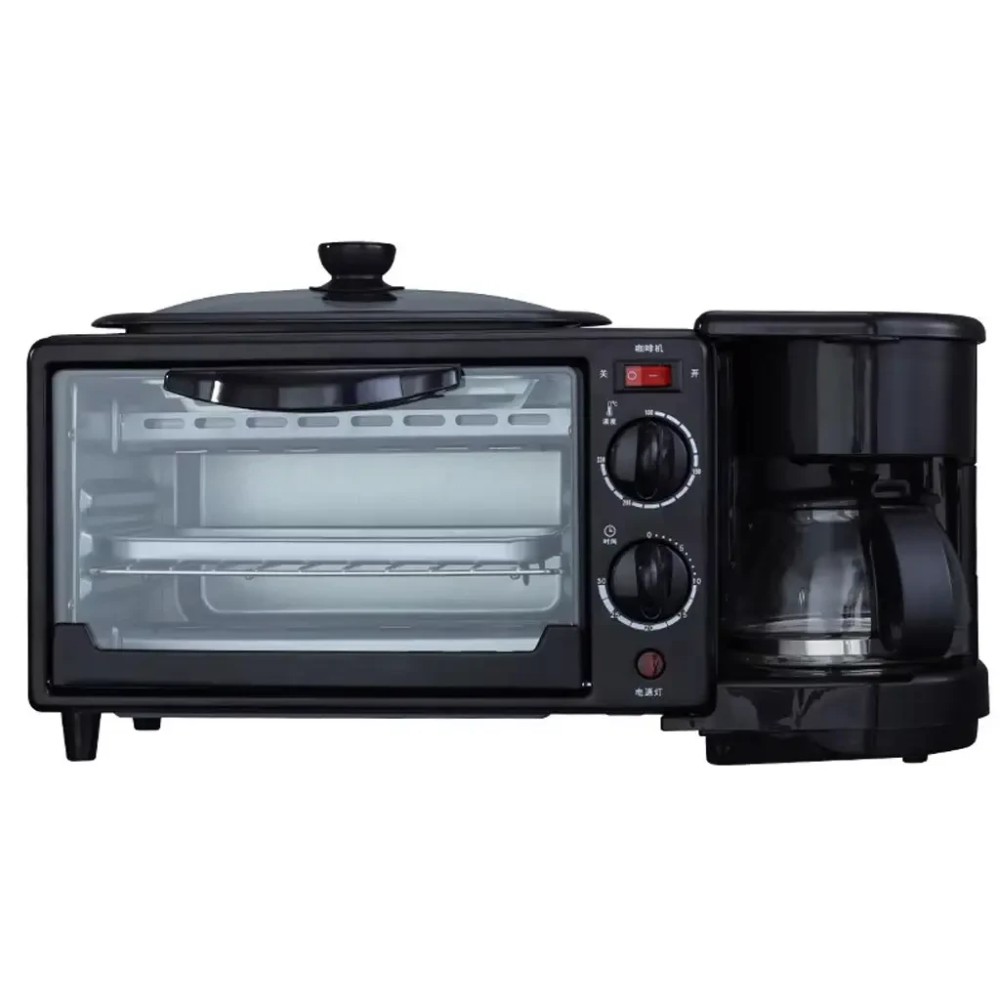 Електрична домашня піч — духовка RAF R.5308B 3 в 1 з кавомашиною й гриль-сковородою Електрична піч настільна для кухні для випікання з кавоваркою і сковородою гриль з кришкою 3в1 (машина для сніданку) RAF R.5308R — — це дивовижний маленький багатофункціональний кухонний прилад, який може приготувати до 6 чашок кави. і навіть використовуватися для приготування на сковороді! Прилад поєднує в собі відразу три функції: Кавоварка з чашею. Готує до 6 чашок одночасно за лічені хвилини, тому ви можете насолоджуватися чашкою кави, поки готується їжа. Багатофункціональна піч. Обладнана 30-хвилинним таймером зі скляними дверцятами й може вмістити до 4 скибочок хліба, 7-дюймову піцу та може використовуватися для приготування запіканок, печива та інших смачних страв. Сковорода з антипригарним покриттям. Пропонує багато місця для смаження яєць, омлетів, млинців, ковбас, бекону та інших продуктів для сніданку — і постачається зі скляною кришкою. Характеристики: Потужність: 1050 Вт Об'єм духовки: 9 л. Об'єм кавоварки: 500 мл (6 чашок) Таймер: 0-30 хвилин Регулювання температури: 100 - 230 °C Вага: 4 кг Комплектація Електрична піч духовка 3 в 1 Інструкція російською та англійською мовами Фірмове паковання