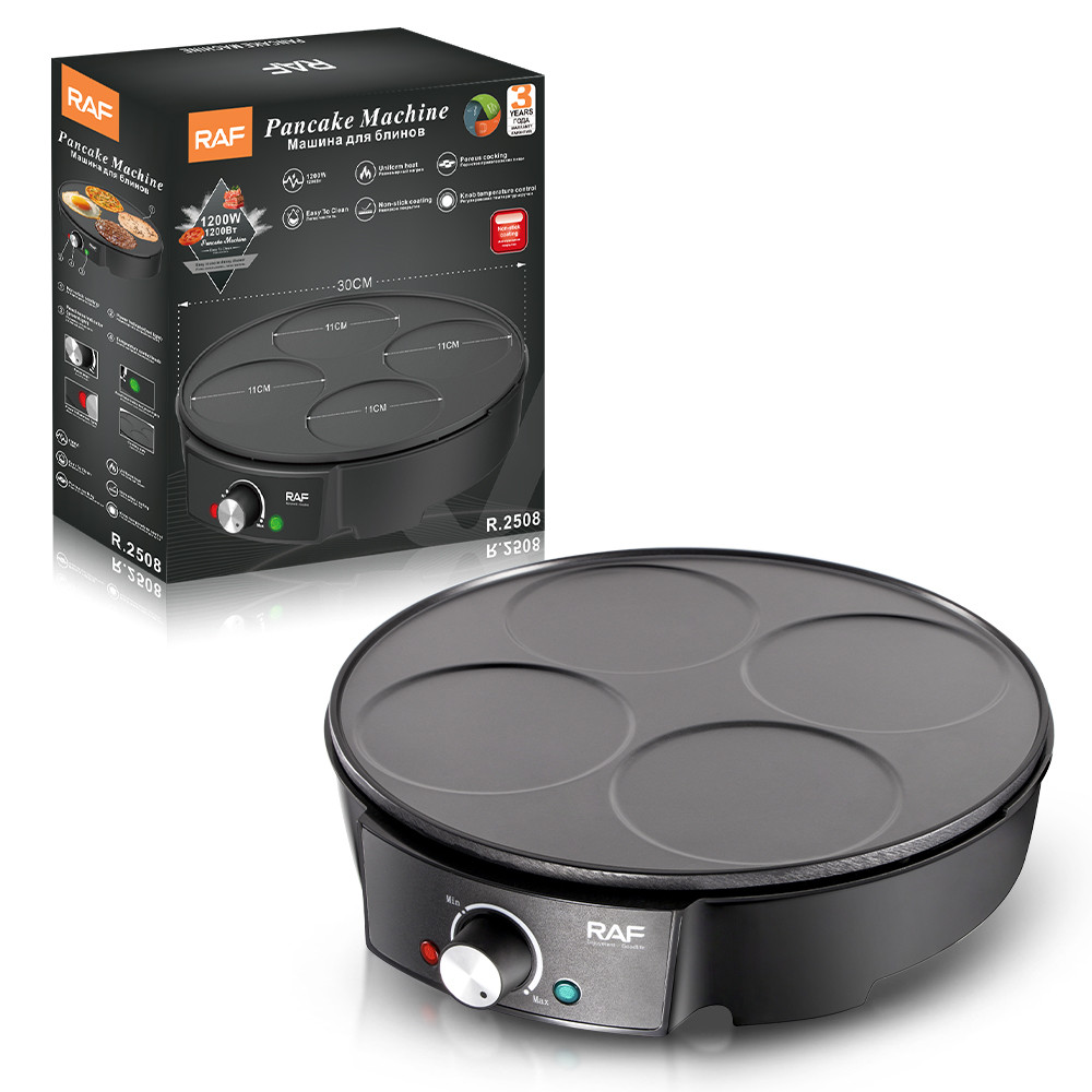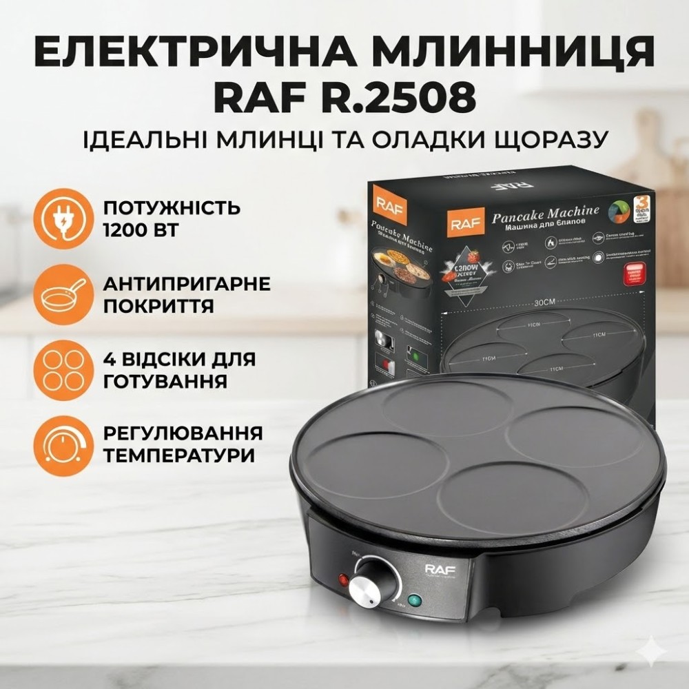 Опис Електрична млинець RAF R.2508 — це потужний пристрій для швидкого приготування ідеальних сніданків. Прилад обладнаний робочою поверхнею з 4 заглибленнями, що дає змогу одночасно випікати чотири акуратних млинці, панкейка, оладушка або сирника однакової форми. Завдяки високій потужності 1200 Вт поверхня нагрівається миттєво та рівномірно, забезпечуючи ідеальне просмаження. Якісне антипригарне покриття дає змогу готувати з мінімальною кількістю олії або зовсім без нього, а також полегшує догляд за технікою. Регульований термостат дає можливість контролювати температуру для отримання бажаного ступеня рум'якості. 2) Переваги Продуктивність — приготування 4 виробів одночасно неабияк заощаджує час. Висока потужність 1200 Вт — швидке нагрівання та стабільна температура. Ідеальна форма — заглиблення не дає тісту розтікатися, панкейки виходять рівними та однаковими. Антипригарне покриття — тісто не прилипає, млинці легко перевертаються. Терморегулятор — плавне регулювання температури для різних типів тіста. Універсальність — підходить для панкейків, оладок, драніків, сирників і яєчні. Простота догляду — поверхня легко очищається вологою серветкою. 3) Характеристики Тип: електрична млинець/оладниця. Потужність: 1200 Вт. Кількість відділень: 4 шт. Покриття: антипригарне. Керування: механічне (поворотний регулятор). Терморегулятор: є. Індикатори: живлення та нагрівання. Матеріал корпусу: термостійкий пластик, метал. Живлення: мережа 220 В. Цвет: чорний. 4) Комплектація Млинок RAF R.2508. Інструкція користувача. Заводське паковання.