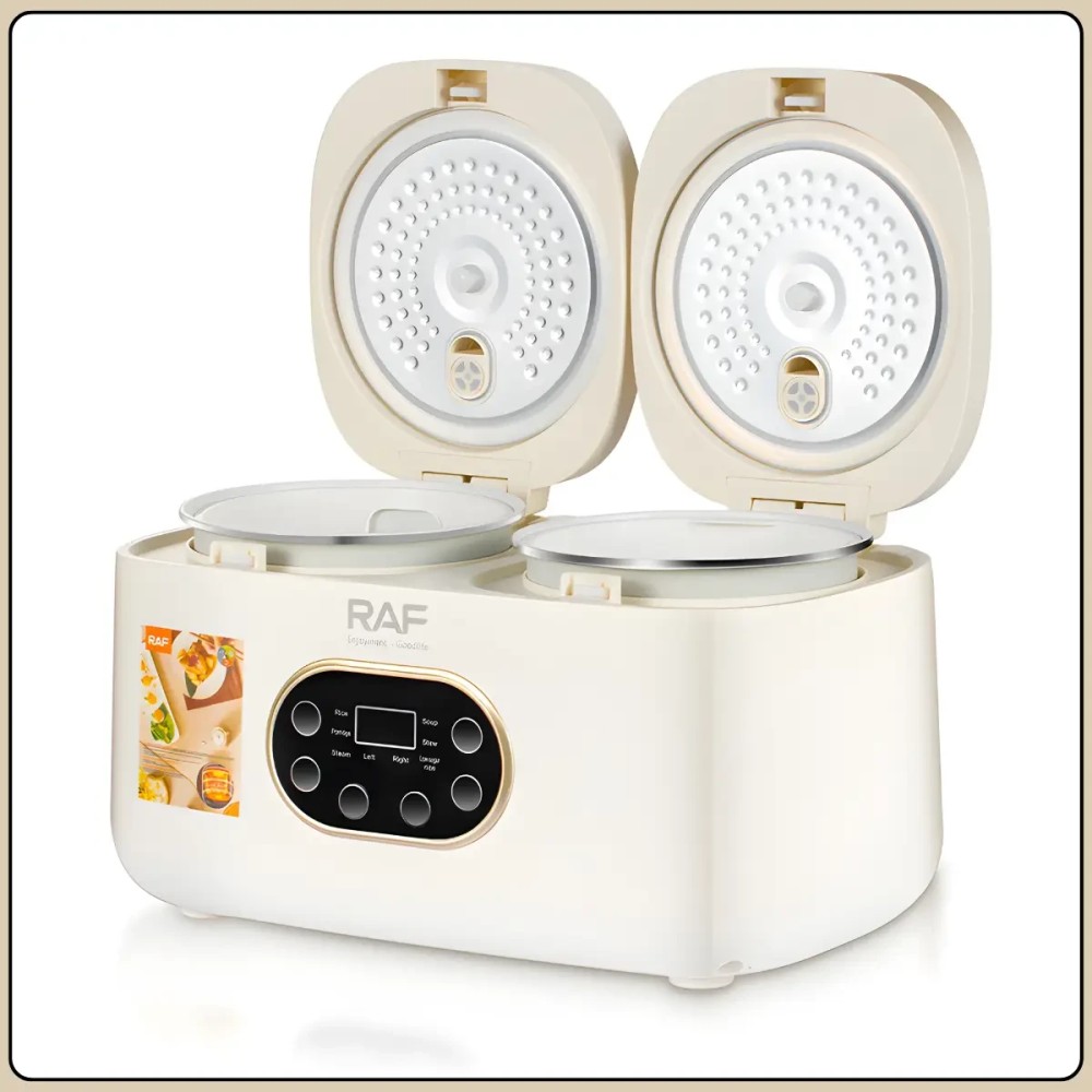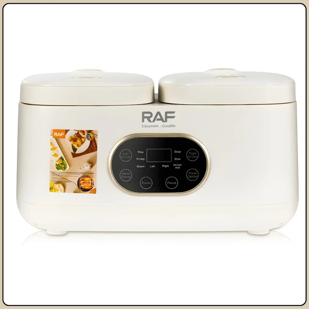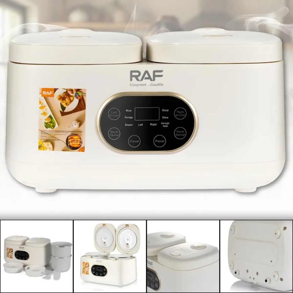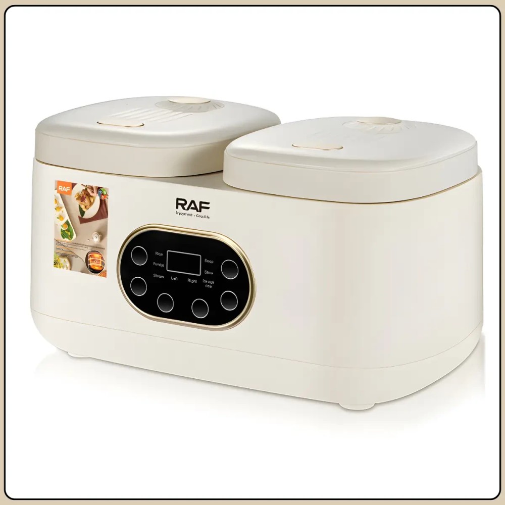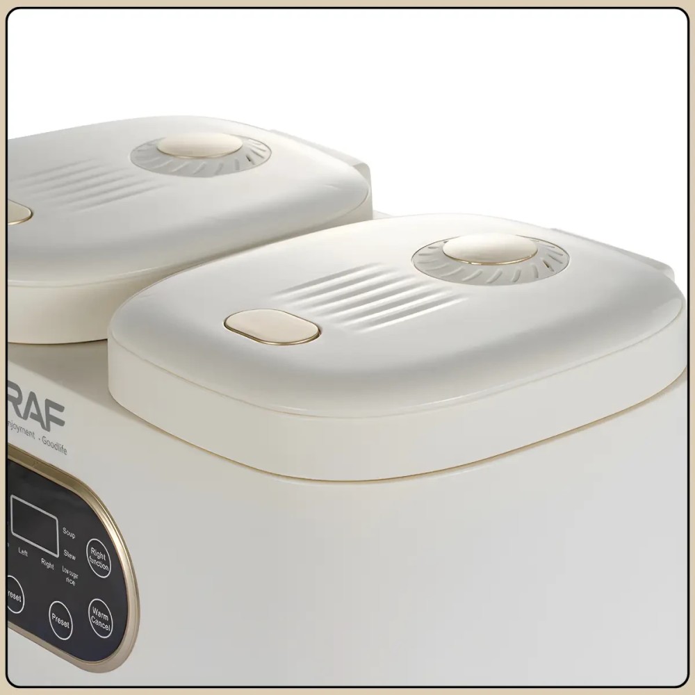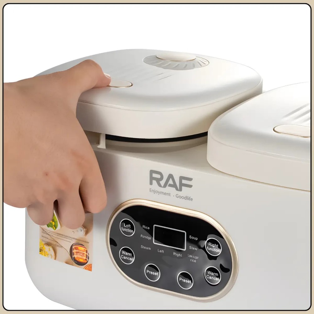 Електрична мультиварка з подвійною чашею 1 л + 1 л і сенсорним керуванням RAF R.5419 800W Мультиварка з подвійною чашею RAF R.5419 призначена для одночасного приготування двох різних страв без змішування смаків. Дві окремі чаші об'ємом по 1 літру дають змогу зручно готувати гарніри, основні страви, каші або рис, заощаджуючи час і електроенергію. Сенсорне керування з цифровим дисплеєм робить використання простим і наочним, а компактні розміри дають змогу розмістити пристрій навіть на невеликій кухні. Антипригарне покриття чаш полегшує догляд і запобігає пригоранню продуктів під час готування. Мультиварка обладнана 14 автоматичними програмами, що робить її універсальним рішенням для повсякденного використання. Бежевий пластиковий корпус має акуратний вигляд та легко вписується в інтер'єр сучасної кухні. Переваги: Подвійна чаша: одночасне приготування двох страв без змішування ароматів Роздільна потужність: по 400 Вт на кожну чашу для стабільної роботи 14 автоматичних програм: широкий вибір режимів для різних страв Антипригарне покриття: просте очищення після використання Сенсорне керування: зручний вибір програм і налаштувань Цифровий дисплей: наочне зображення режимів і часу Характеристики: Тип пристрою: мультиварка Модель: RAF R.5419 Загальний обсяг: 2 літри Об'єм чаш: 1 л + 1 л Потужність: 800 Вт Потужність кожної чаші: 400 Вт Кількість програм: 14 Покриття чаш: антипригарний Керування: сенсорне Дисплей: цифровий Матеріал корпусу: пластик Колір корпусу: бежевий Напруга: 220 В Розмір: 37×20×23 см Комплектація Мультиварка Дві внутрішні чаші (з антипригарним покриттям) Два лотки-пароварки Мірний стакан Ложка/ лопатка