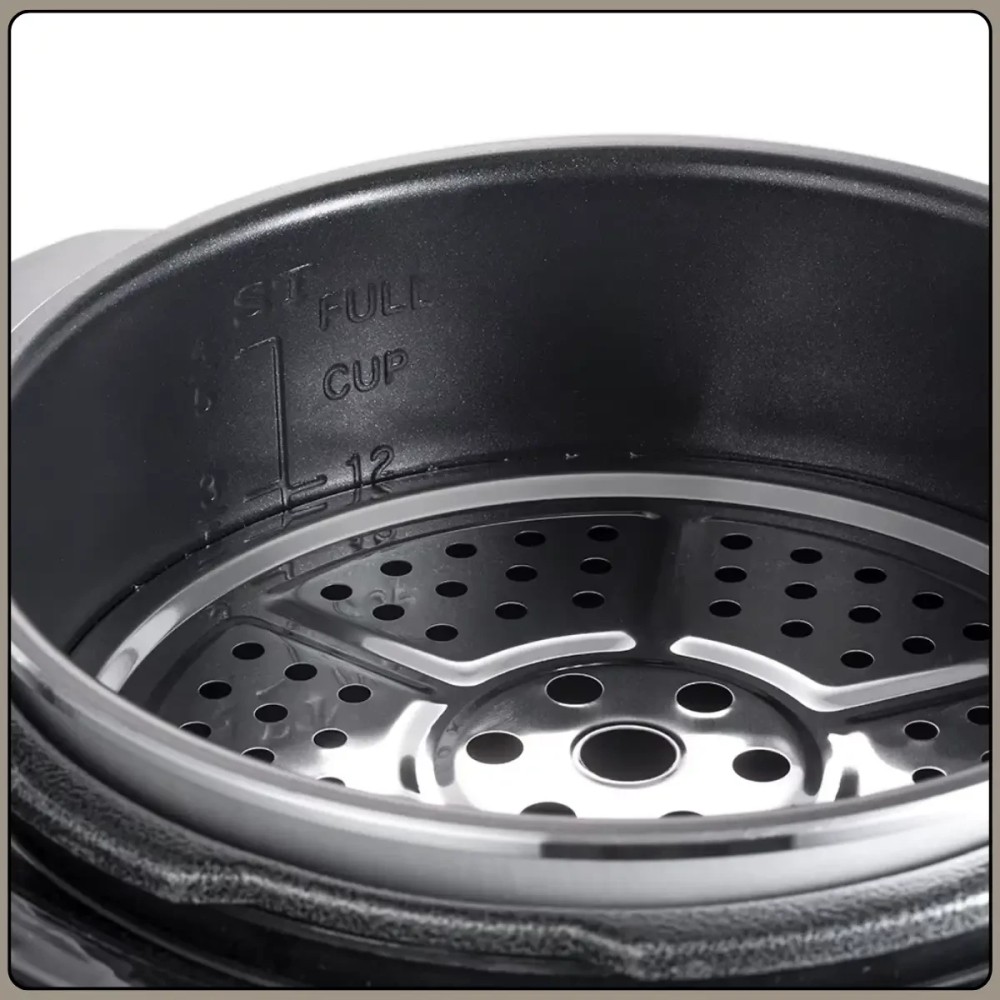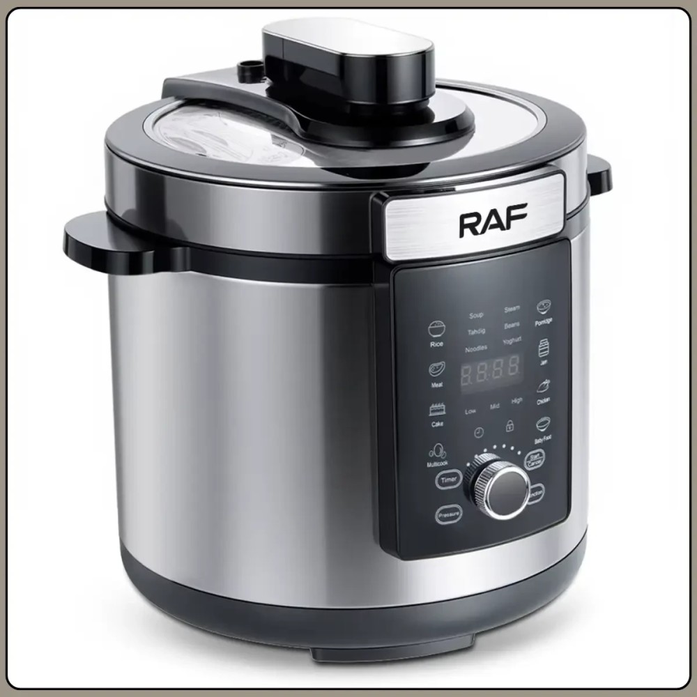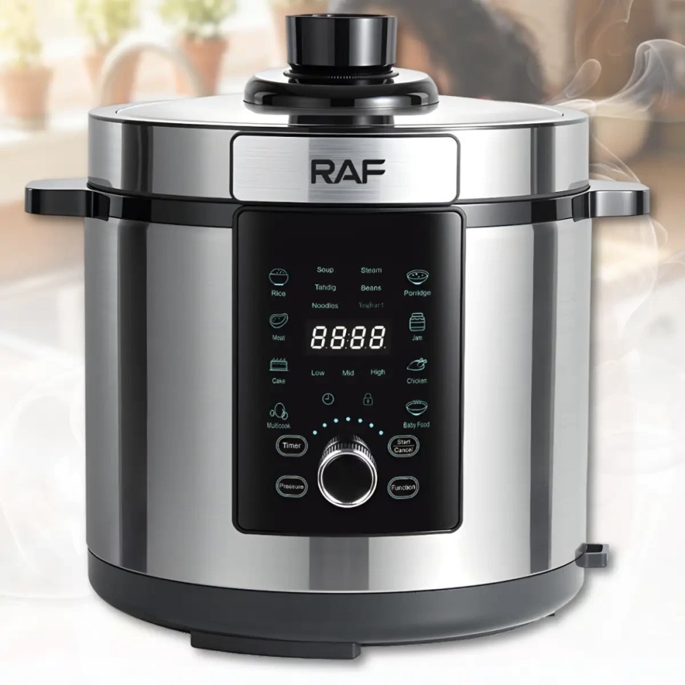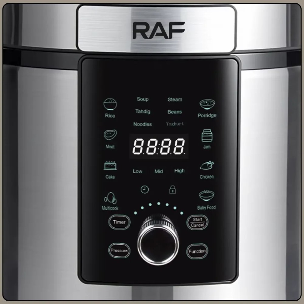 Електрична мультиварка на 6 л із цифровим дисплеєм і таймером RAF R.184 1000W Мультиварка RAF R.184 — це сучасний багатофункційний прилад для кухні, , який поєднує в собі зручність і ефективність. З потужністю 1000 Вт і місткою чашею об'ємом 6 літрів вона підходить для приготування страв на всю сім'ю. Електронне керування з цифровим дисплеєм дає змогу легко вибирати одну з безлічі програм і режимів, включно з приготуванням на парі, рисом, каші, тушкуванням, а також підтриманням постійної температури. Прилад виготовлений у міцному корпусі з неіржавкої сталі та металу, що забезпечує довговічність і стійкість до механічних пошкоджень. Антипригарне покриття внутрішньої чаші полегшує очищення та запобігає прилипанню їжі. Компактні розміри та стильний сріблястий колір корпусу роблять мультиварку практичним і естетичним доповненням будь-якої кухні. Переваги: Багато програм: різноманітні режими приготування страв Відкладений старт: можливість запрограмувати початок готування до 24 годин Великий обсяг чаші: 6 літрів, зручно для сім'ї Антипригарне покриття: легко чистити та готувати без прилипання Електронне керування: зручний цифровий дисплей Приготування на парі: зберігає вітаміни та корисні речовини Підтримка температури: страви залишаються теплими до подавання Характеристики: Тип: мультиварка Потужність: 1000 Вт Об'єм чаші: 6 л Тип керування: електронний, цифровий дисплей Матеріал корпусу: неіржавка сталь/метал Покриття чаші: антипригарний Програми: приготування на парі, рис, каші, тушкування, підтримання температури Таймер: функція відкладеного старту до 24 годин Колір корпусу: сріблястий Розмір: 35×34 см Напруга: 220-240 В, 50-60 Гц