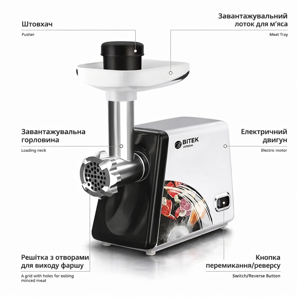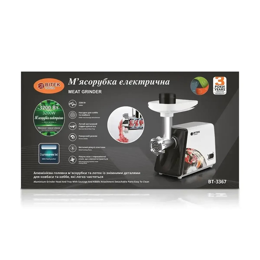Електрична м'ясорубка в металевому корпусі на 3200 Вт BITEK BT-3367 М'ясорубка для ковбас і кебе М'ясорубка електрична BITEK BT-3367 — це універсальний прилад, за допомогою якого Ви легко й безпечно переробляєте м'ясо й овочі для різноманітних страв. М'ясорубка має класичний дизайн, який матиме чудовий вигляд у будь-якому інтер'єрі. Пристрій має функції захисту від перегрівання та реверс. До комплектації входять решітки для фаршу, насадка для ковбас. Система двигуна сама контролюватиме свою роботу та запобігатиме переобтяженню або перегріванню, що забезпечує довговічність приладу та мінімізацію його зламання. М'ясорубка працювати набагато ефективніше, довше та м'якше, підтверджуючи свою зносостійкість завдяки тому, що центральна частина, на яку припадає основне навантаження, виготовлена з металу! Характеристики: Тип: М'ясорубка Матеріал корпусу: метал Призначення: Побутове Номінальна напруга: 220 В Номінальна потужність: 2500 Вт Прогумовані ніжки: так Реверс: да Насадки: Для ковбасних виробів Кількість решіток: 2