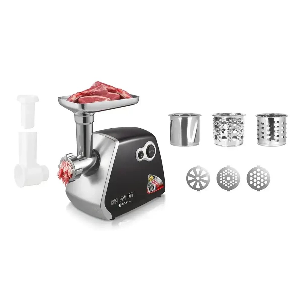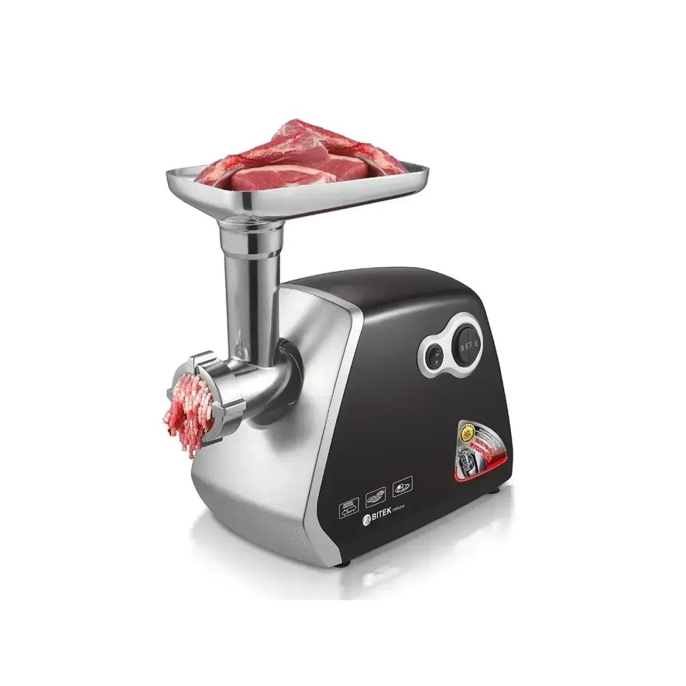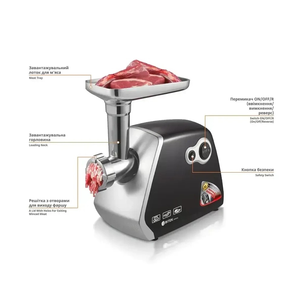 Електрична М'ясорубка BITEK BT-3400 3500W з металевим корпусом і різними насадками М'ясорубка BITEK BT-3400 — надійний інструмент для швидкого та зручного приготування м'ясних і овочевих страв. Вона забезпечує можливість легко та швидко отримати дрібний і великий фарш, приготувати паштети, м'ясні делікатеси, а також перемолоти фрукти й овочі. З м'ясорубкою BITEK BT-3400 ви зможете неабияк скоротити час і зусилля, які витрачається на приготування їжі, завдяки її зручності й ефективності. Переваги: Незамінна помічниця на кухні: М'ясорубка BITEK BT-3400 стане вашим надійним помічником під час приготування різних м'ясних і овочевих страв, полегшуючи вам процес кулінарної творчості. Безпека використання: З м'ясорубкою BITEK BT-3400 ви можете бути впевнені у своїй безпеці завдяки захисту електродвигуна від перевантаження й надійній системі реверсу. Економія часу та сил: Завдяки високій продуктивності та зручності використання, м'ясорубка BITEK BT-3400 допоможе вам заощадити час і зусилля під час приготування їжі. Привабливий дизайн: Елегантний і компактний дизайн м'ясорубки BITEK BT-3400 прекрасно доповнить інтер'єр вашої кухні, роблячи її не тільки функціональною, але й стильною. Характеристики: Матеріал лотка: метал Матеріал корпусу: пластик/метал Прогумовані ніжки: забезпечують надійне кріплення й захист поверхні столу. Потужність: 3500 Вт Продуктивність: 2 кг/хв Захист двигуна від перевантаження: гарантує довгий термін експлуатації пристрою. Система реверсу: гарантує безпеку використання та зручність під час експлуатації.