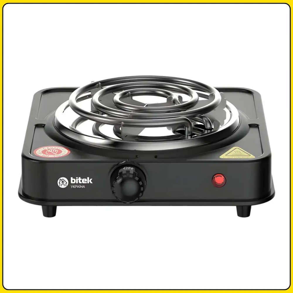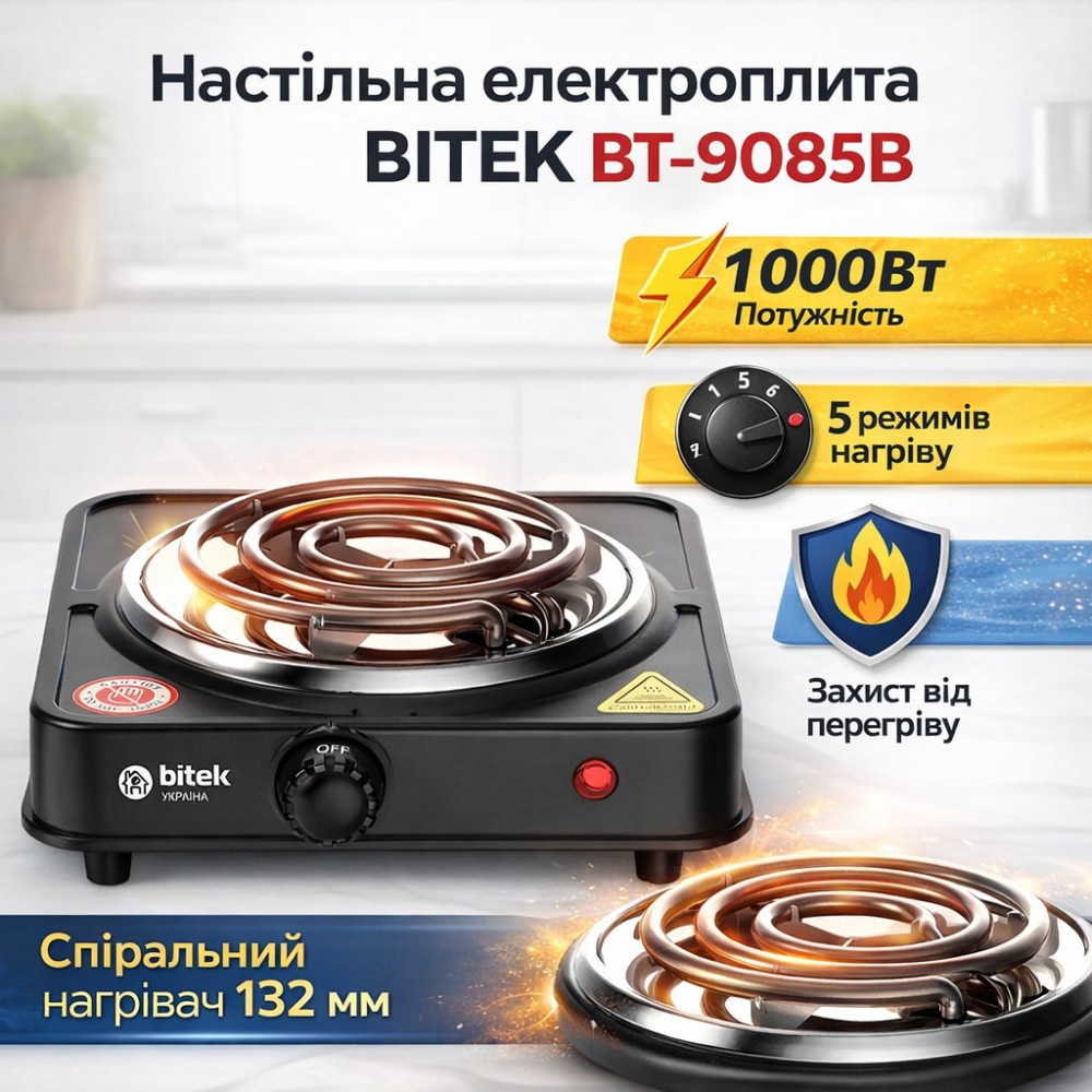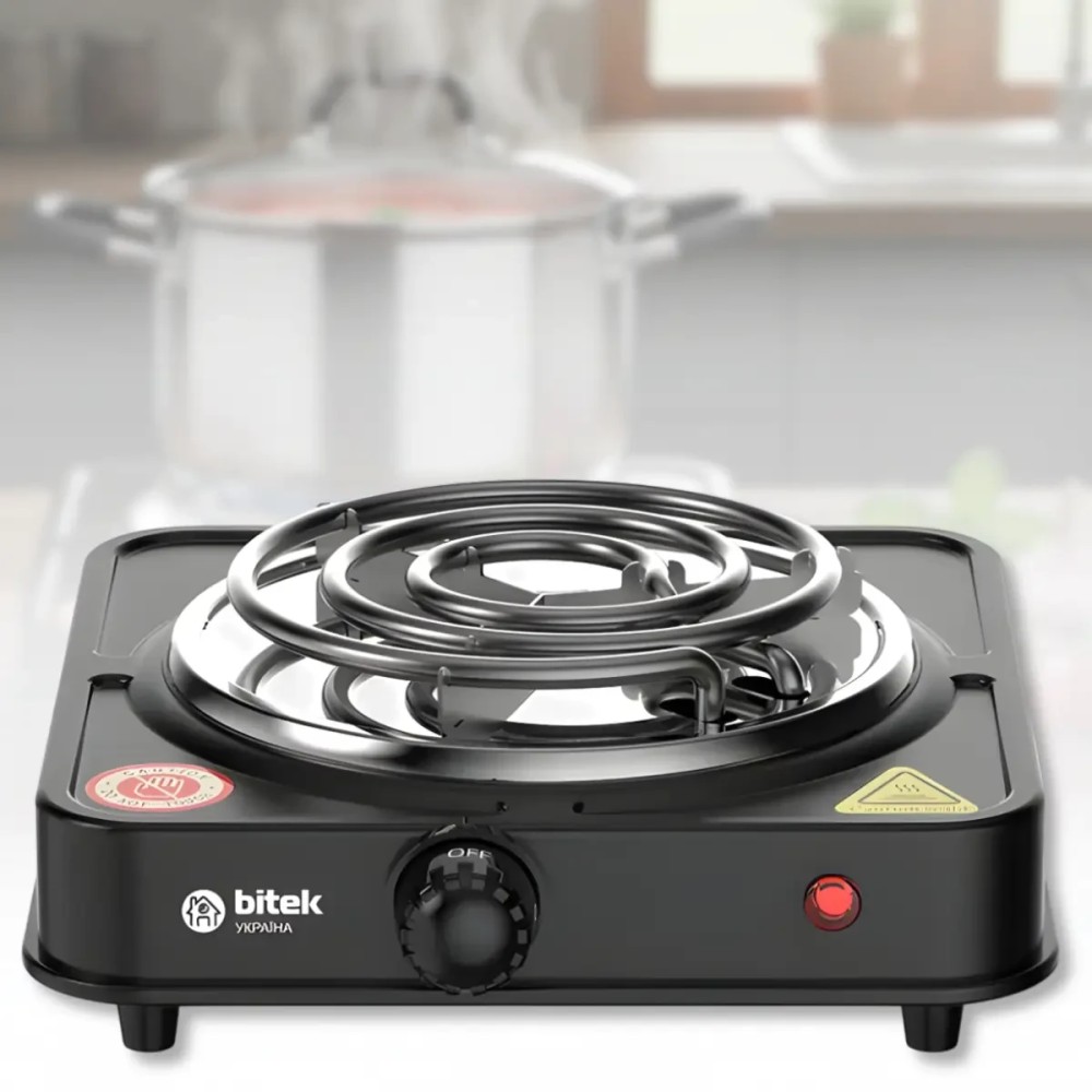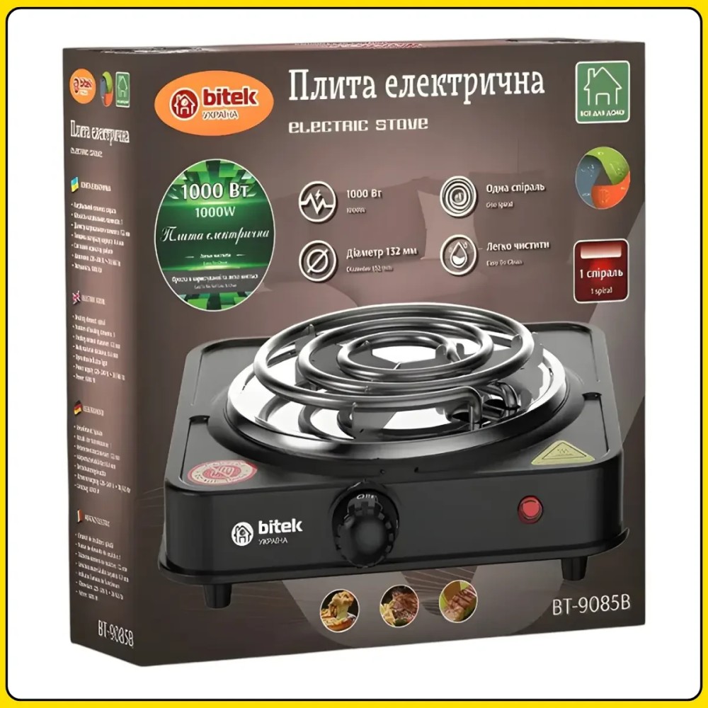 Електрична настільна плита зі спіральним нагрівачем на одну конфорку BITEK BT-9085B 1000W Електрична настільна плита BITEK BT-9085B призначена для приготування й розігрівання їжі в домашніх умовах, на дачі, в офісі або тимчасовому будинку. Модель обладнана однією конфоркою зі спіральним нагрівальним елементом діаметром 132 мм, який швидко нагрівається й забезпечує стабільну роботу під час повсякденного використання. Компактний формат дає змогу зручно розмістити плиту навіть на невеликій кухонній поверхні. Плита має потужність 1000 Вт і п'ять температурних режимів, що дає змогу регулювати інтенсивність нагрівання залежно від типу страви. Емальоване покриття полегшує догляд і захищає поверхню від забруднень. Світловий індикатор роботи дає змогу візуально контролювати стан пристрою, а міцний металевий корпус забезпечує надійність і тривалий термін експлуатації. Переваги: Компактні розміри: зручна для невеликих приміщень і мобільного використання Спіральний нагрівач: швидке розігрівання й ефективне теплопередавання Потужність 1000 Вт: оптимальна для варіння й розігрівання їжі П'ять режимів нагрівання: точне настроювання температури Світловий індикатор: контроль роботи плити Емальоване покриття: простота очищення й догляду Міцний корпус: стійкість до механічних навантажень Стійка основа: безпечне розміщення на столі Характеристики: Тип пристрою: електрична настільна плита Кількість конфорок: 1 Тип нагрівального елемента: спіральний Діаметр нагрівального елемента: 132 мм Потужність: 1000 Вт Кількість температурних режимів: 5 Індикатор роботи: світловий Покриття: эмаль Матеріал корпусу: метал Товщина корпусу: 0,4 мм Цвет: чорний Живлення: 220-240 В, 50/60 Гц